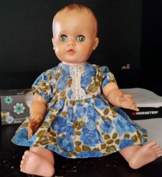 Doll is in great condition. No luck on find the name of this doll. Only markings on it I have pictured. Believe it is a G. She has sleepy eyes that fuction perfectly. She is a drink and wet doll. Molded hair. Plastic type body.