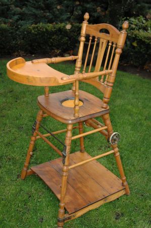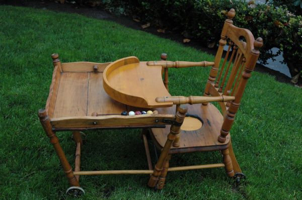 High chair that unfolds into a table with wheels. Sliding ball "toy" on table.