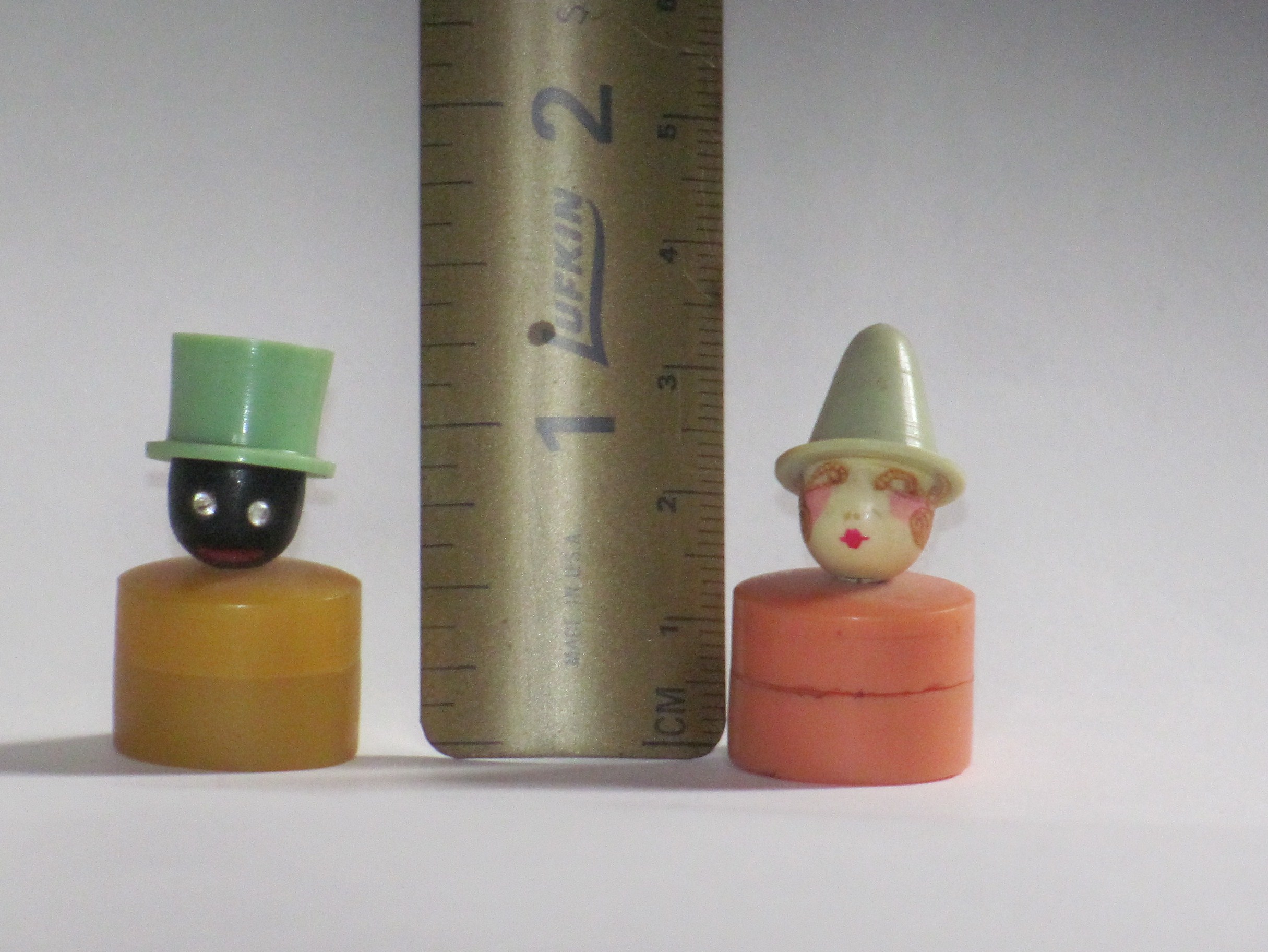 Small plastic or bakelite heads. Screw open. "France" on bottom. 1 1/2 inches high. I have been told these might be rouge pots for a lady's vanity table from the 1920s or 1930s.