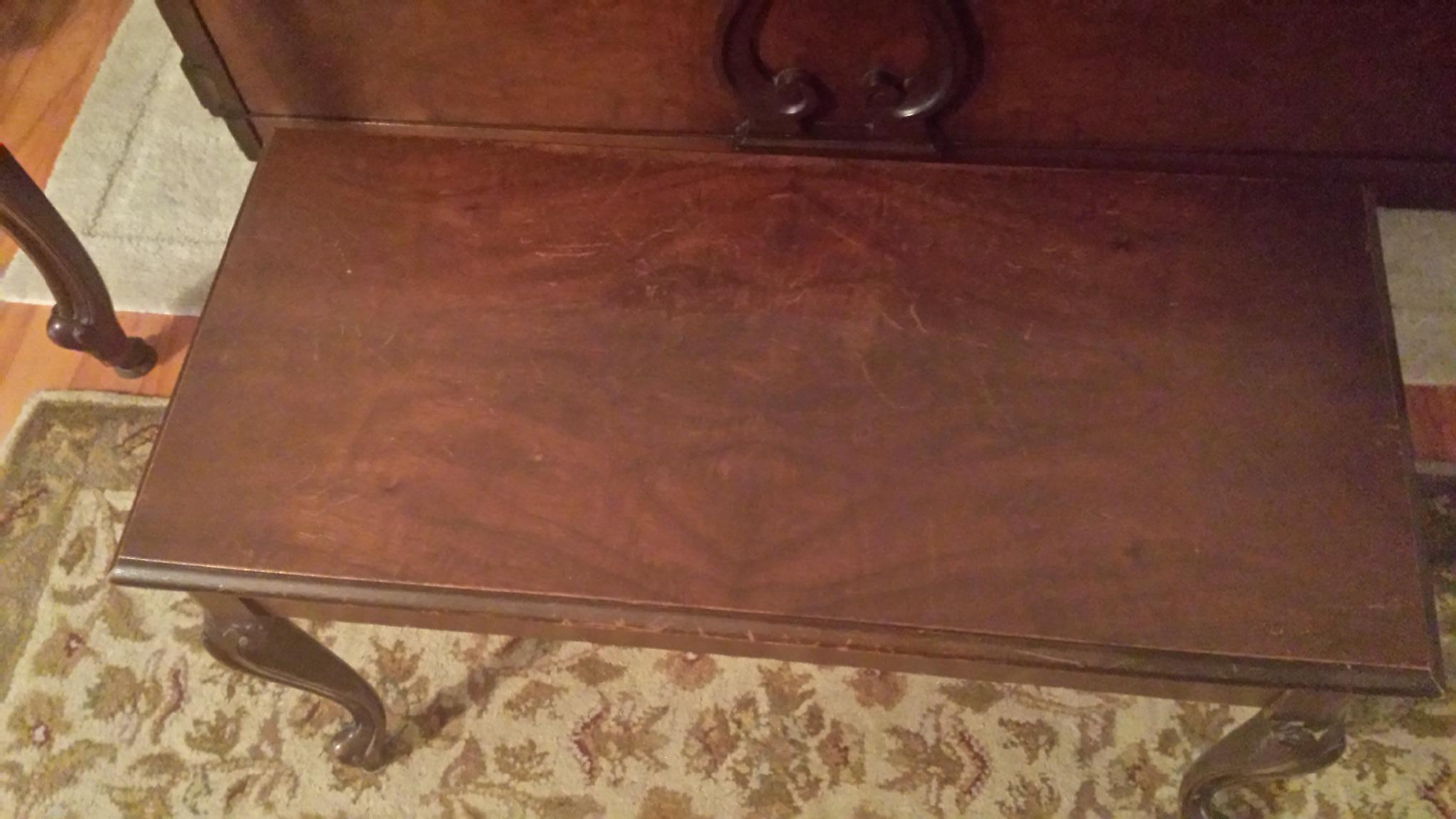 Bench is 30"L x 14"W x 18"H. Top is fairly scuffed up, but no true scratches or deep scratches at all.