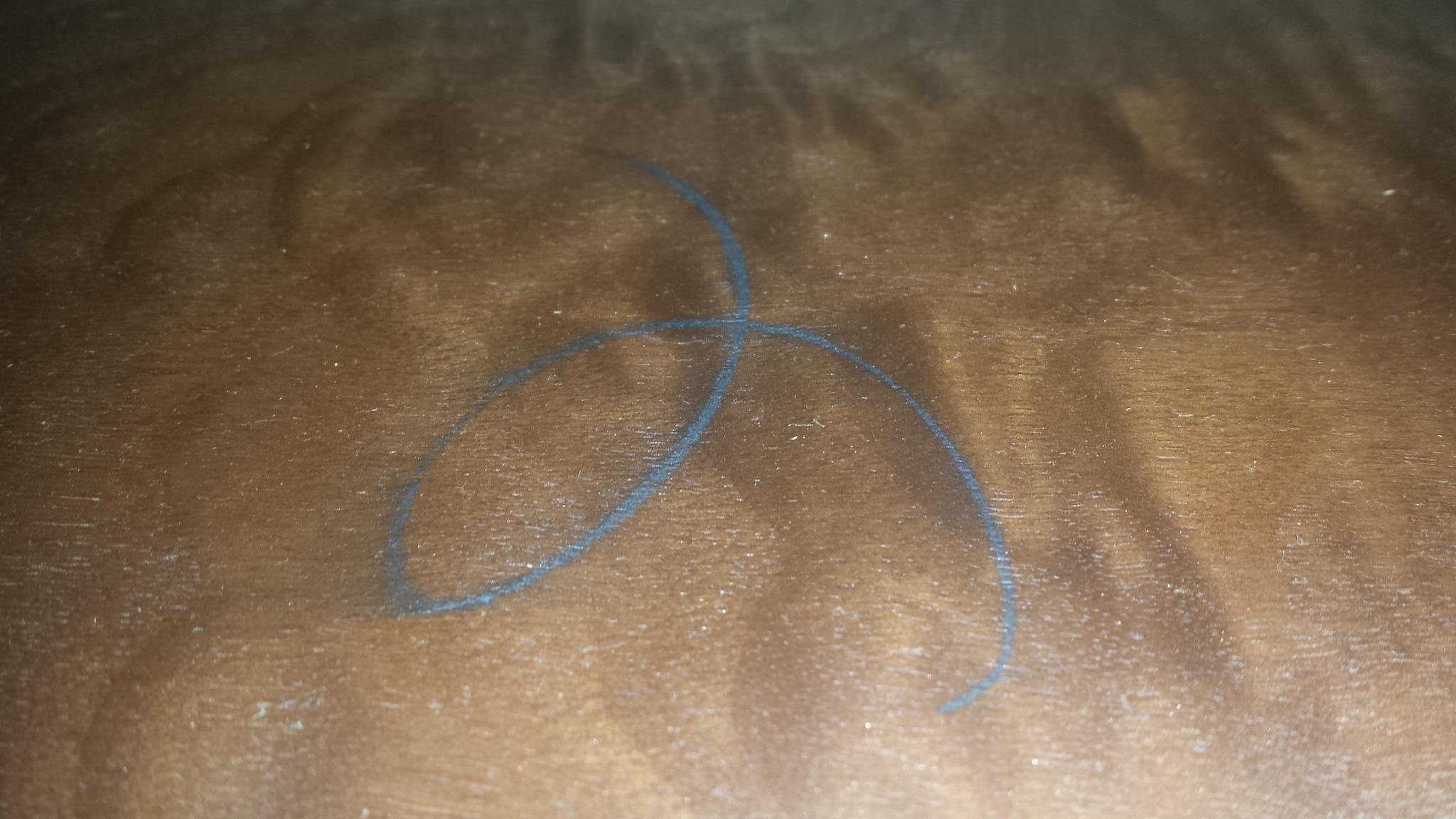 Hand drawn symbol under keyboard cover that looks similar to the Icthus (Christian Fish symbol). See attached photo.