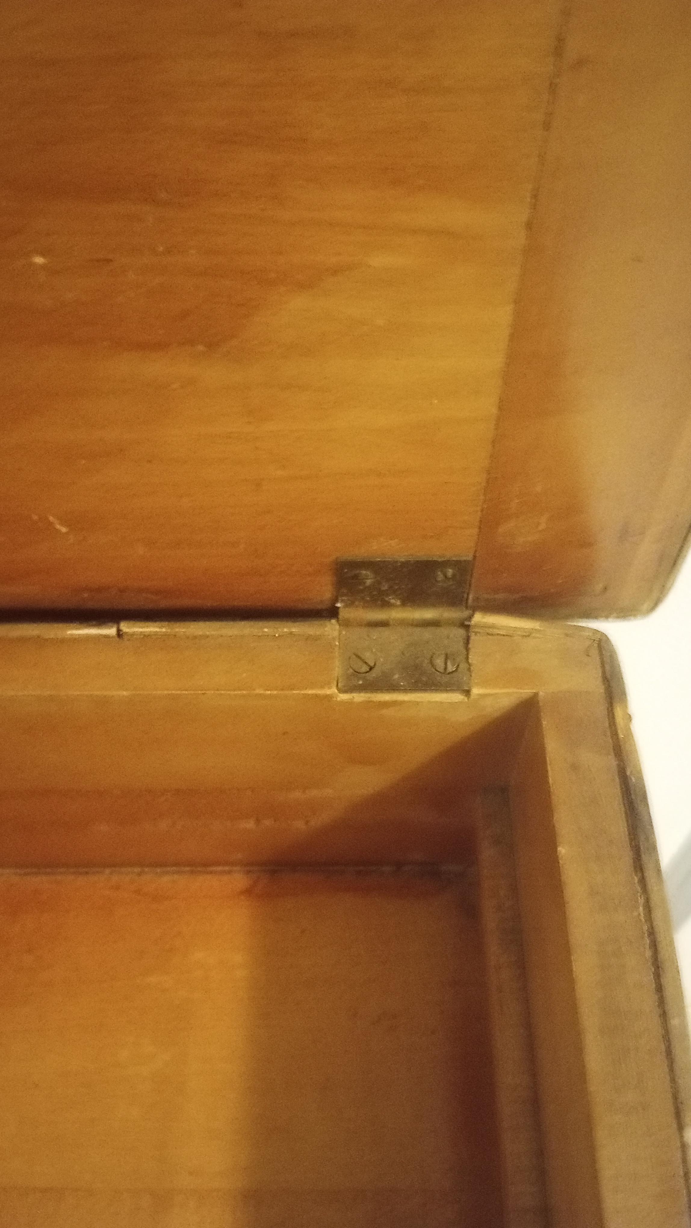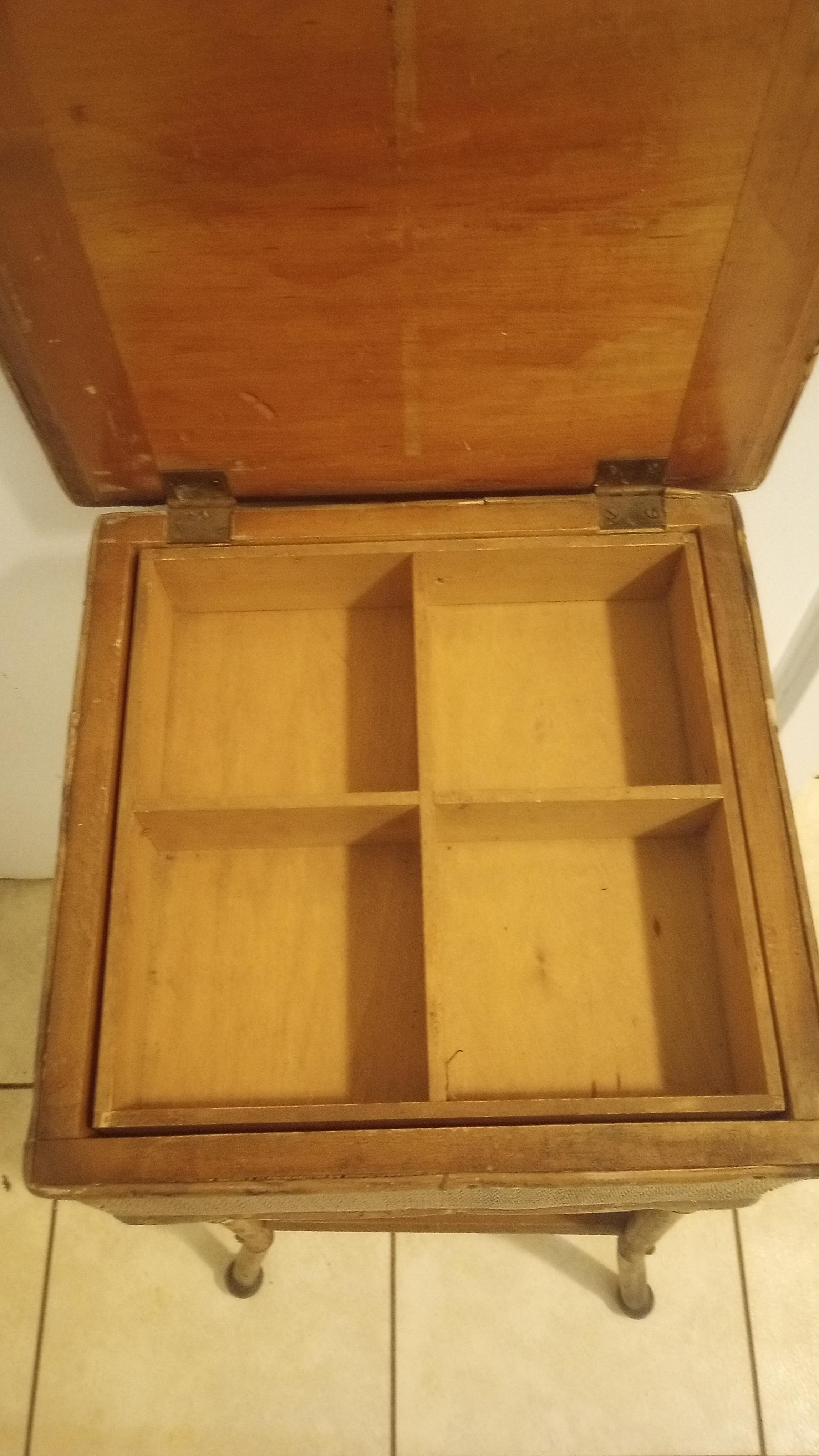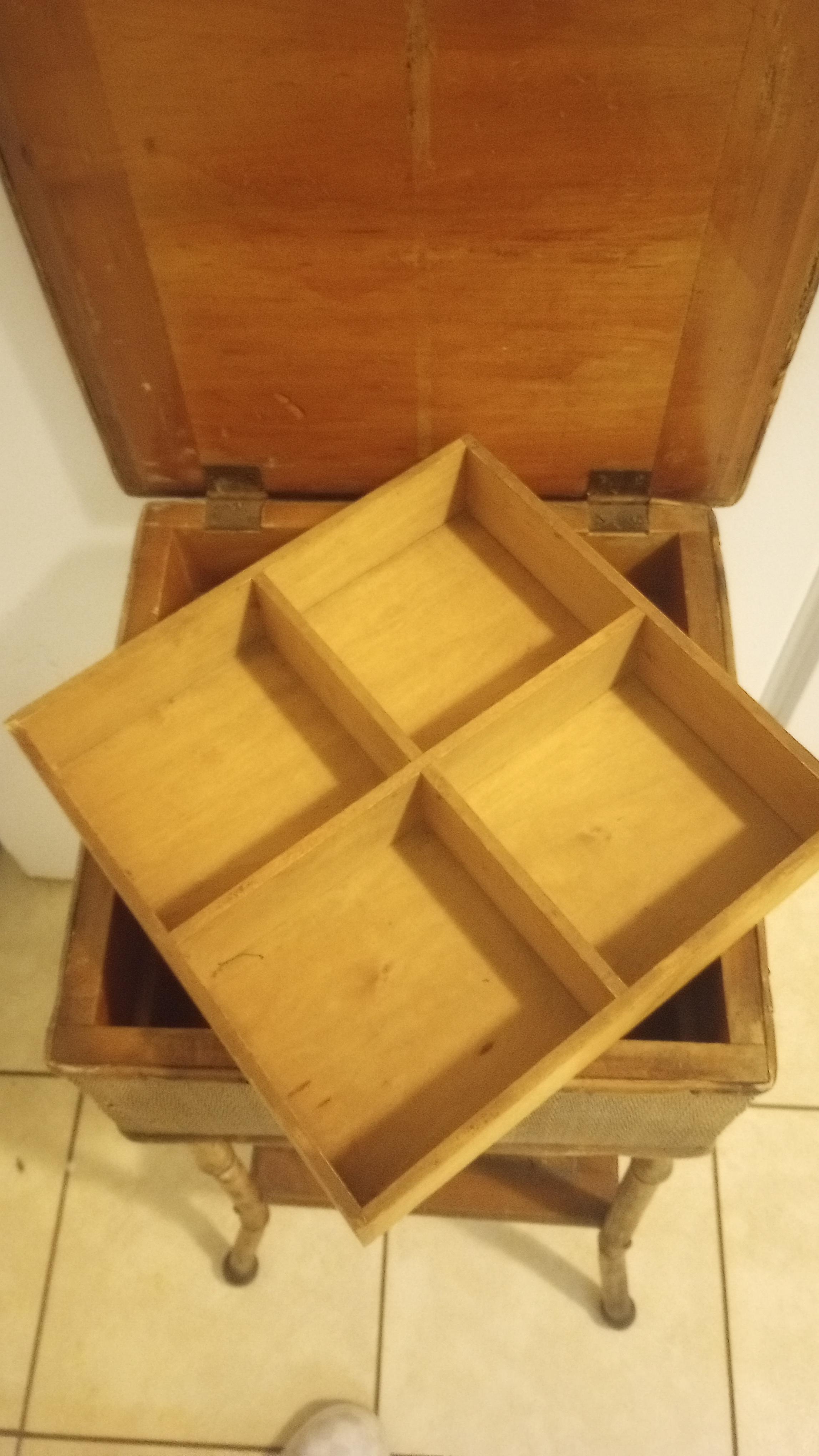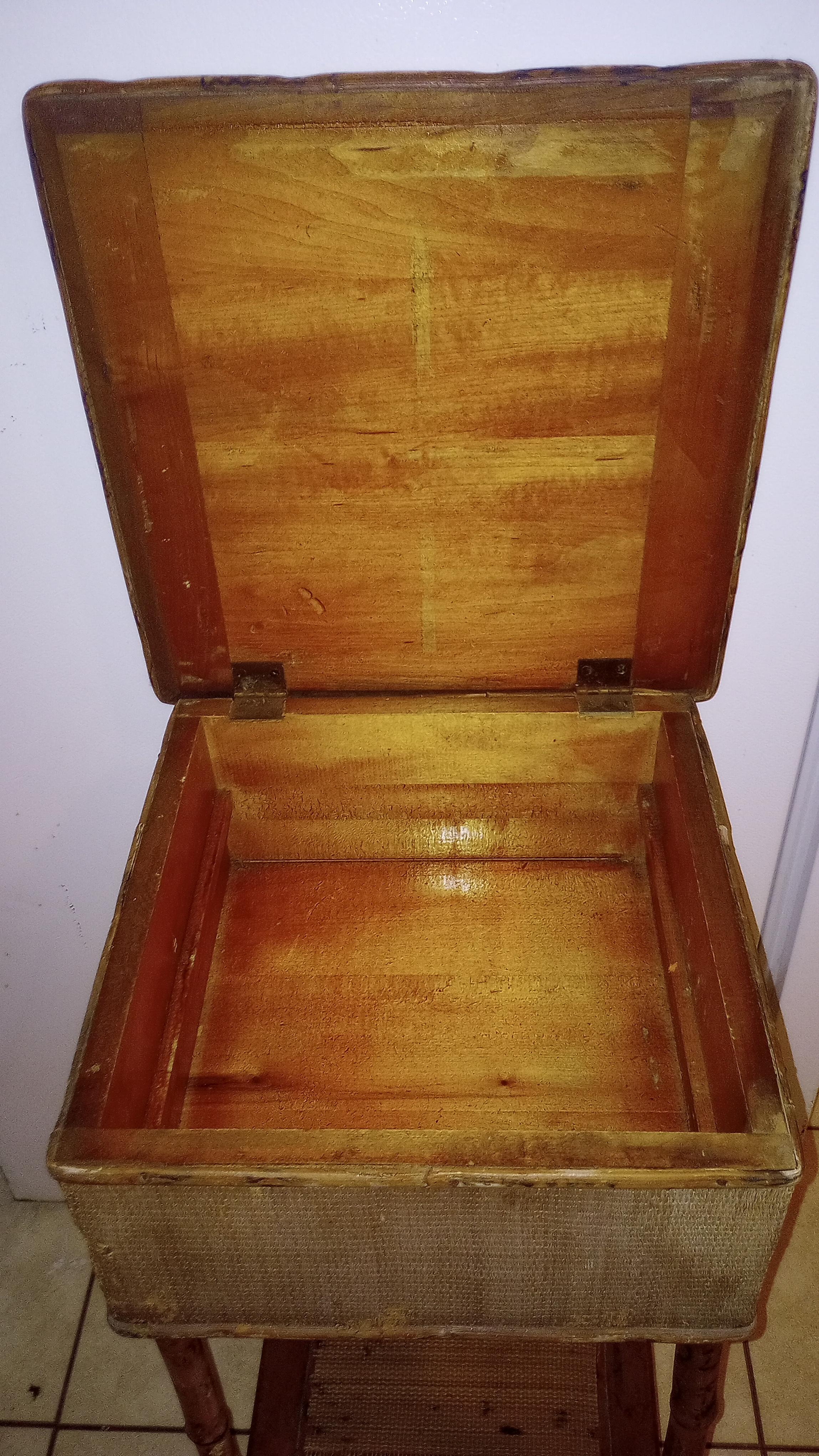 Description Antique bamboo and wood sewing table, with hinged lid and removable sectioned tray