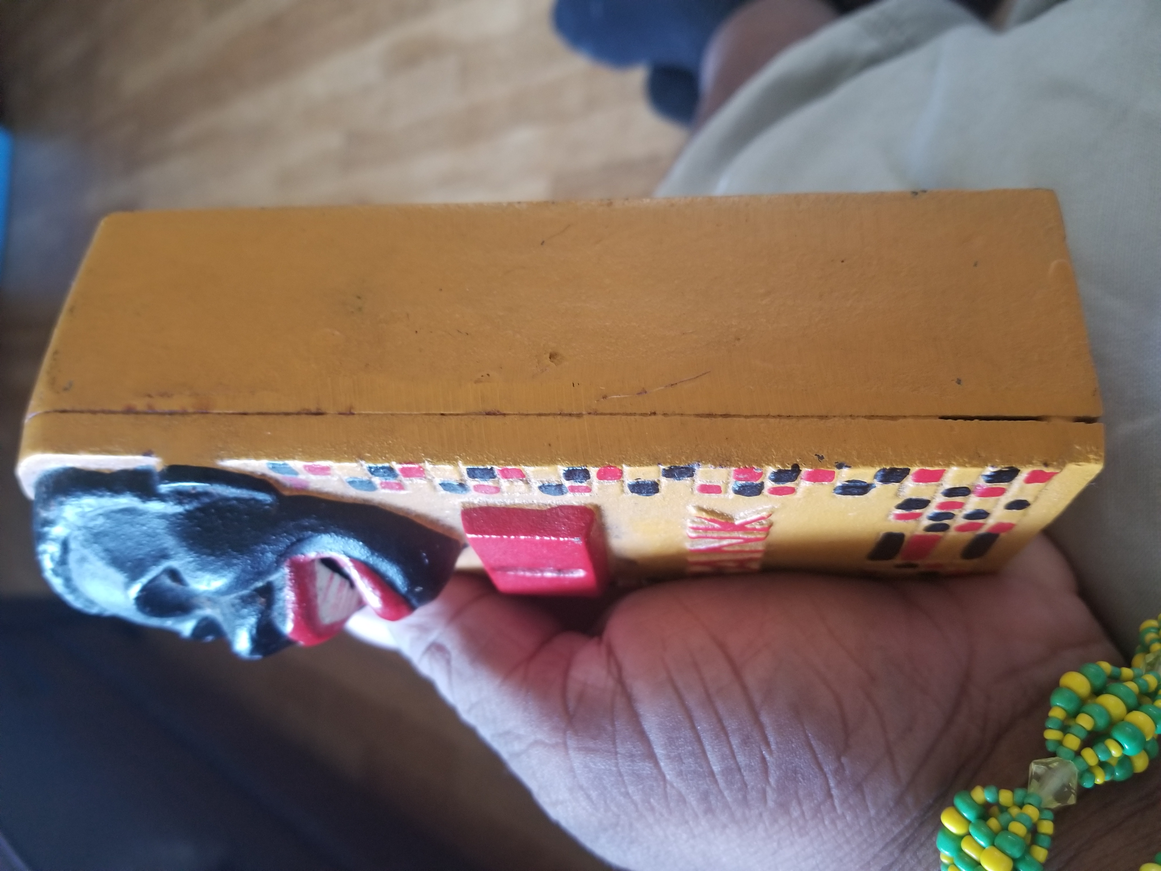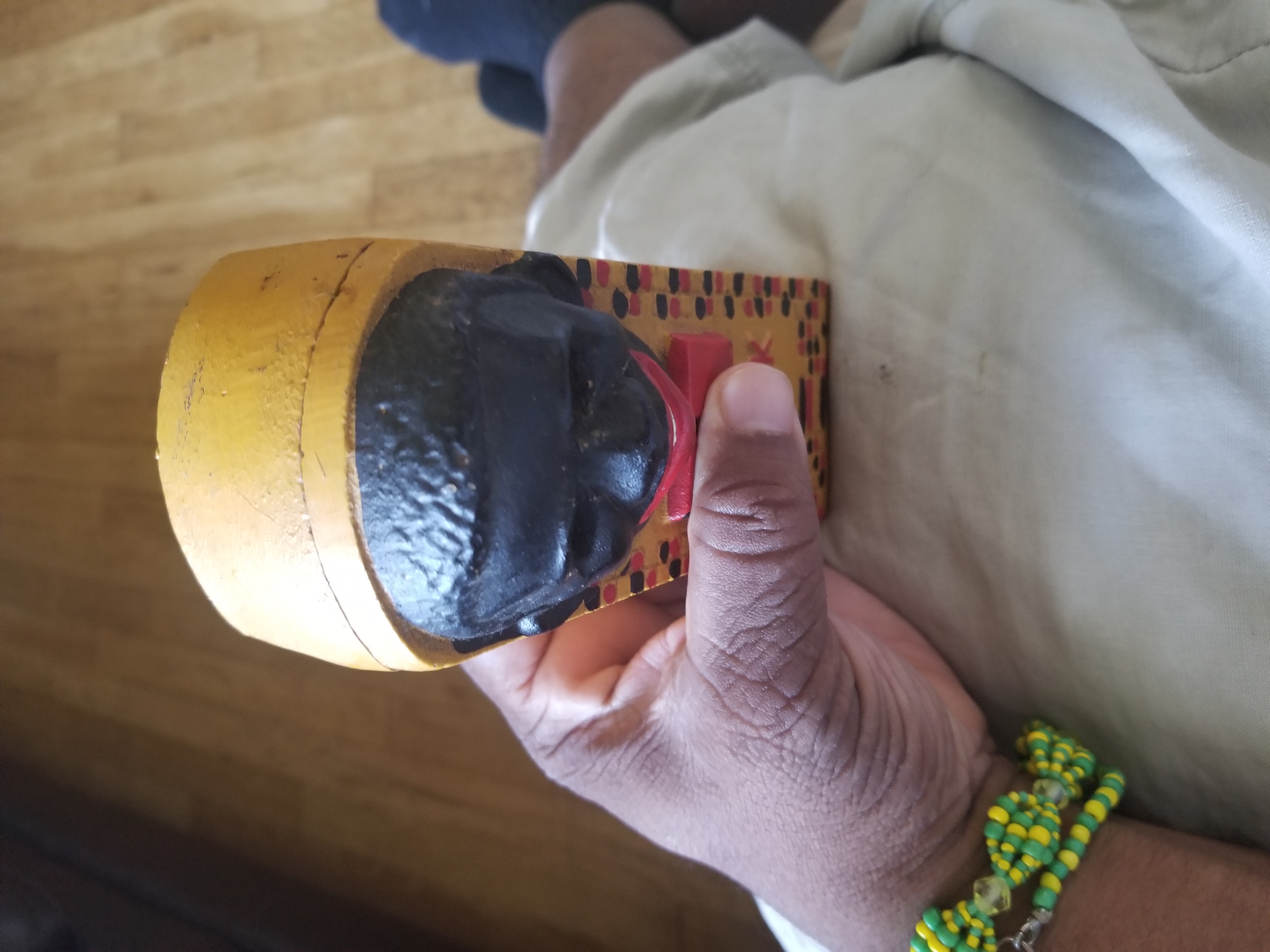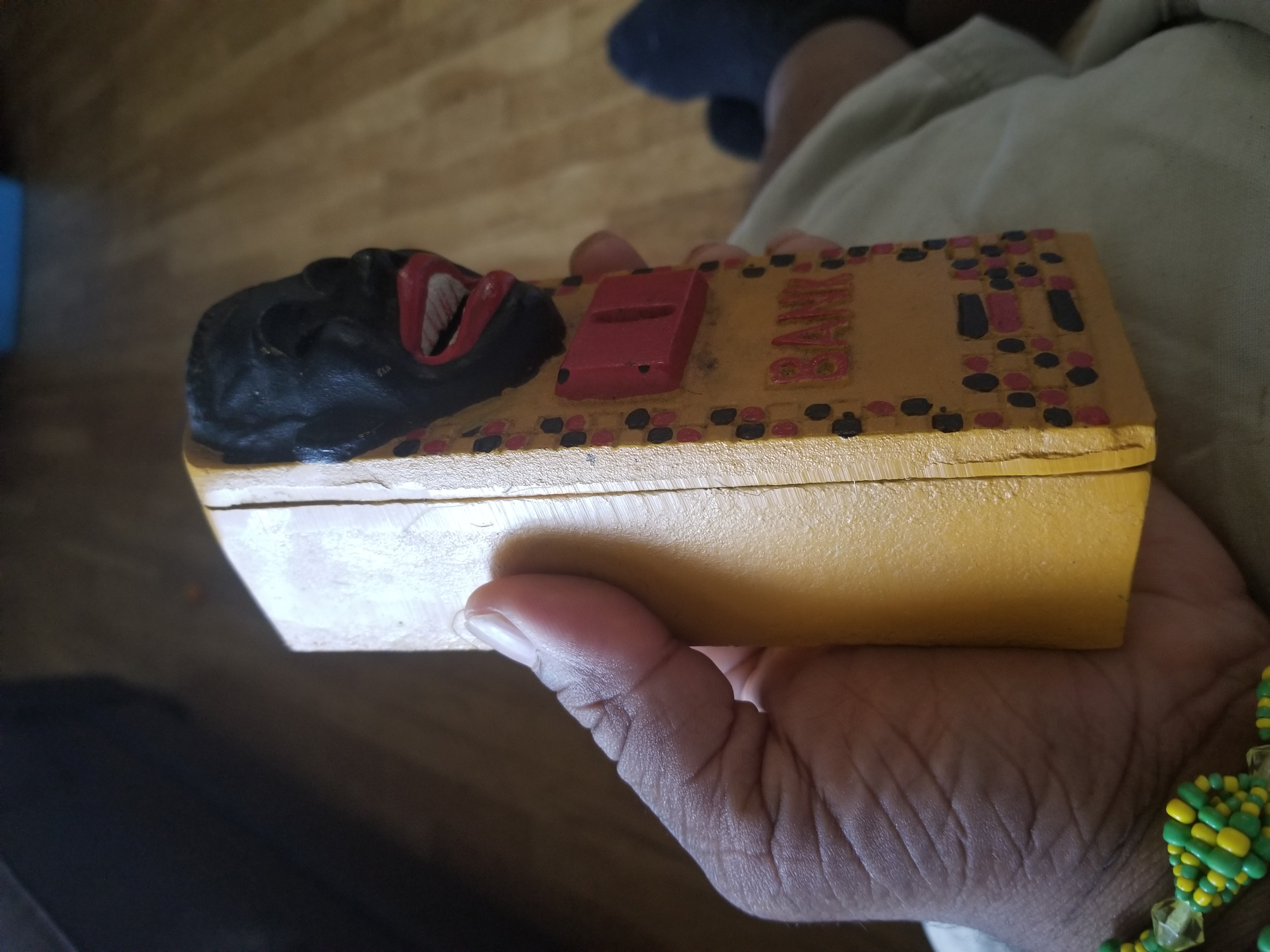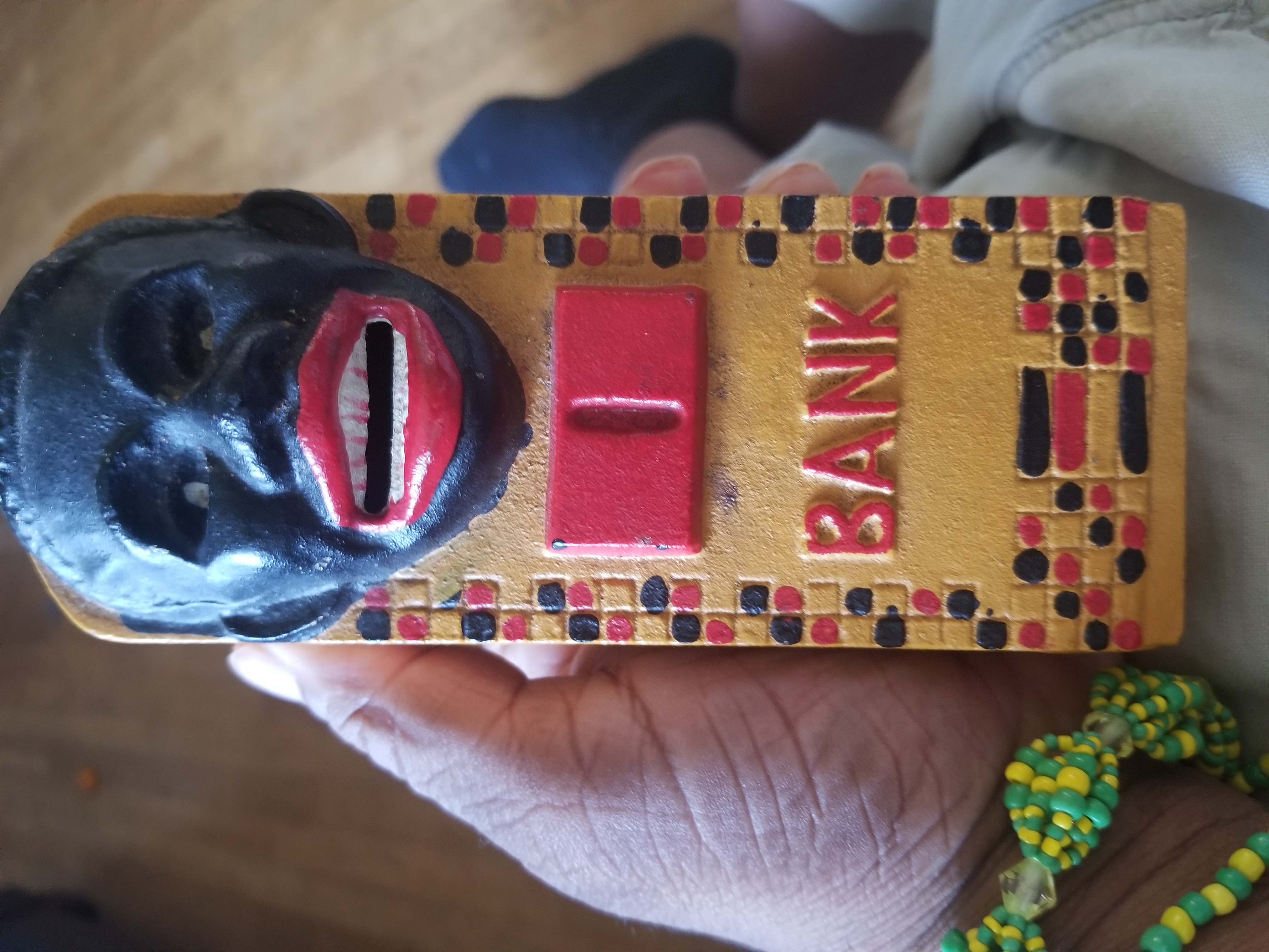 Yellow bank with a negro man face with mouth open as the place to put money in.