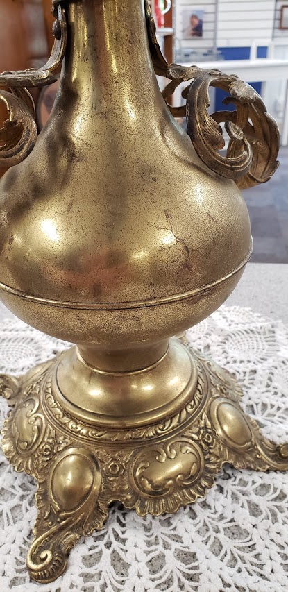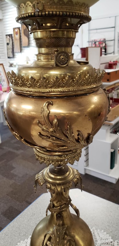 This item was donated to the thrift shop where I work and we are hoping someone might have information as to its worth. It is a kerosene lamp but does not have the original chimney. Any information at all would be helpful.