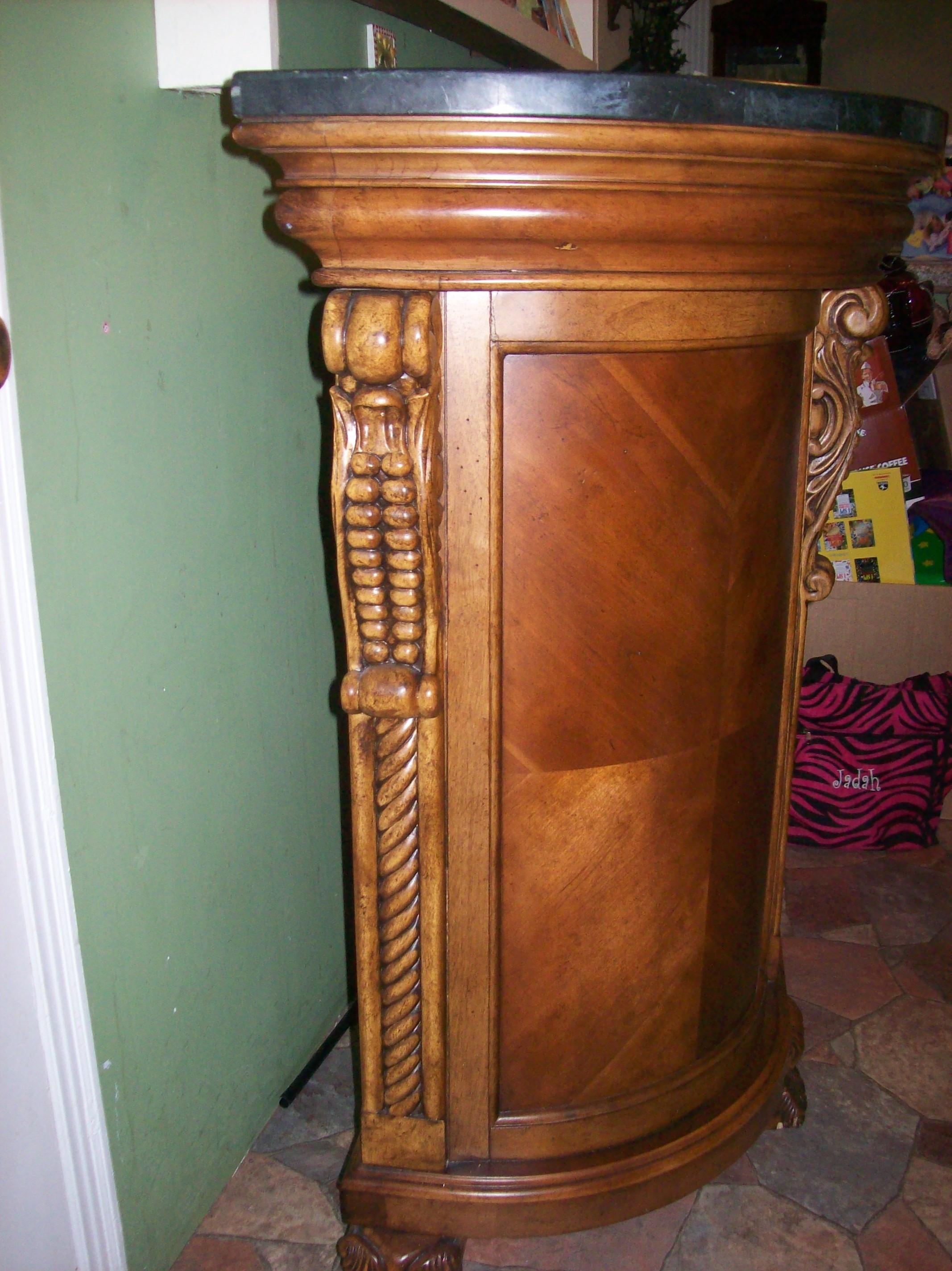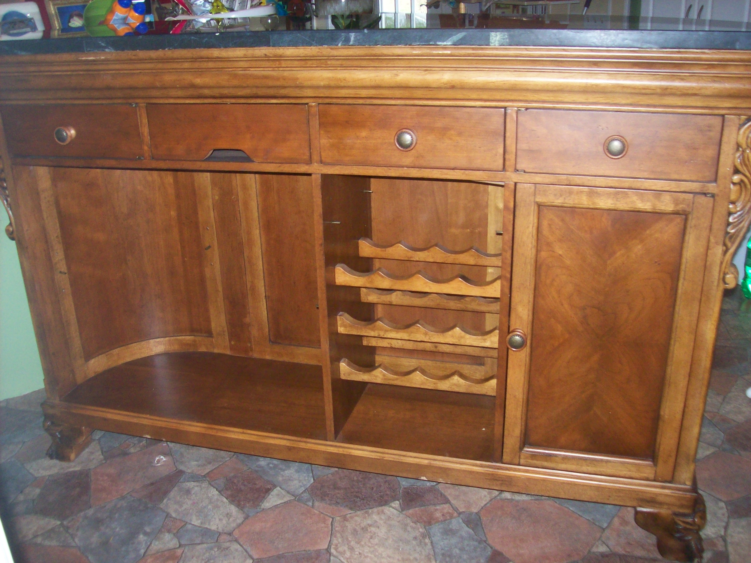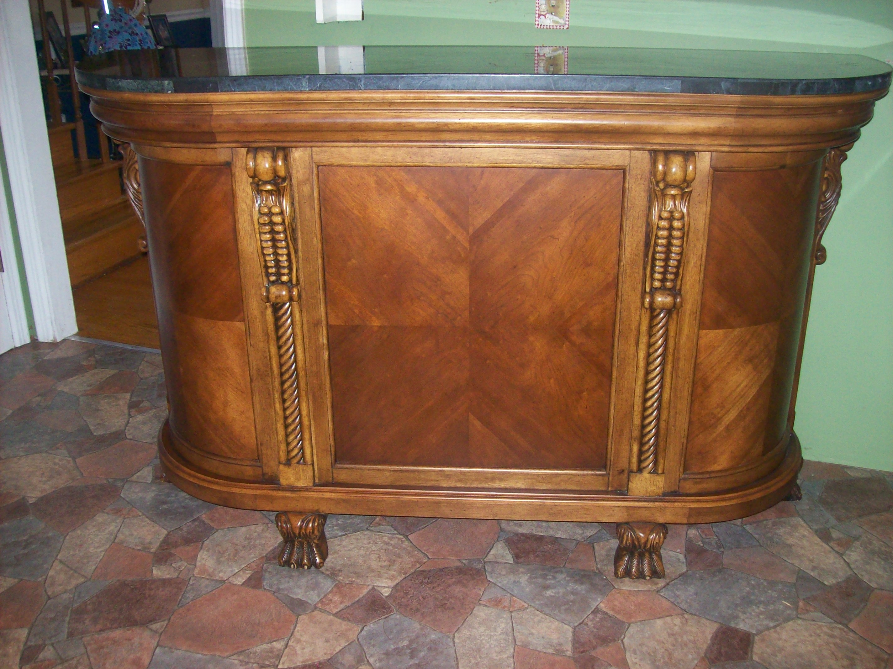 Wooden bar with a marble top that's grayish-black with a tint of dark green to it. It has claw feet and other beautiful detailing. The back side has a matching marble top cutting board/drawer, 1 regular drawer and 2 drawers (1 on each end) that open in a semi-circle, a wine rack that holds up to 12 bottles, a cabinet and an open area.