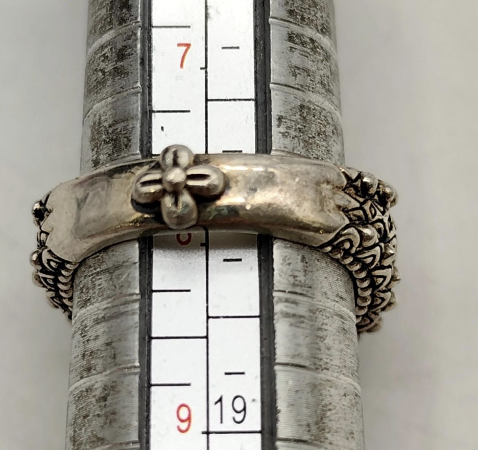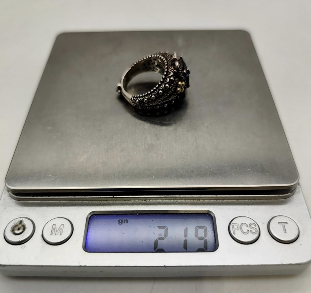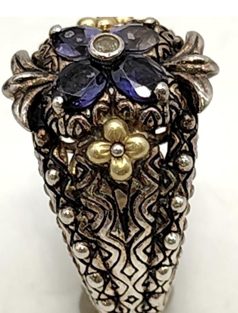 This is a designer ring by Barbara Bixby, known for her intricate, ornate jewelry blending oxidized sterling silver with 18K gold and semi-precious gemstones. The ring features:
