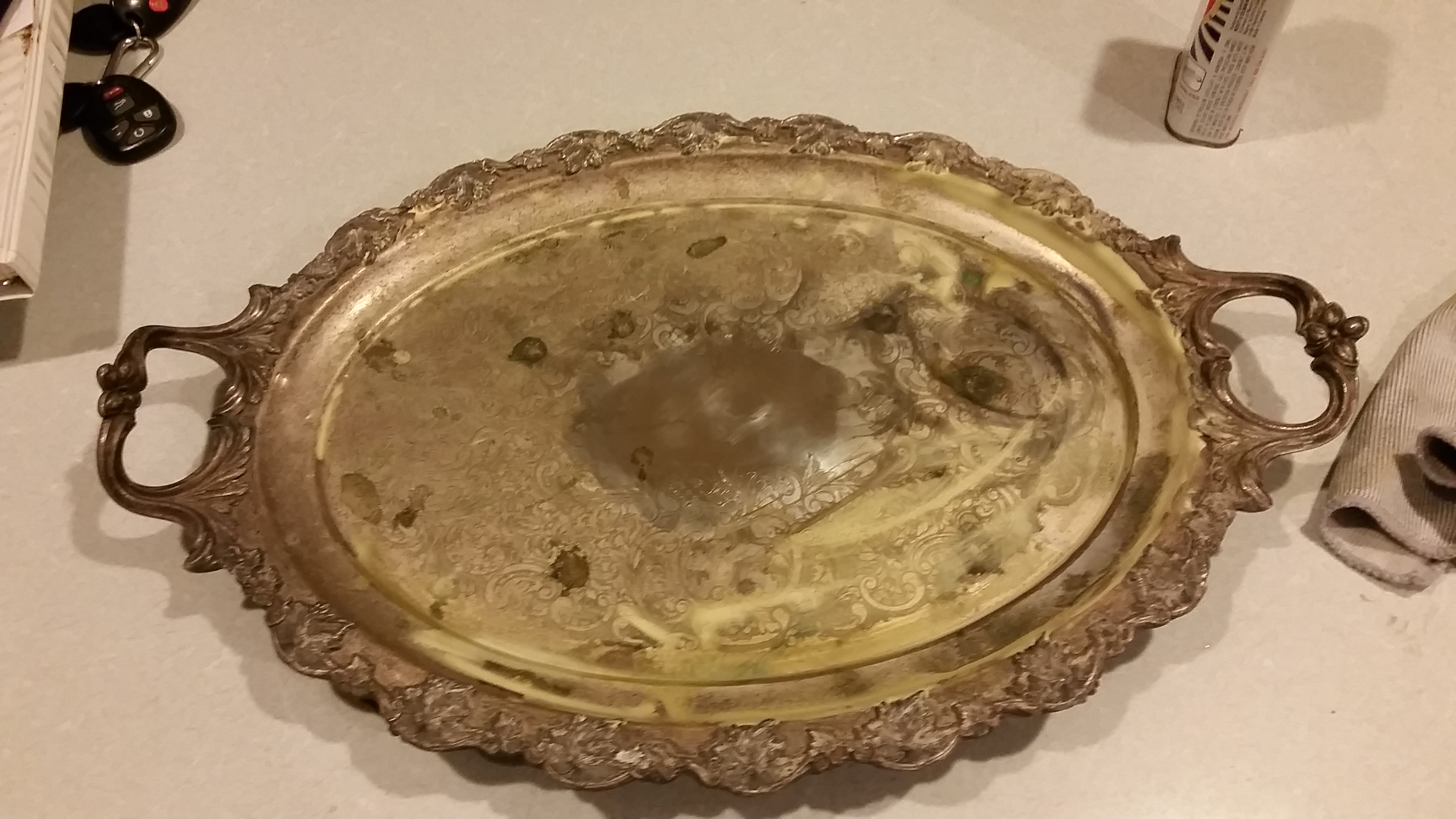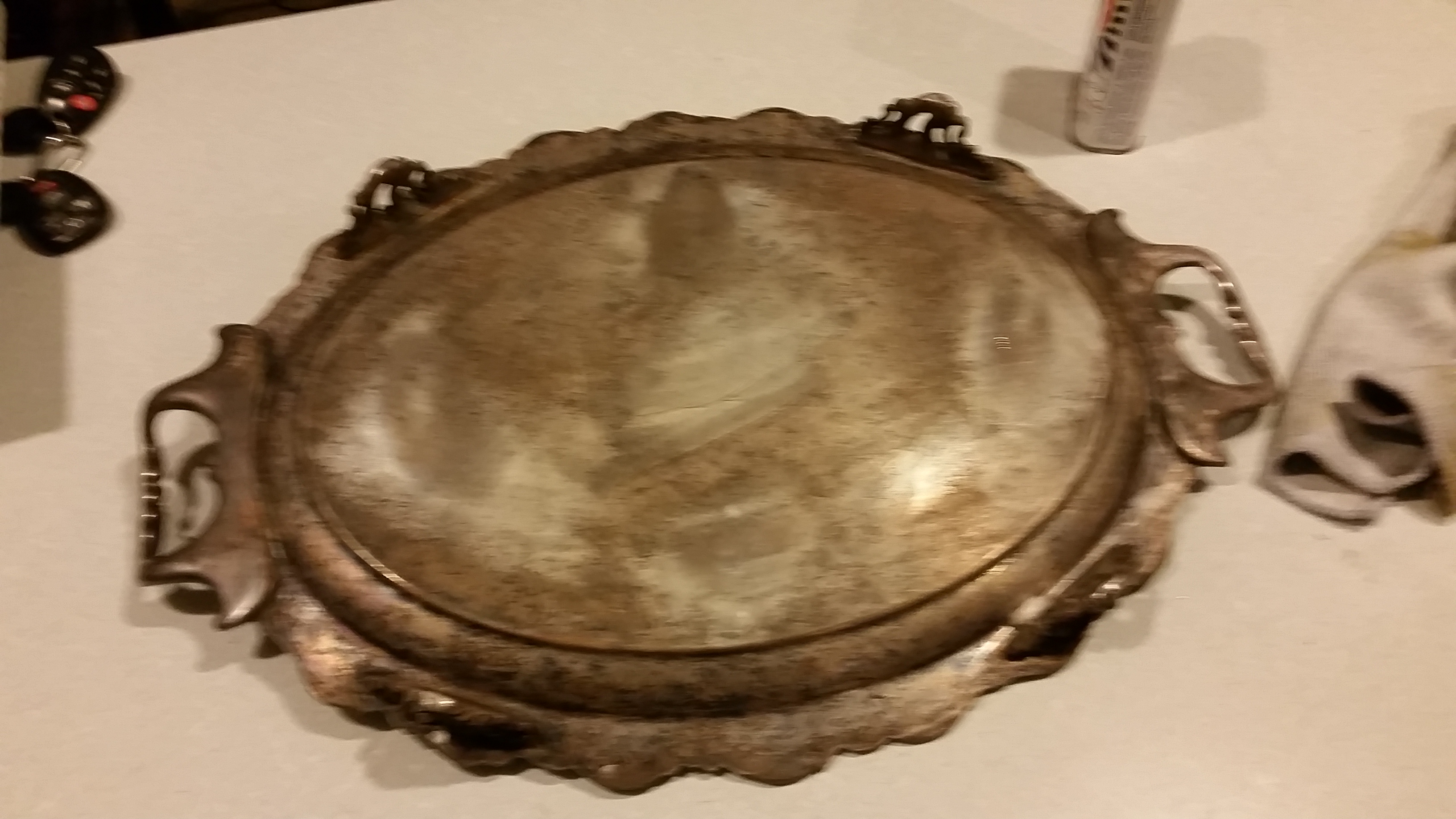 Grapevine design has the griffen/thistle crown/star cross star/BSCEP/"5645/16" stamped on back. Footed platter.
