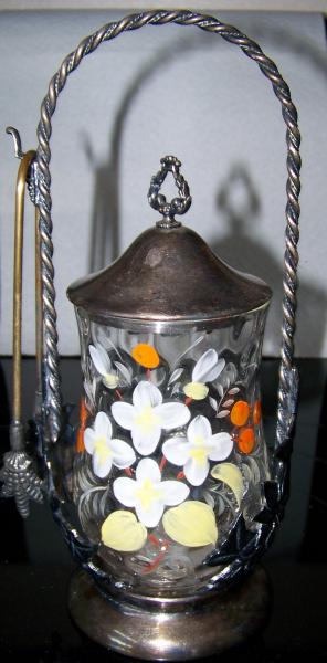 Not sure if the tongs are original to it they have brass looking handles, but maybe were not overlayed. The holer has leaves. The jar is dmpled with the floral design. It needs polishing.