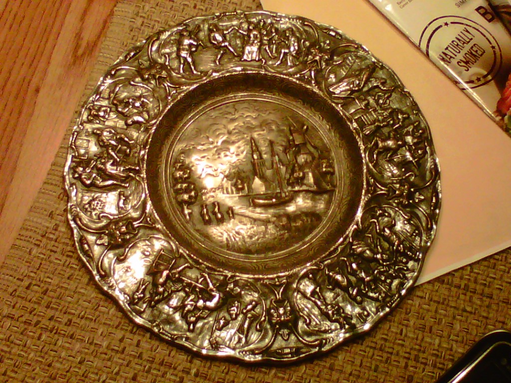 appears to be silver over copper with picture of several people walking by river with sailboat on it.windmill on other side of river with a building with what appears to be a steeple all in center.surrounding plate are 5 scenes with people danceing and partying.at the top outside ring inbetween the scenes is a mask like face with open mouth and a large apparent tongue protrudeing.