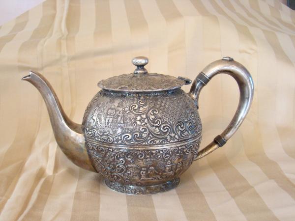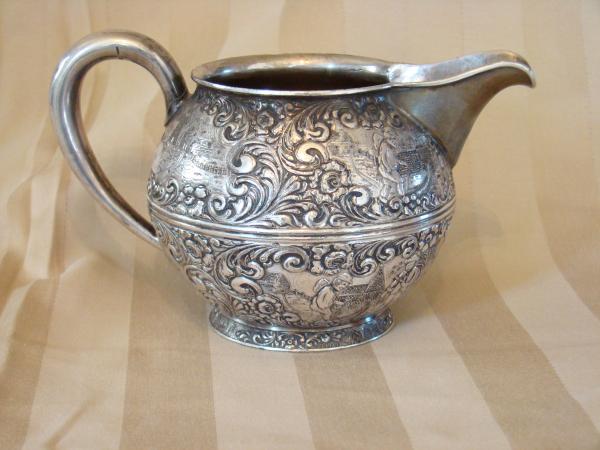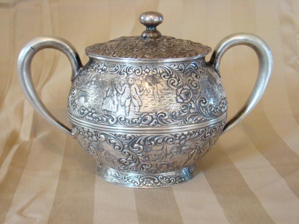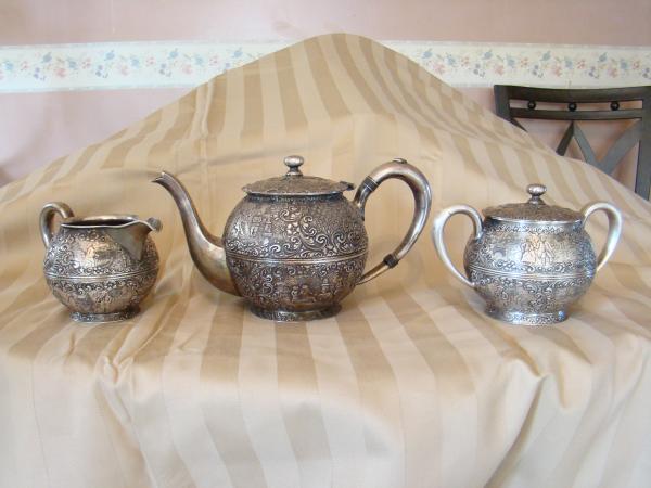 it is a silver 3 piece tea set from barbour s.p.co. with an item number #3177, items are a tea pot, sugar bowl, and creamer container with pictures of late 1800, early 1900 country living