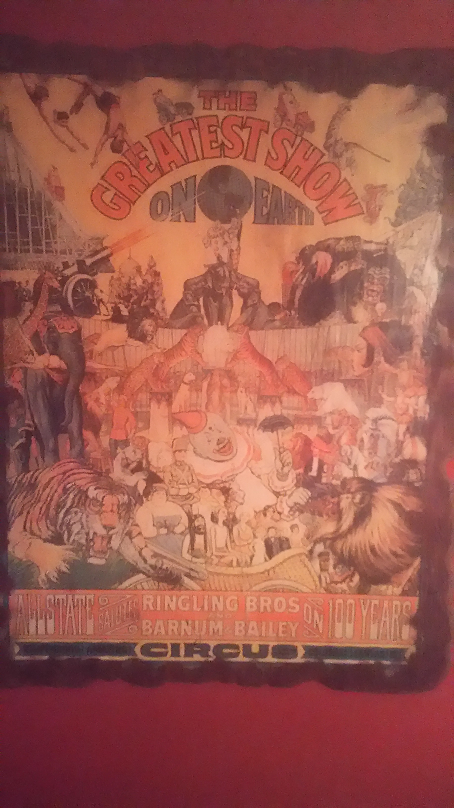 Ringling brothers and Barnum & bailey celebrate 100 years. Mounted on wooden plaque, which decreases value. But if anyone knows what its worth or at least its history I'd love to know!