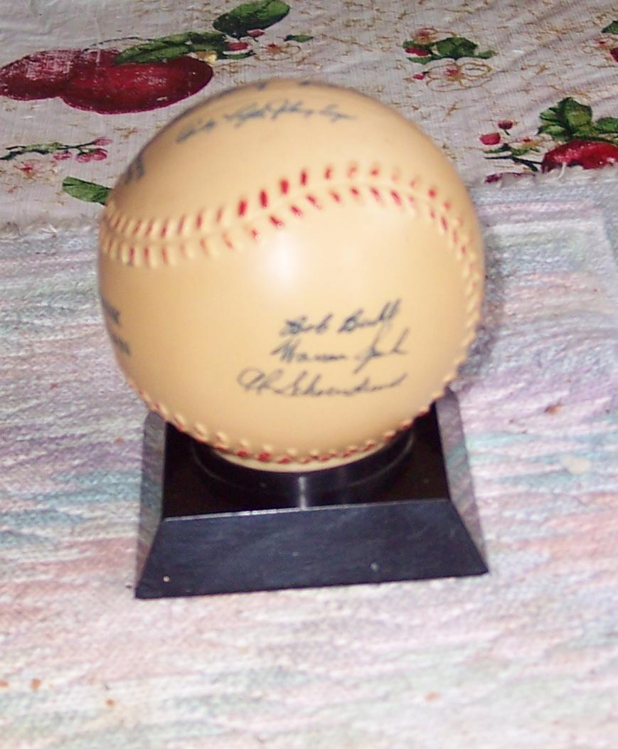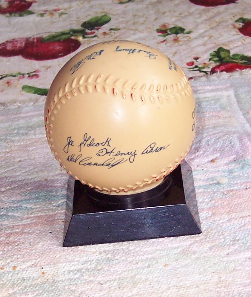 advertising still bank that is shaped like a baseball up on a little stand. The ball is covered in simulated autographs and is made of plastic. On the front it reads 1957 World Champs Milwaukee Braves - Citizens Bank of Sheboygan . The piece measures about 3½" tall