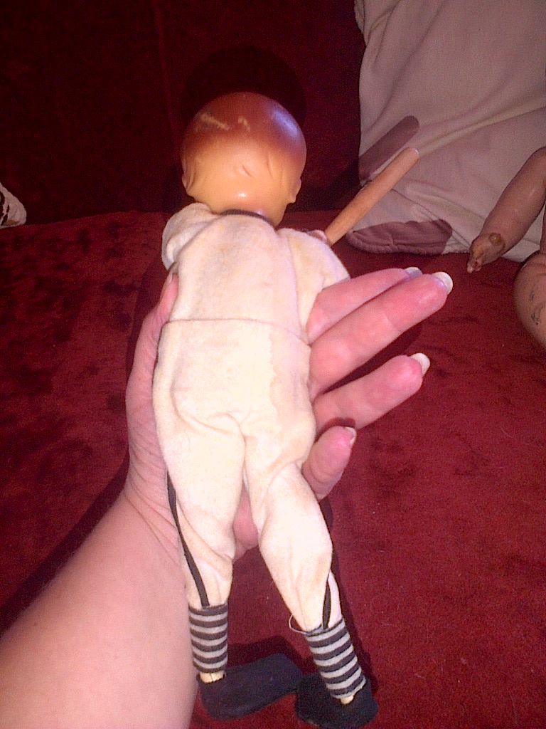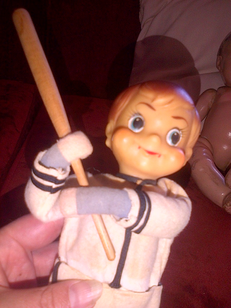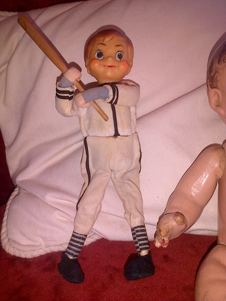 I recieved a doll form my aunt when she went visiting out of country. I am not sure what country this doll comes from, but I suspect it comes from America as it is a baseball doll. It is made of material and soft plastic and it has a wooden baseball bat in his hands. he is holding the bat in a swinging position. I would just like to know what I am looking at price wise.