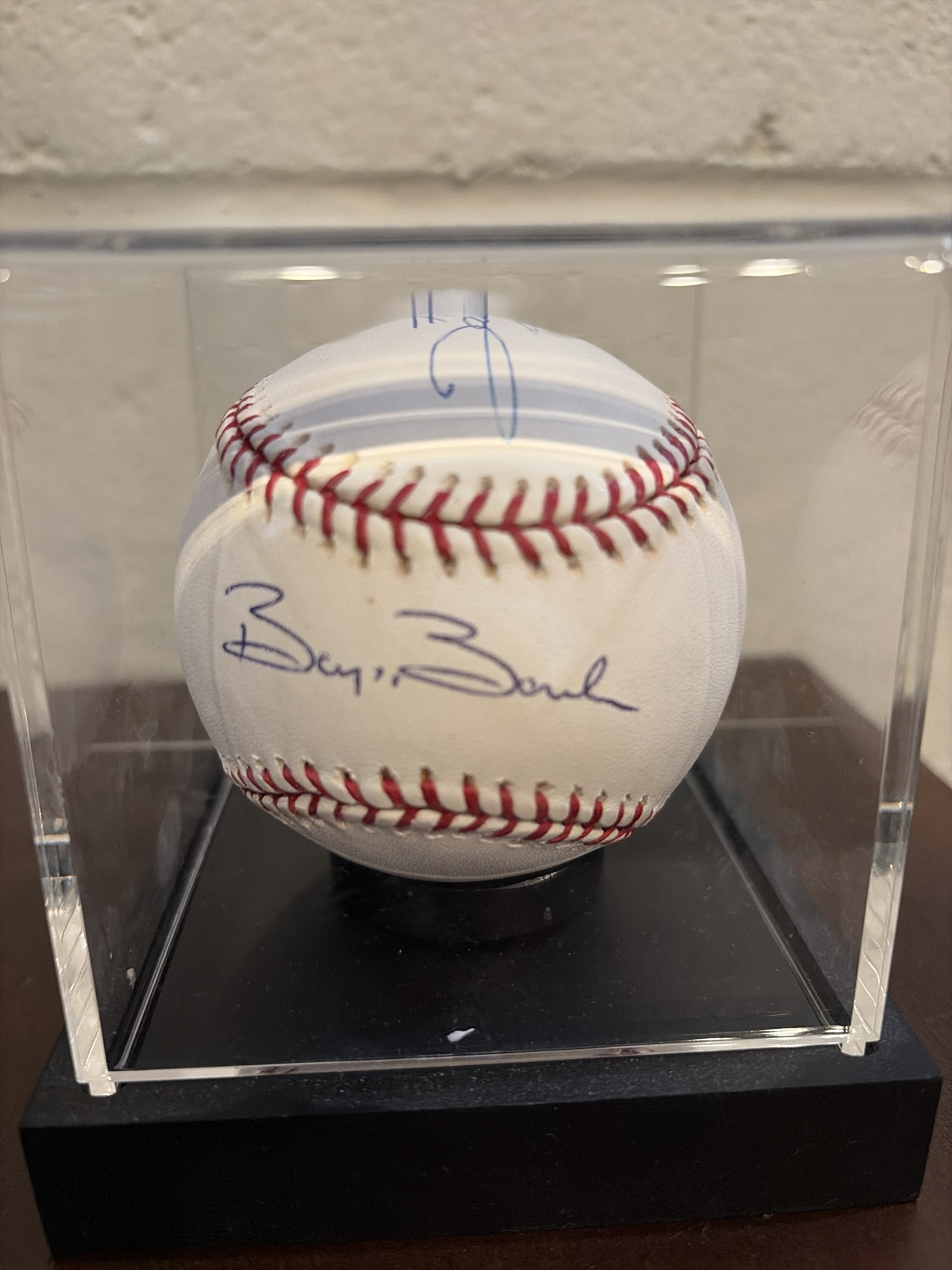 Signed Baseball by Barry Bonds and Orlando Hernandez. Made by Not applicable. Dating to Not specified. Materials: Synthetic leather, rubber. Estimated value: $200 – $400. Condition: Excellent. The market for signed sports memorabilia is strong, with rising prices for authenticated items.