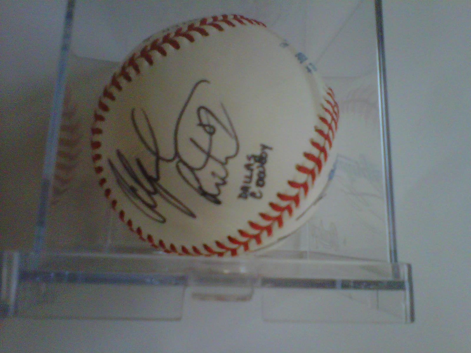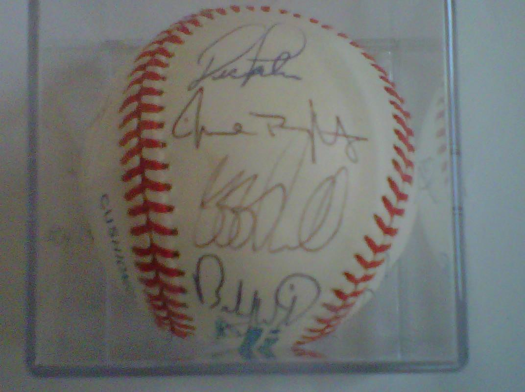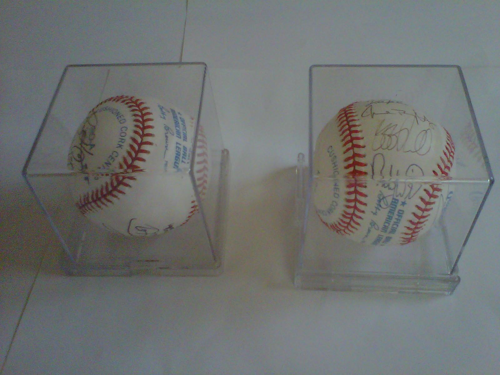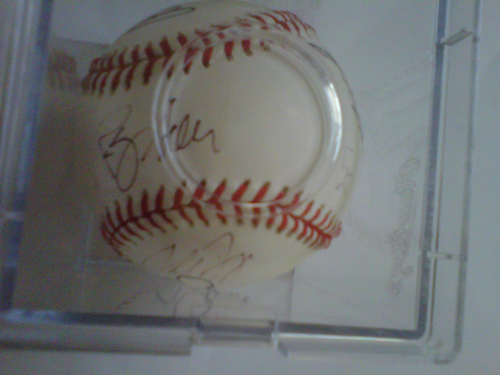 This is a baseball encased in a plastic presentation case signe by multiple players.