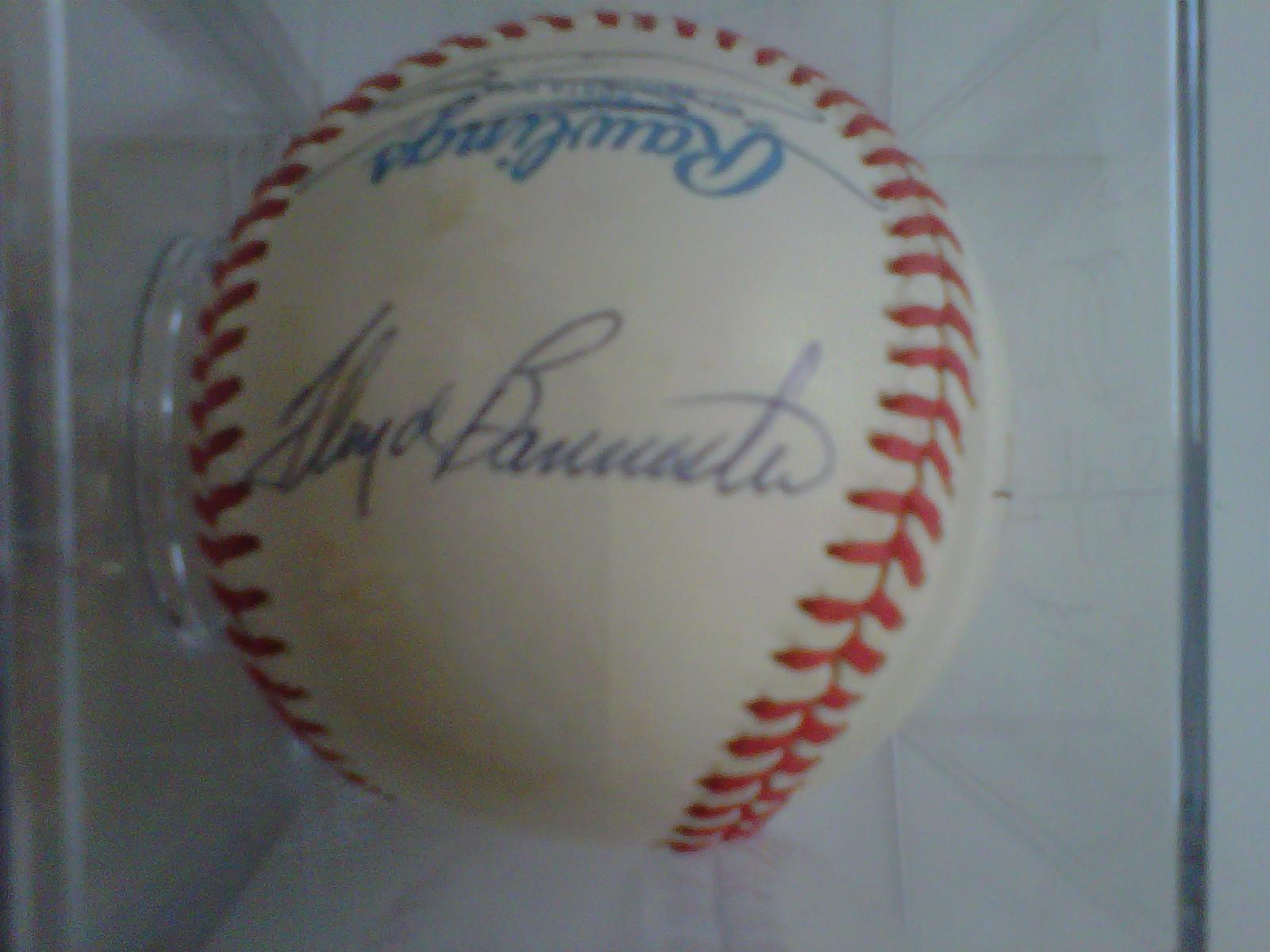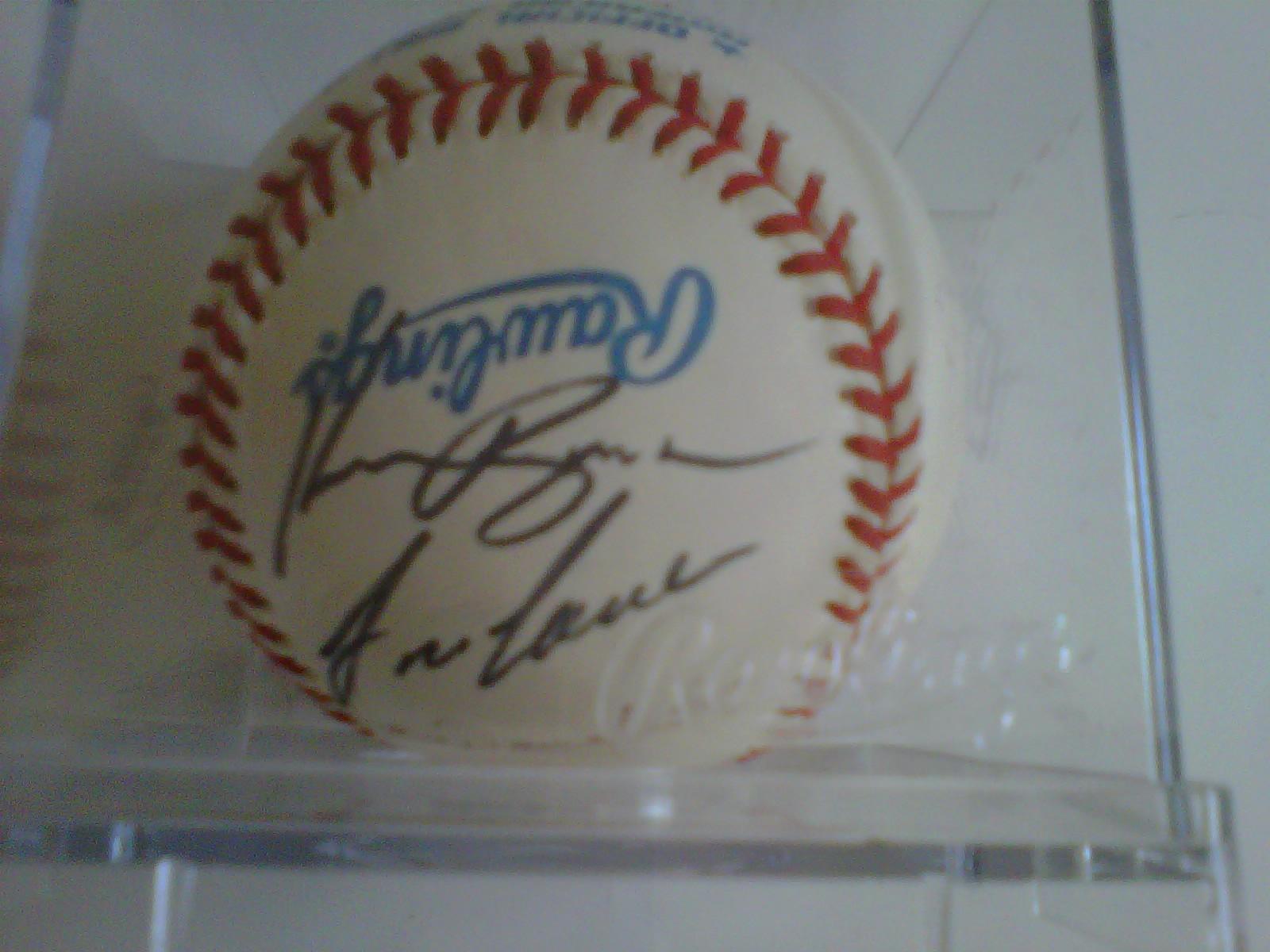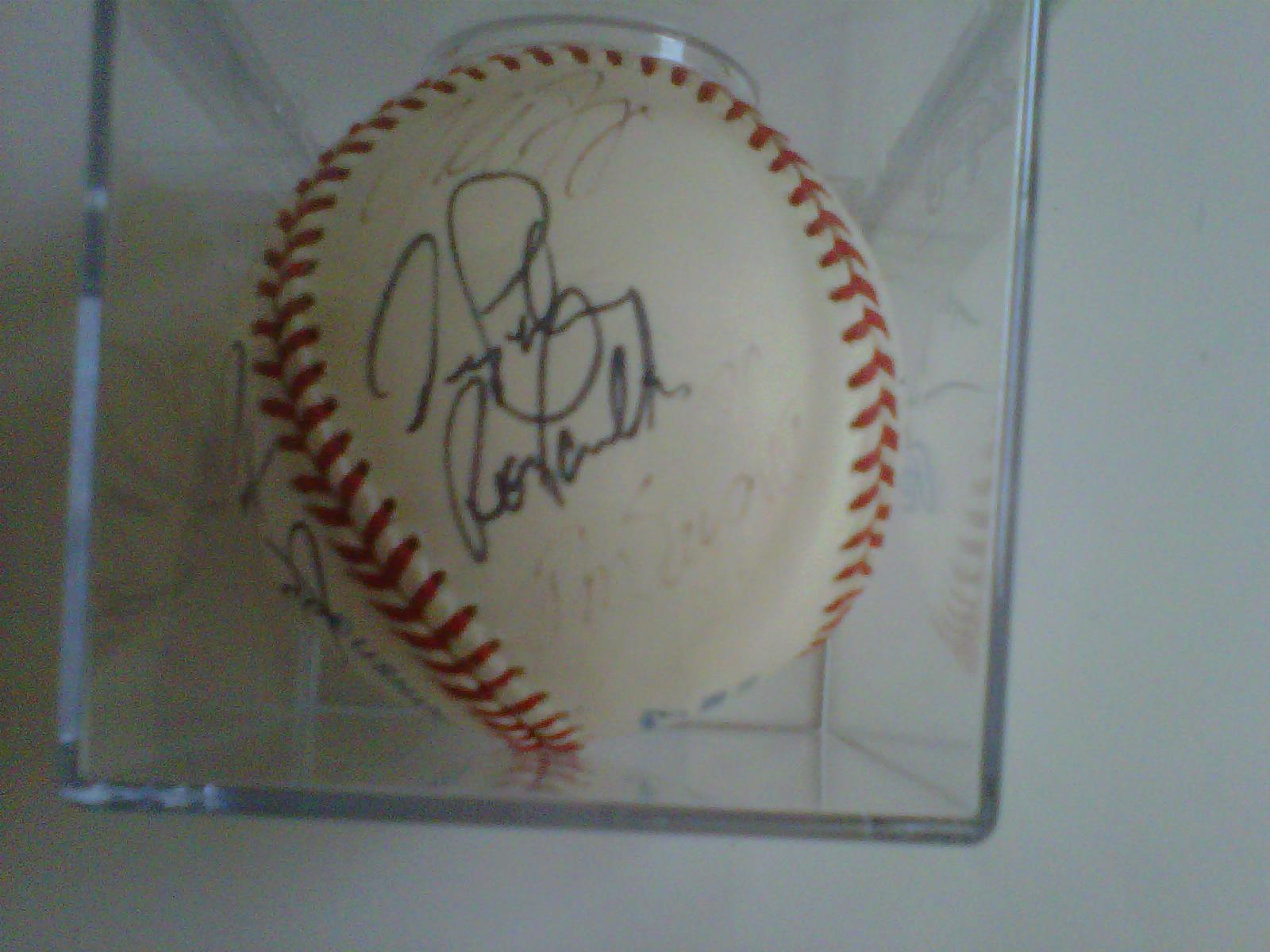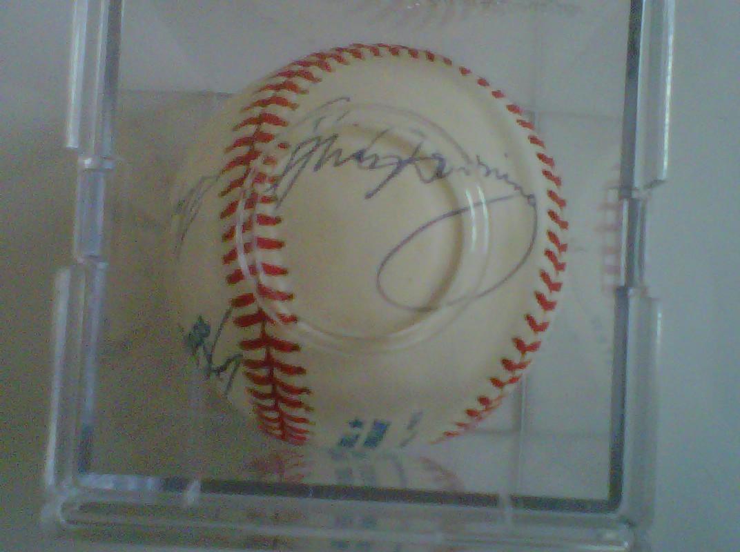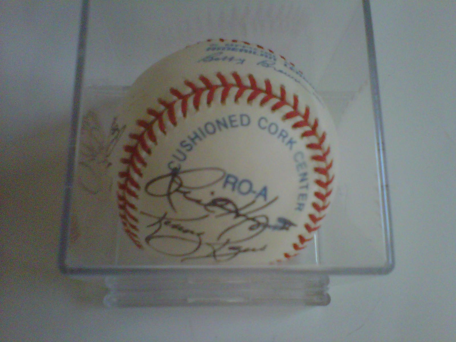This is a baseball encased in a plastic presentation case signe by multiple players.