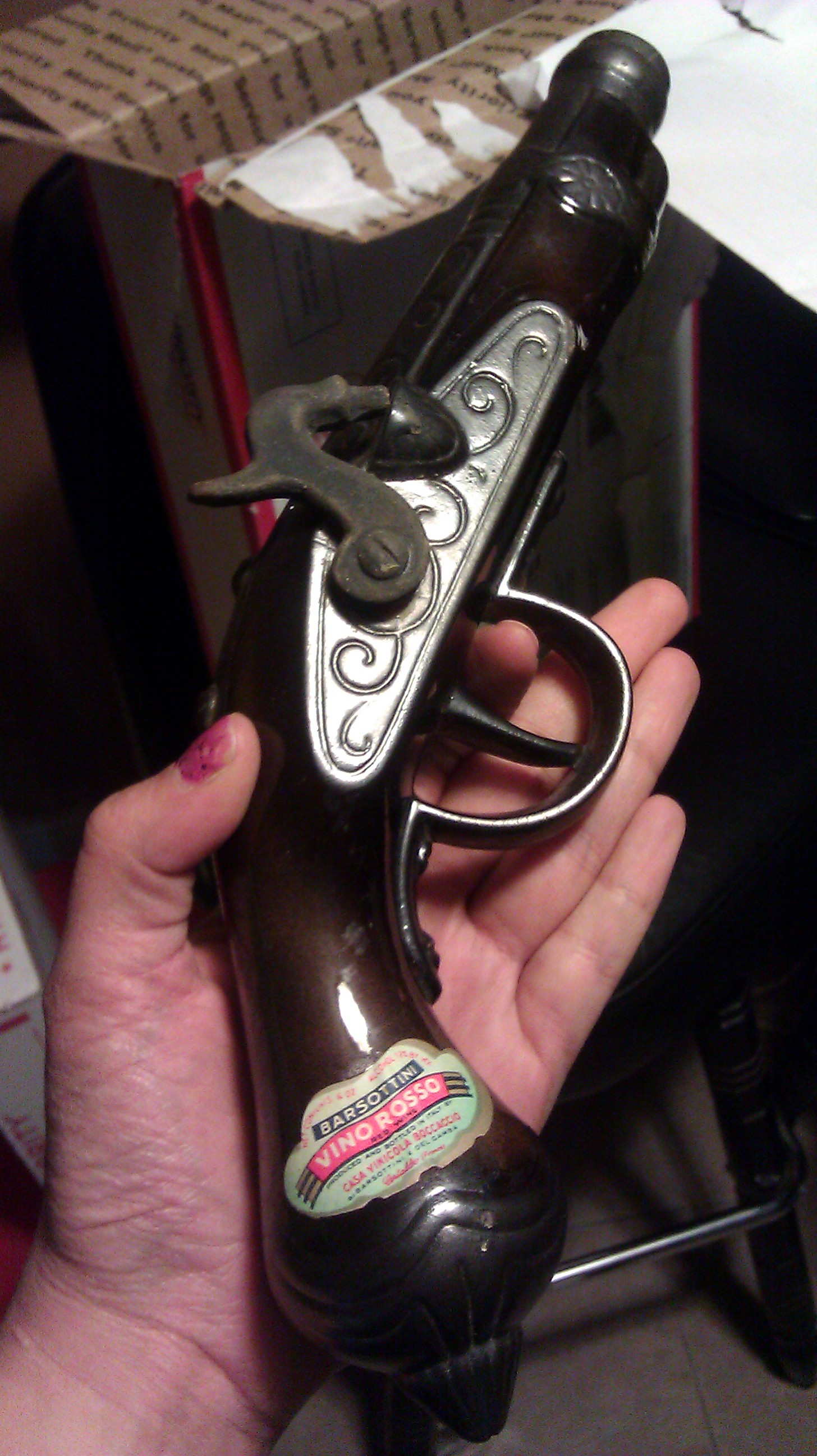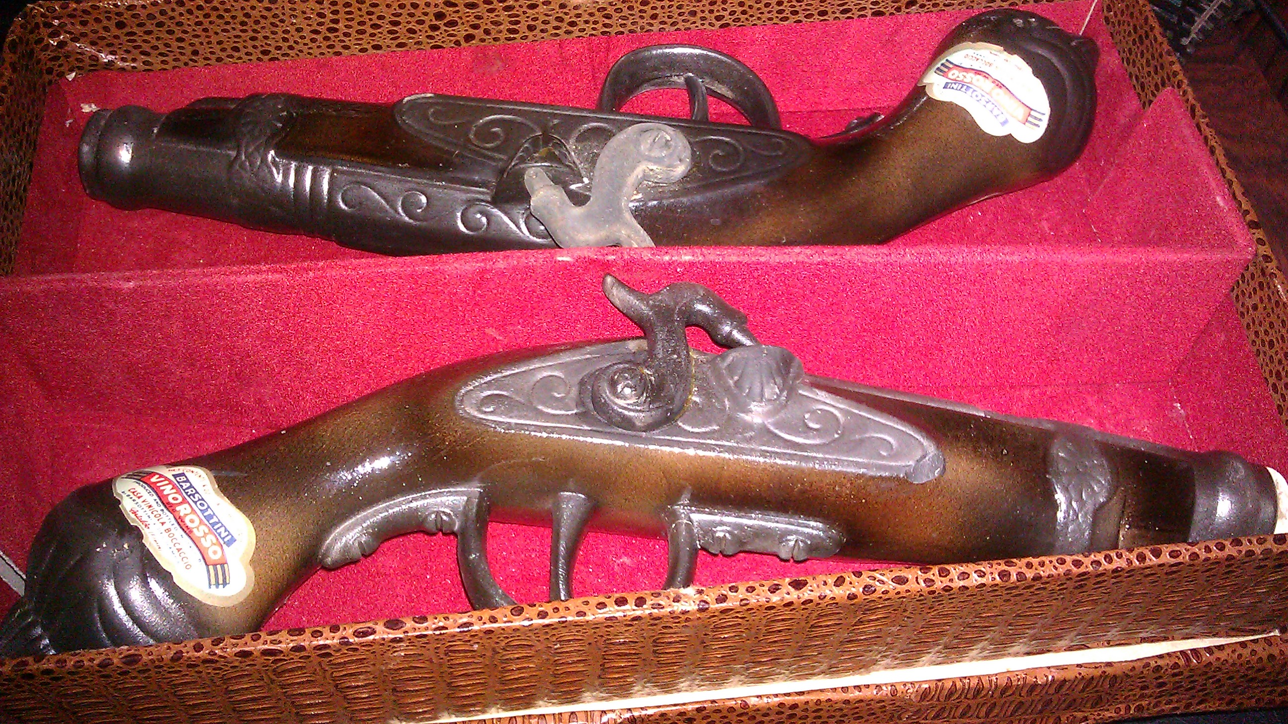 2 bottles shape like guns. They are empty but in very good shapes. The bottles had Vino Rosso. The lables say Barsottini casa Vinicola Boccaccio.