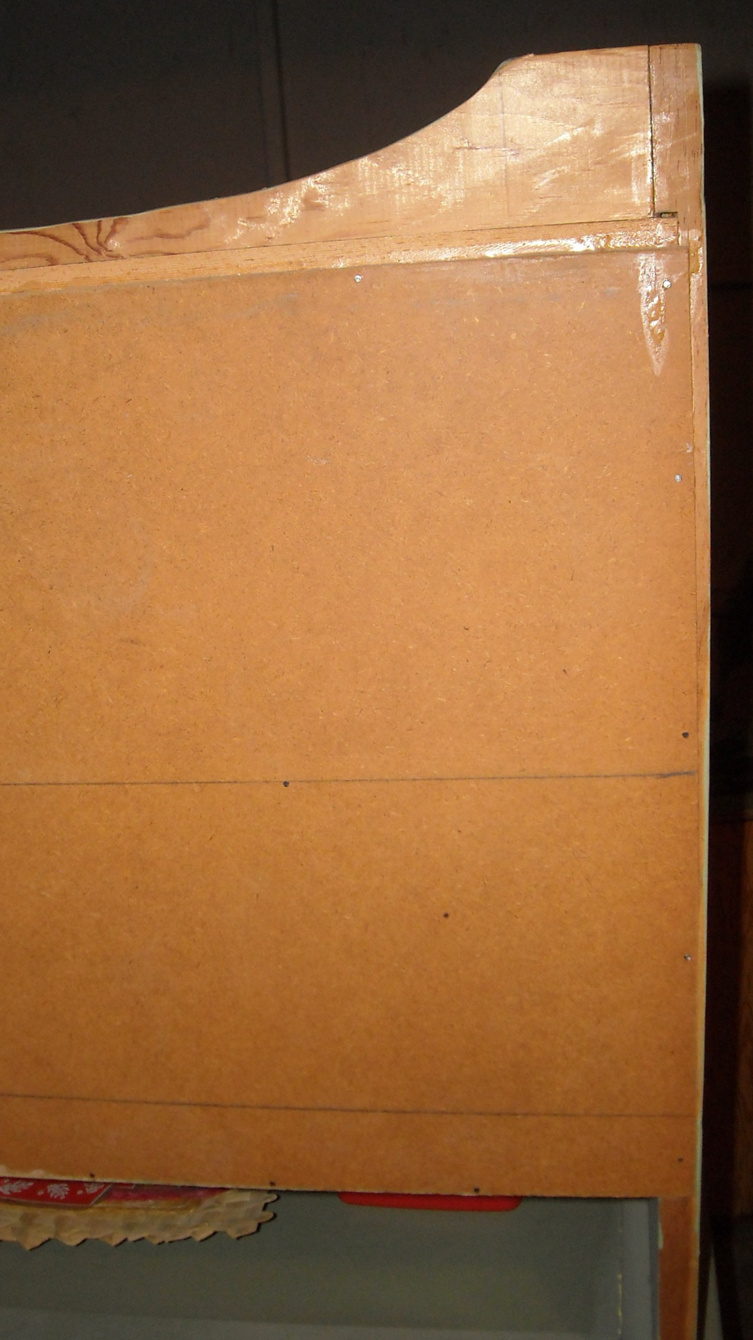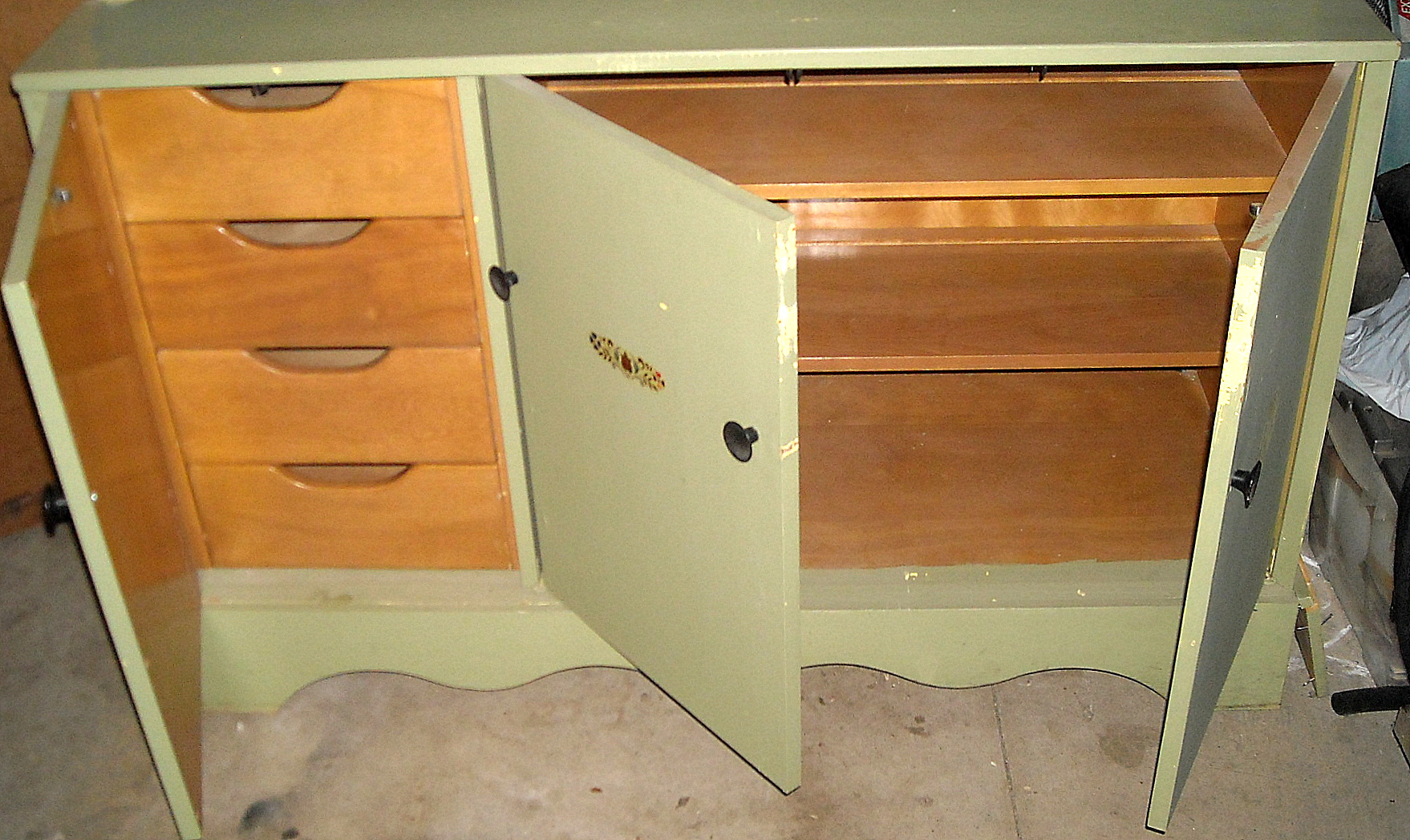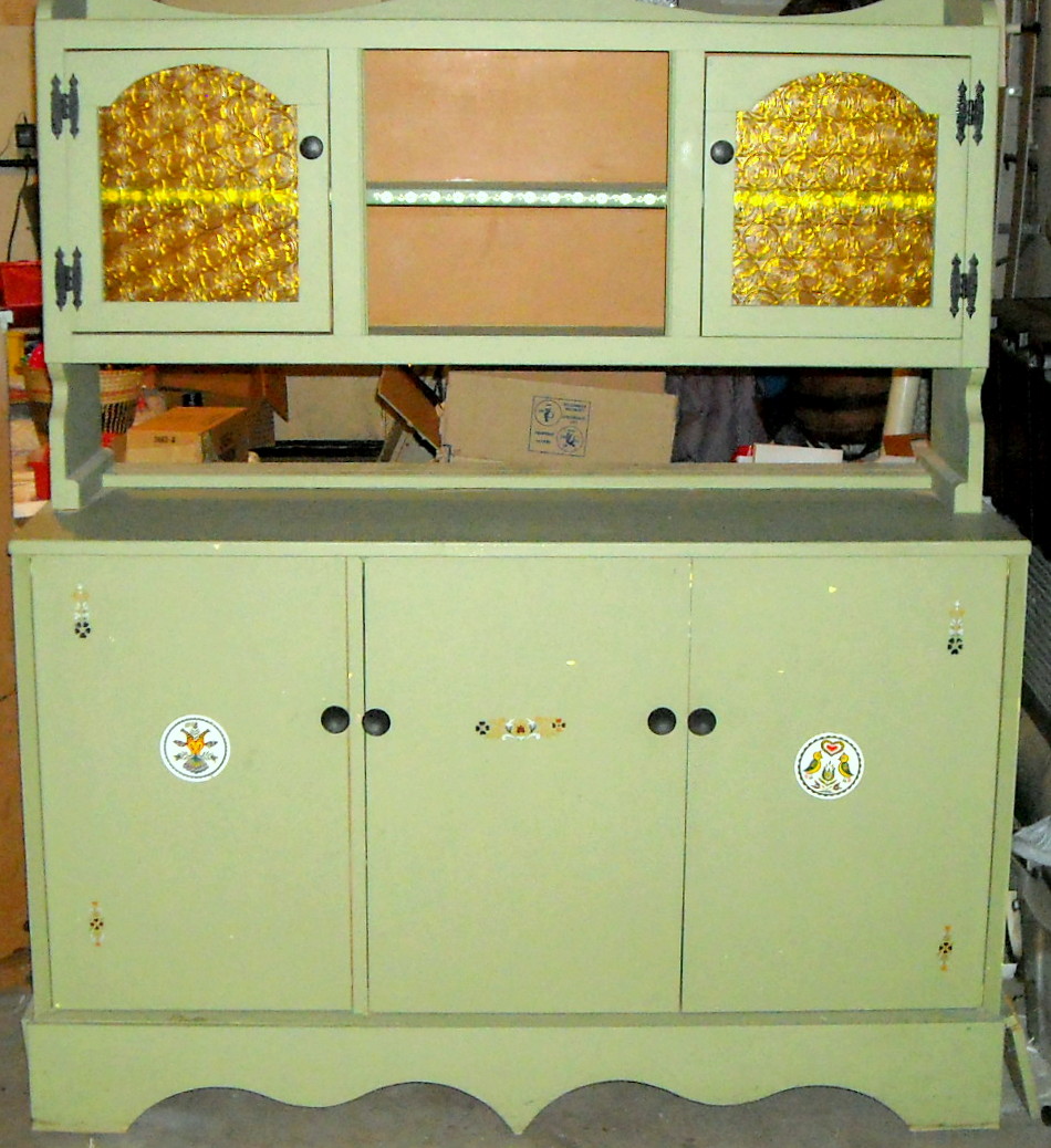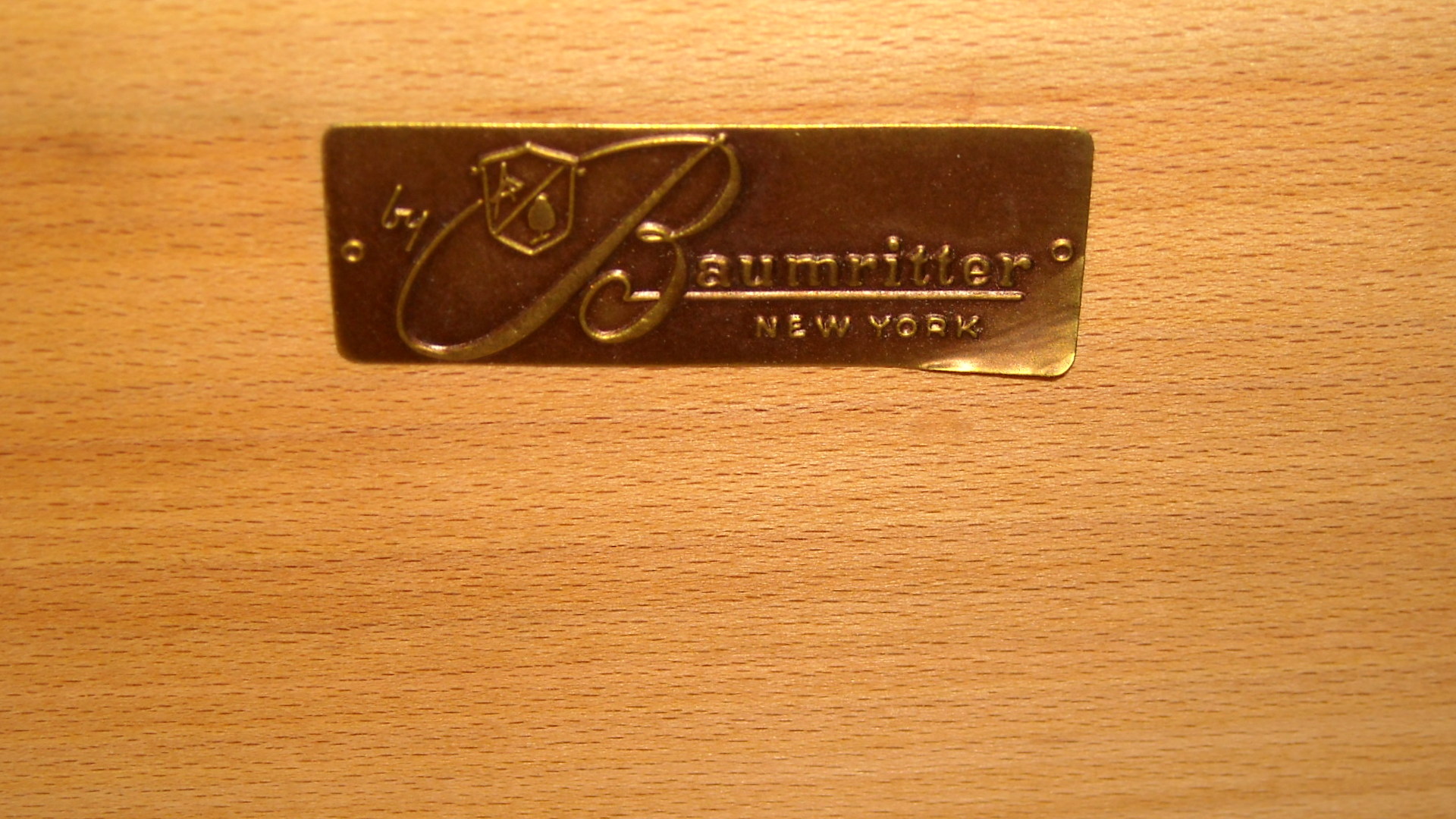 Hutch does have Baumritter Tag on one of the drawers but in looking at this piece I did notice that the top cabinet (the actually cabinet door & not the yellow plastic) that have the yellow circle plastic cabinet fronts look uneven in the way they are cut. So I was wondering if Baumritter would put out something like this or is the top part of the hutch from another peice of furniture or homemade by the previous owner & was married to the Baumritter bottom? I could not find any Baumritter Hutch that looked like this,even without the paint. I have another posting of a Dry Sink that came in the same lot as this and it appears that the hardware had been changed on both to match each other & I would guess that the hardware was changed in the late 60's, from the other items I acquired. What year did Baumritter put metal like stickers on furniture and when did they change to stamping furniture instead?If you know anything about this item or could possibly tell me what era you think it's from? Also if you think it's from 2 different peices? What kind of wood you think it might be that is so heavy & of course an idea of what it would be worth. Thank you so much to anyone that could help me out.