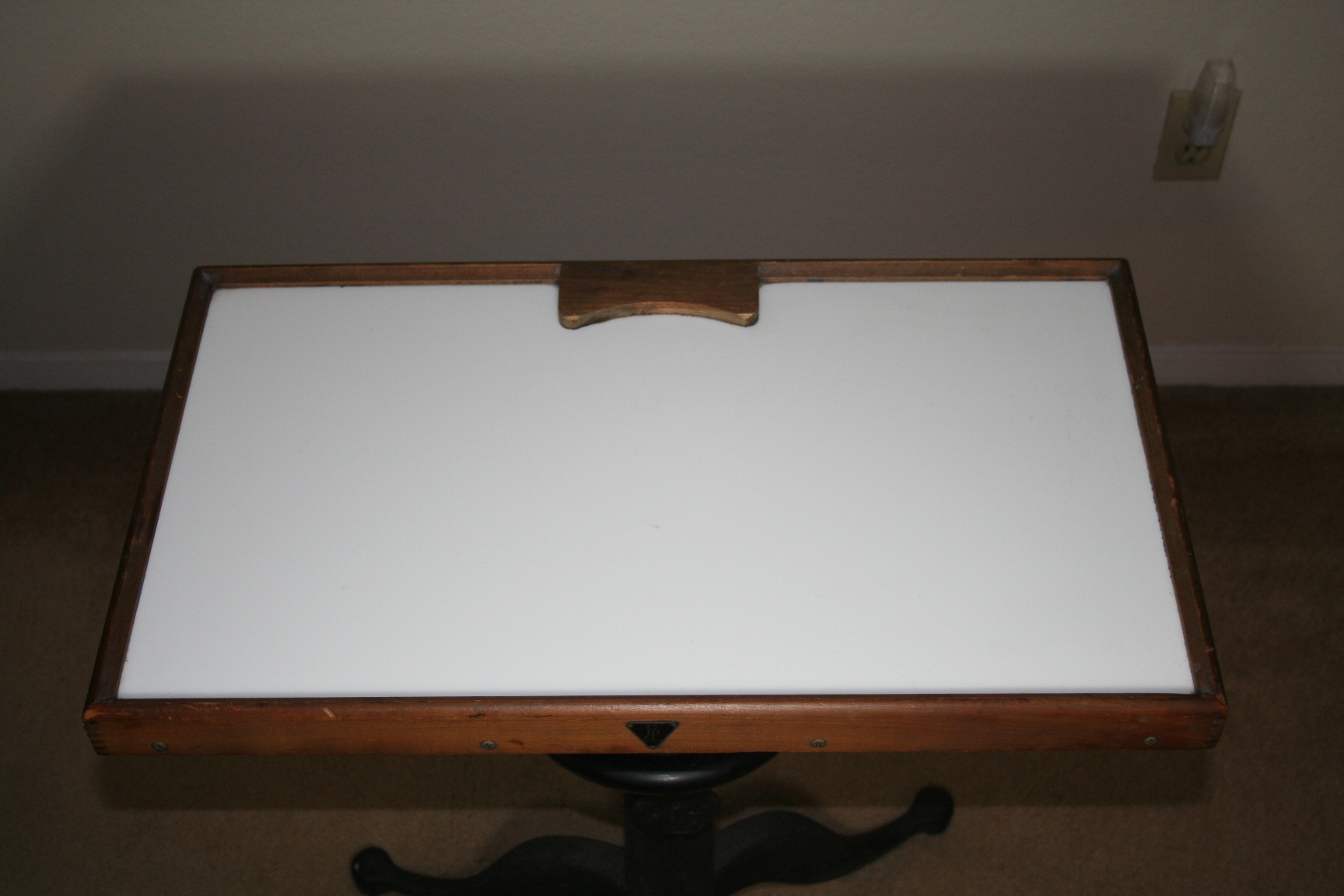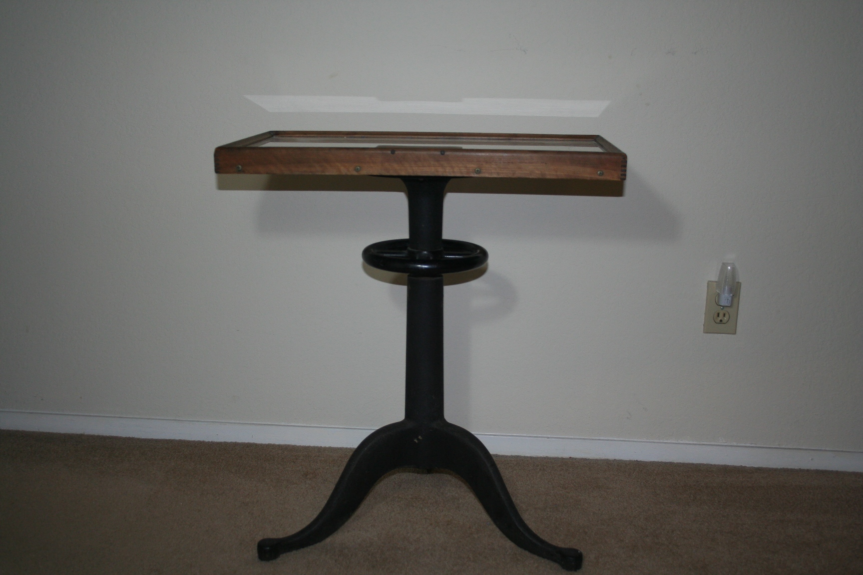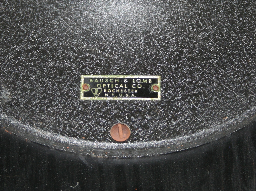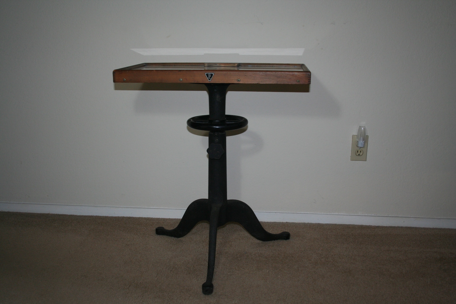An old Bausch and Lomb optical table. Cast iron metal bottom with 3 legs. Stands approximately 26-inches high with adjustable circular handle. Top is rectangular white marble or glass 15"X25" with 2-inch wooden border in good shape. No visible knicks or dents, just normal wear. Has Bausch and Lomb triangular metal tag on front of wooden border, and a Bausch and Lomb Optical metal tag attached to under side. I have not yet weighed the table, but would estimate it to be between 70 and 80 pounds.