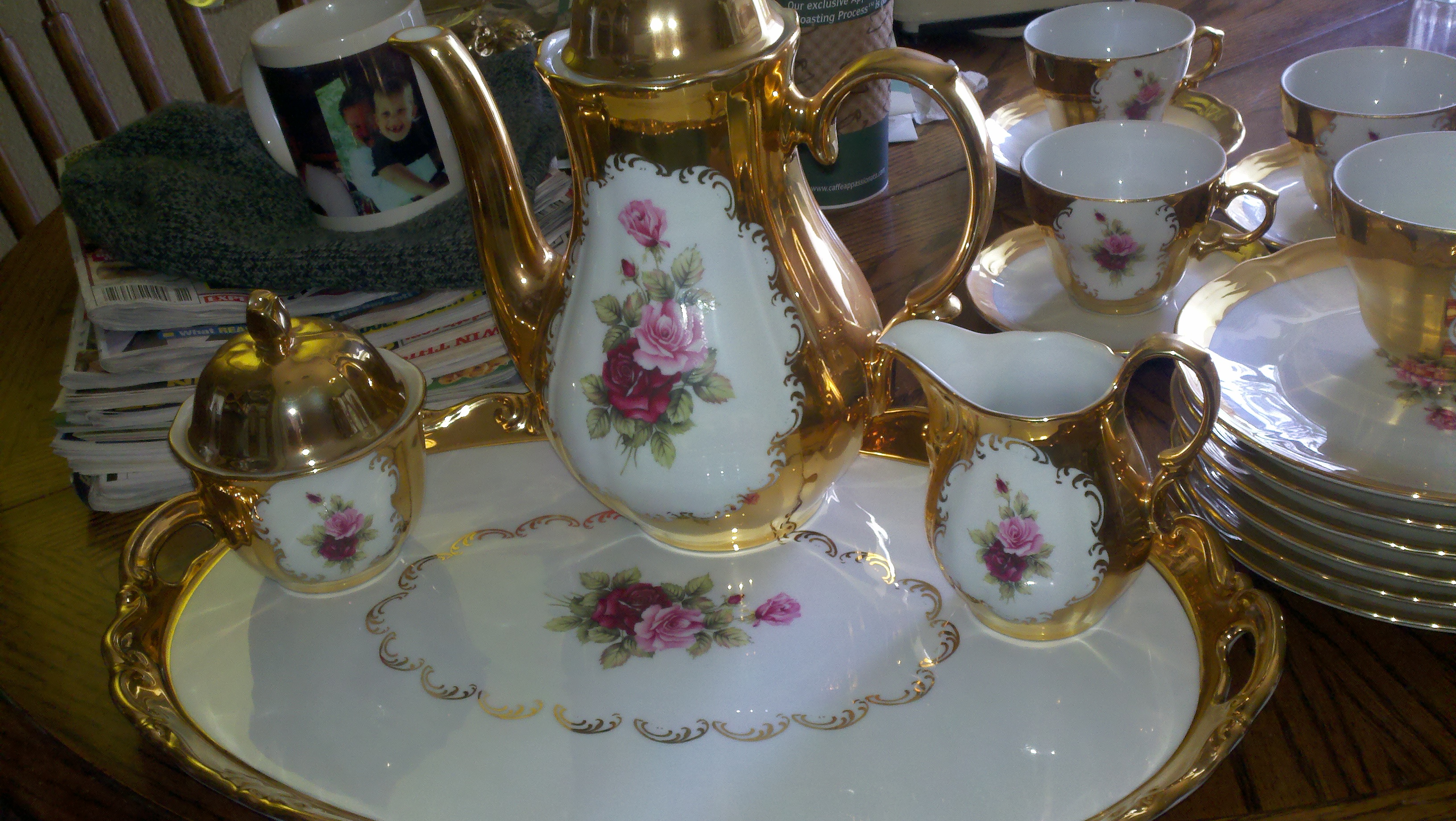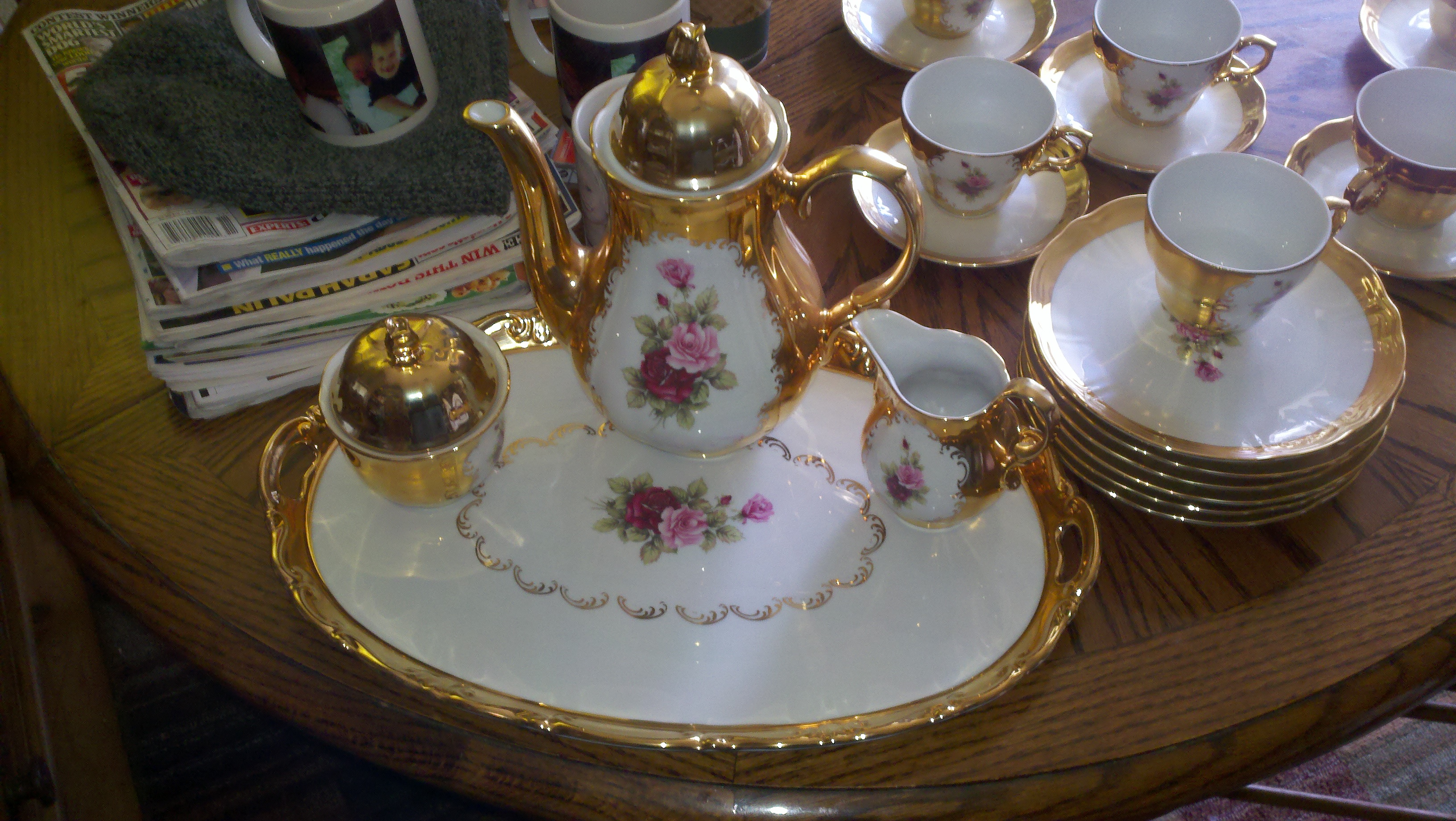 There are 6 plates 6 cups 5 saucers a large platter and a tea pot sugar and creamer dishes. They are all coated in 24 Carat gold, and they have roses on them.