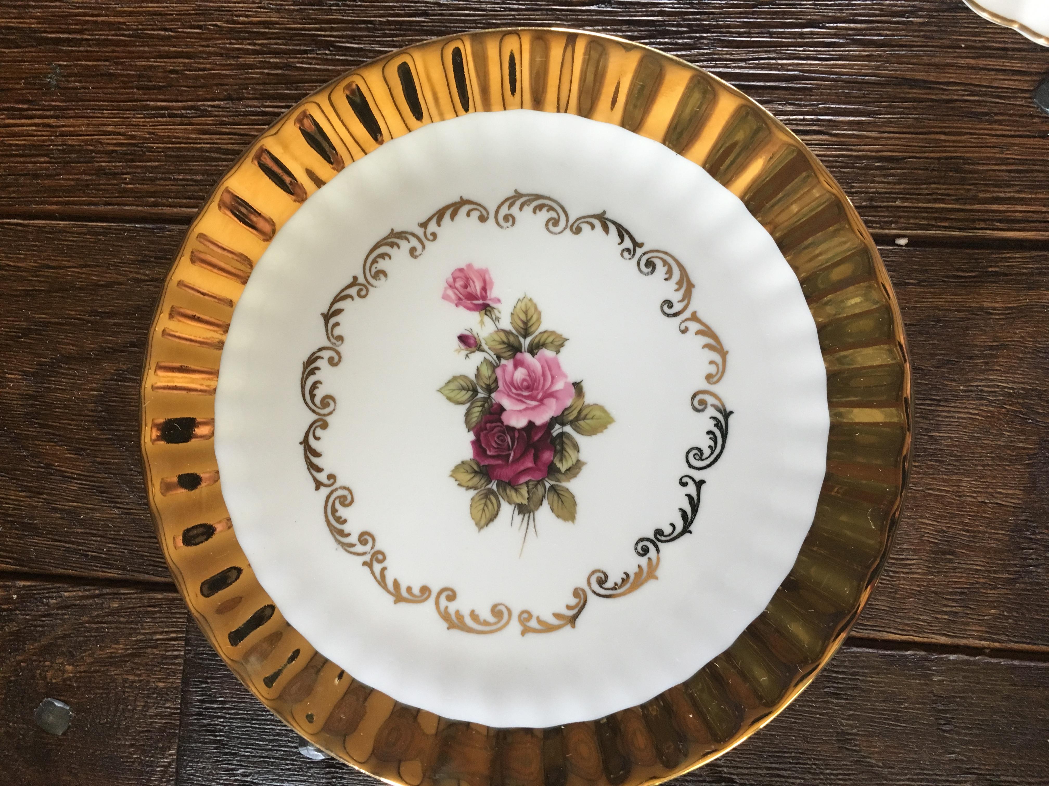 (one saucer has a chip). They are all coated in 24 Karat gold with a rose print.