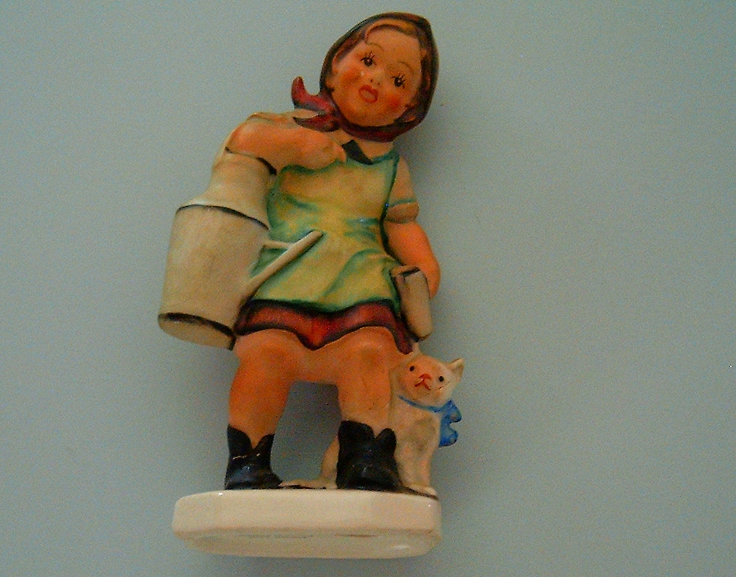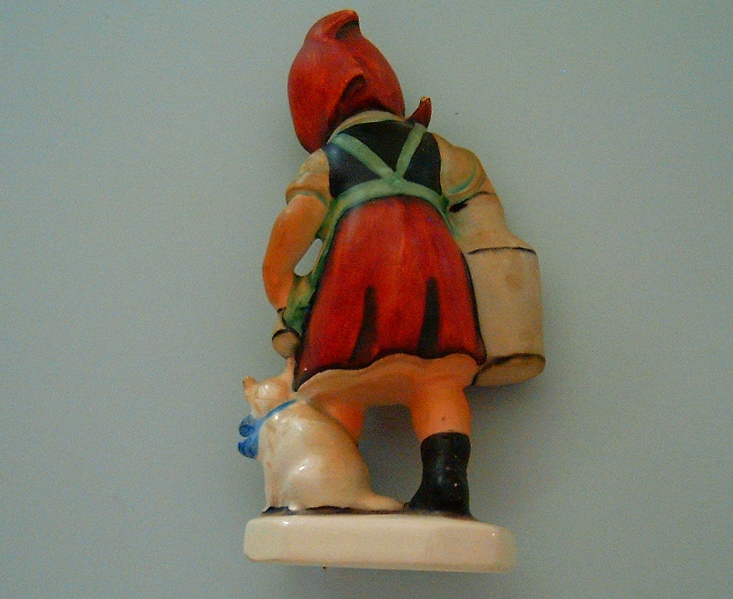 Little girl figurine is about 5 1/2" tall. She has a red hood tied on the right hand side under chin and has a whitesh green overlay over a red dress. She is holding a white milk can in one arm and a cup in the other. She has black boots and a white kitten on her left hand side by her feet. On the bottom is marked Friedel Bavaria Made in Western Germany Hand Painted in Green. No other marks I can see. She has a stress fracture on her lower leg over to cats lower face. Not broken just a stress crack I would say it was.