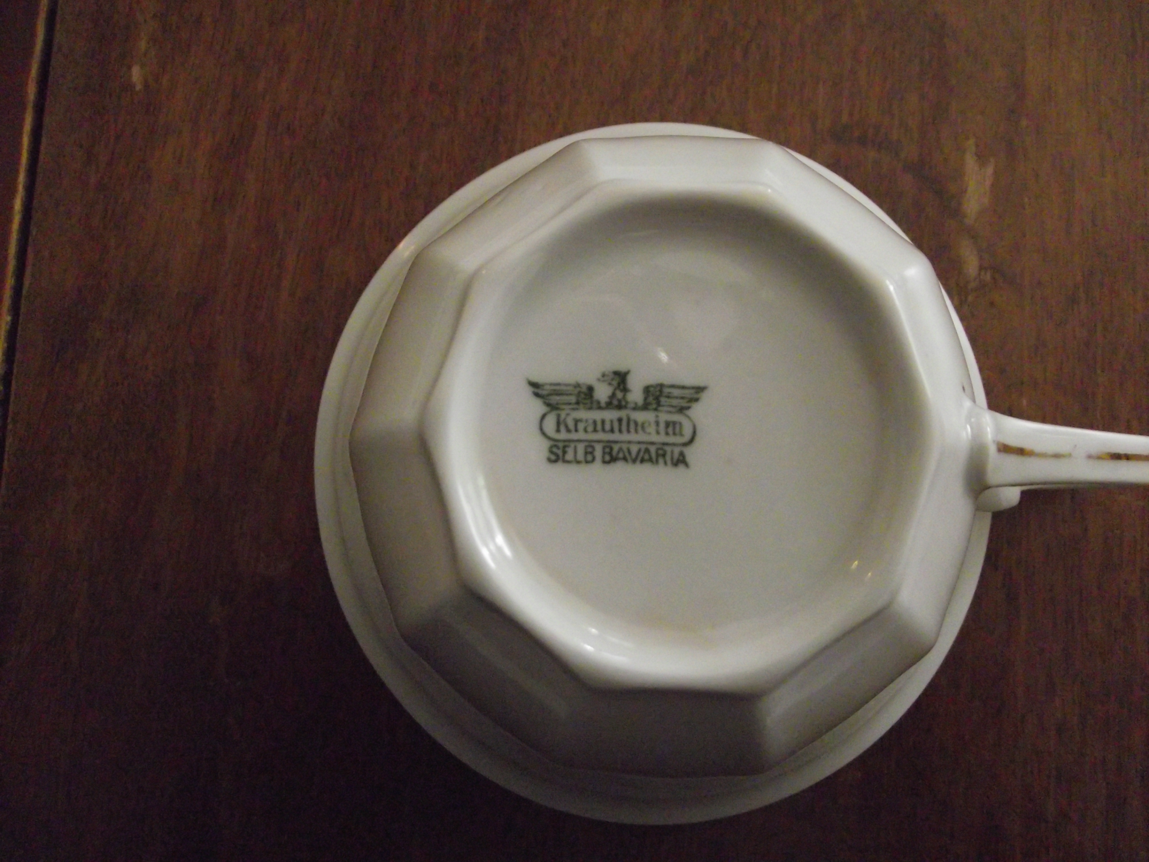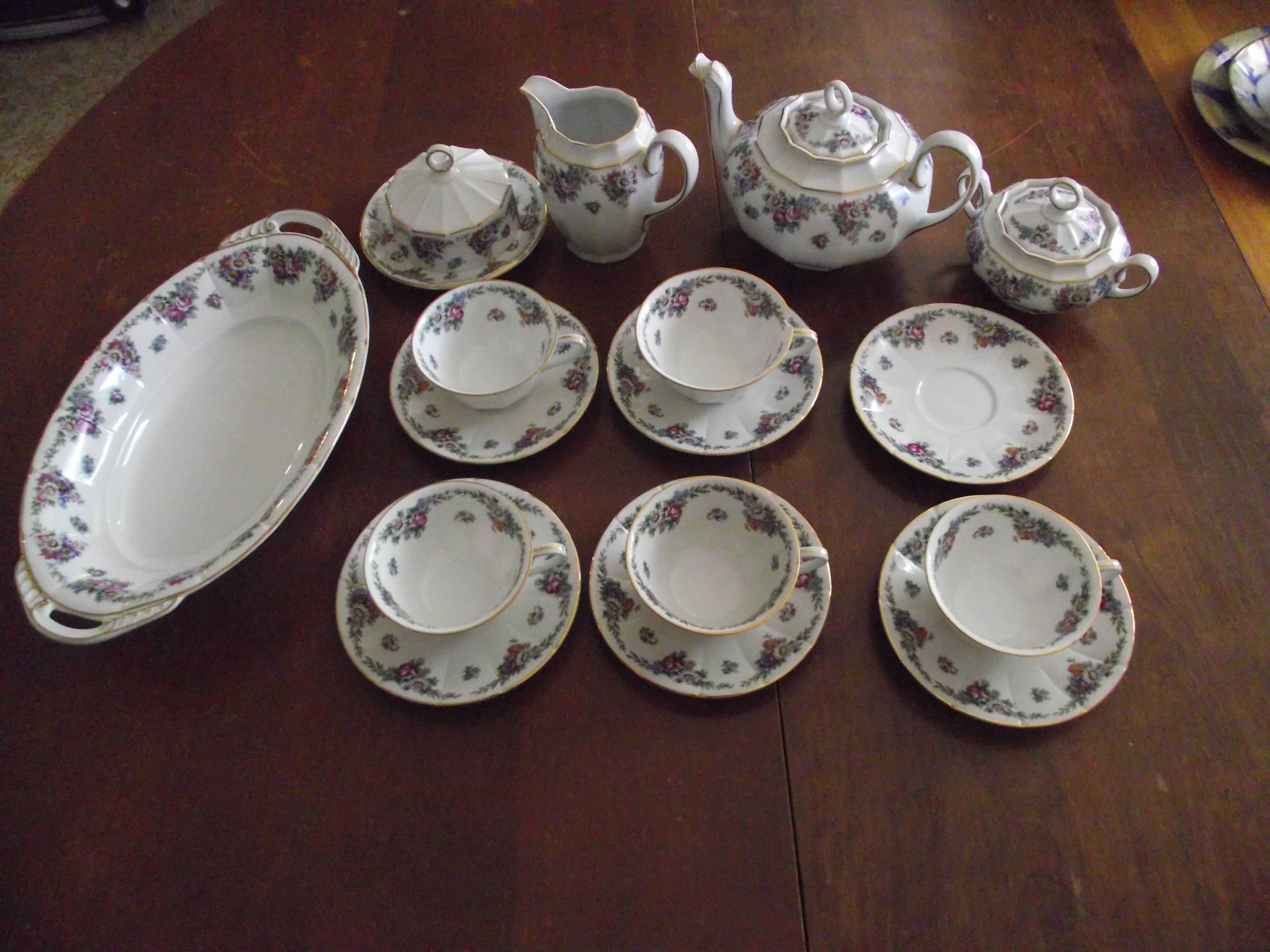 Tea set, estimate 70 years old, two cracks/chips, one cup missing. Back stamp as seen on picture.