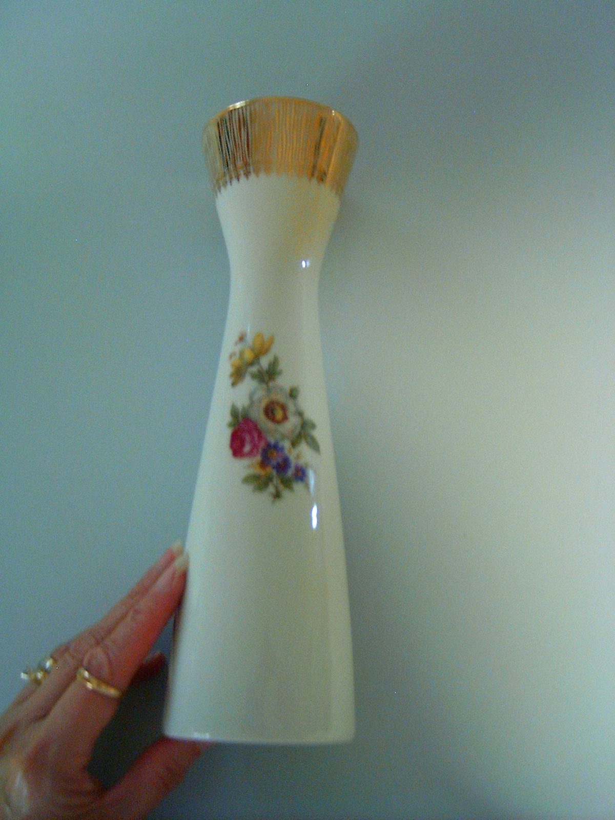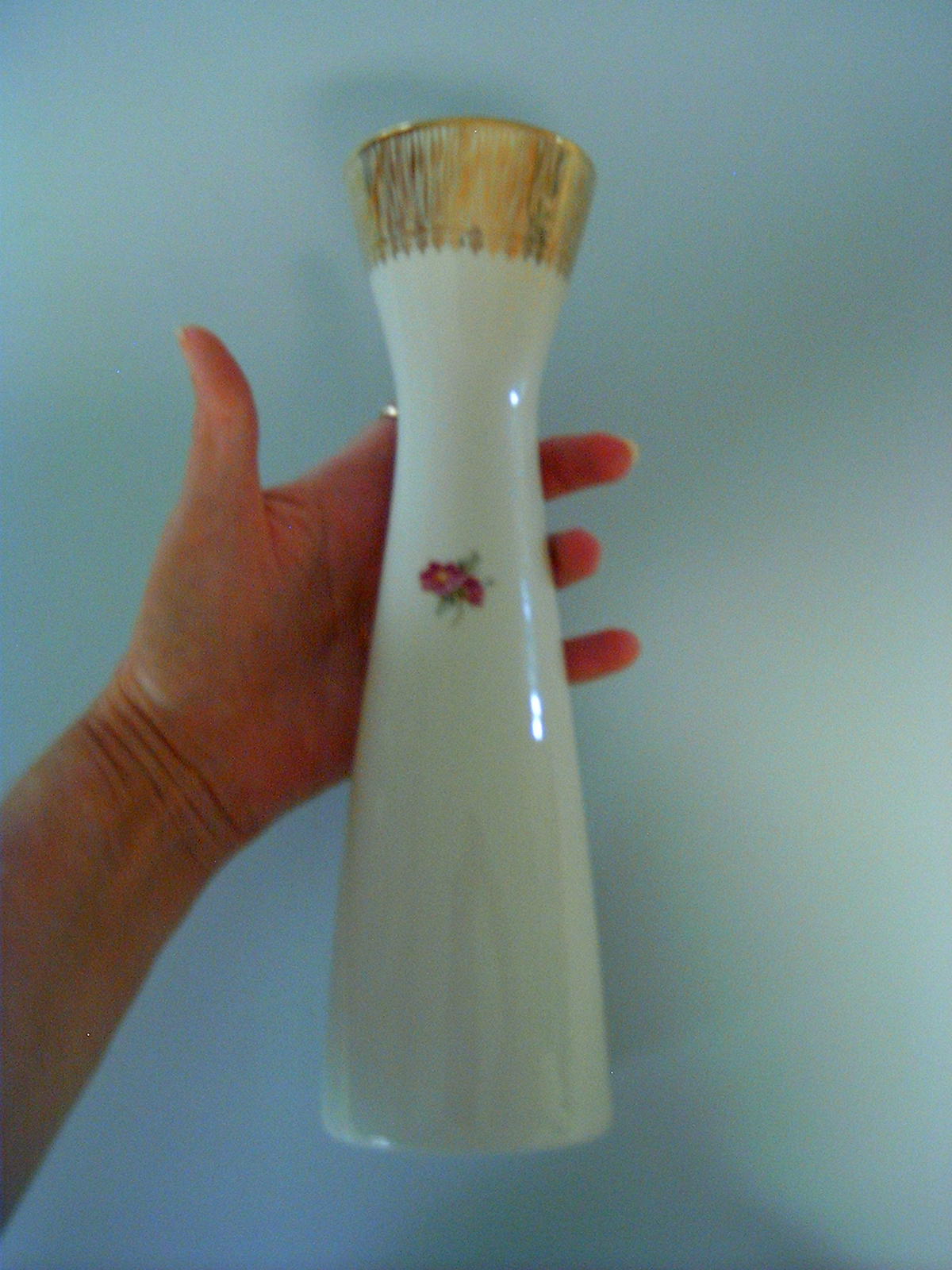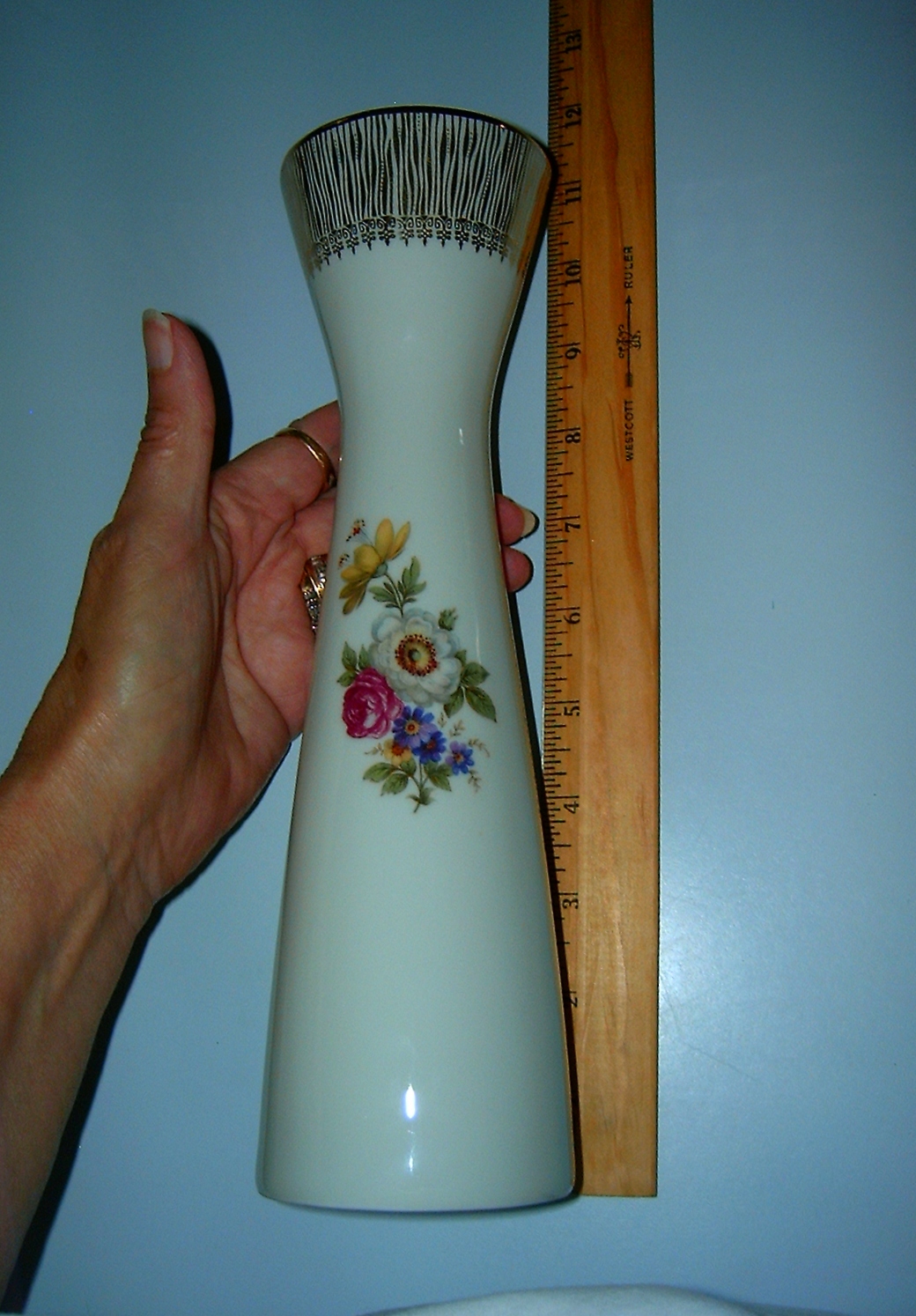 This vase is approx. 10 1/2" tall and comes up about 7" and slenders to about 2" diameter and the rim is about 2 3/4" diameter. The base is approx. 3" wide. Its all white with a floral bouquet of flowers on the front and on the back is a simple 2 small rose/burgandy color flowers. Around the rim is a gold trim of about 1 1/2" squiggly lines of gold and a design at the bottom of the gold design . The vase is shinny and smooth but you can feel the floral design on the front and back. The bottom mark is double W in green with a green crown above it. Below the double green W is Bavaria and below Bavaria is 034 in Green. There is a indented number 298/z from what I can see. No other markings.