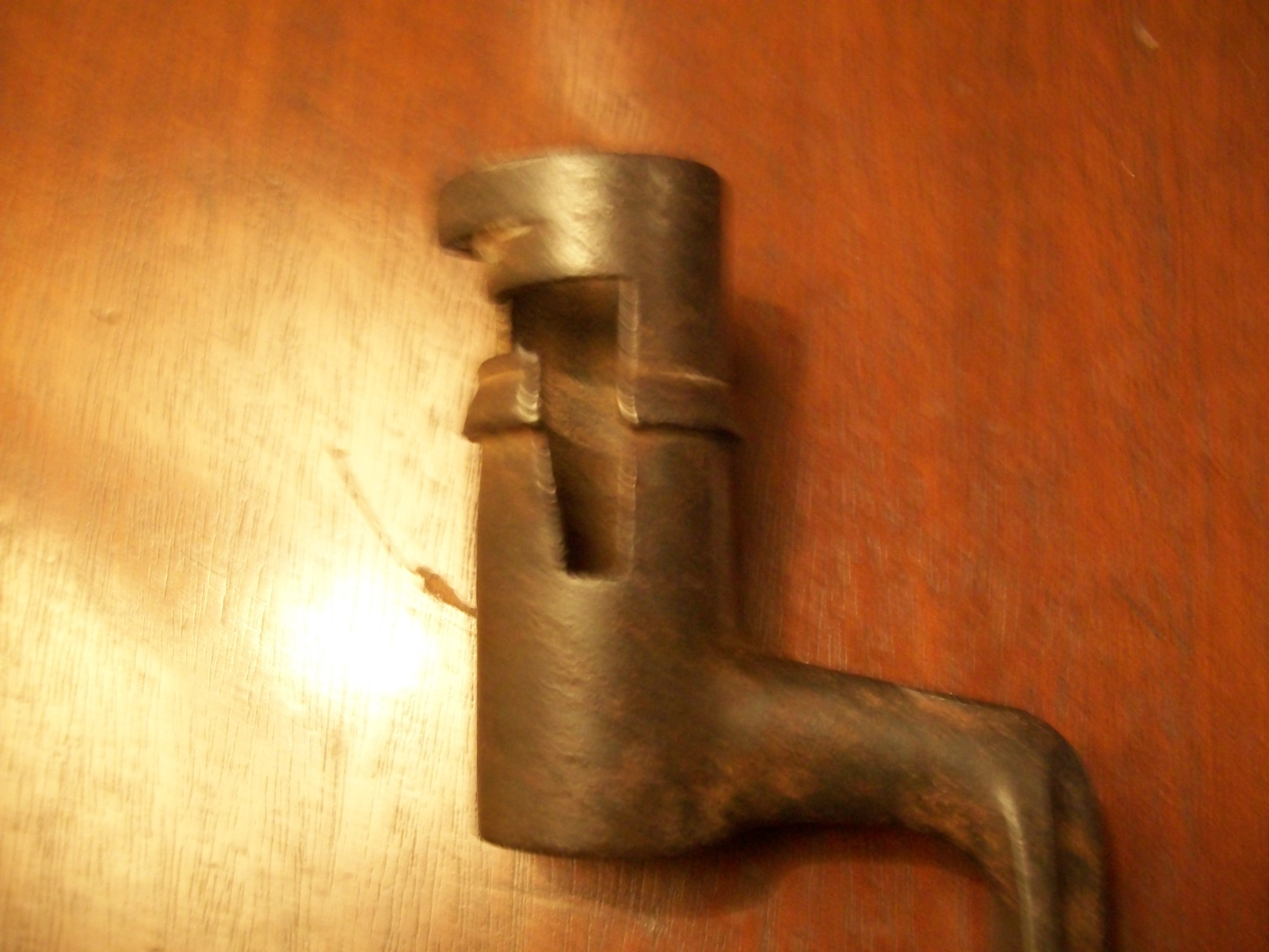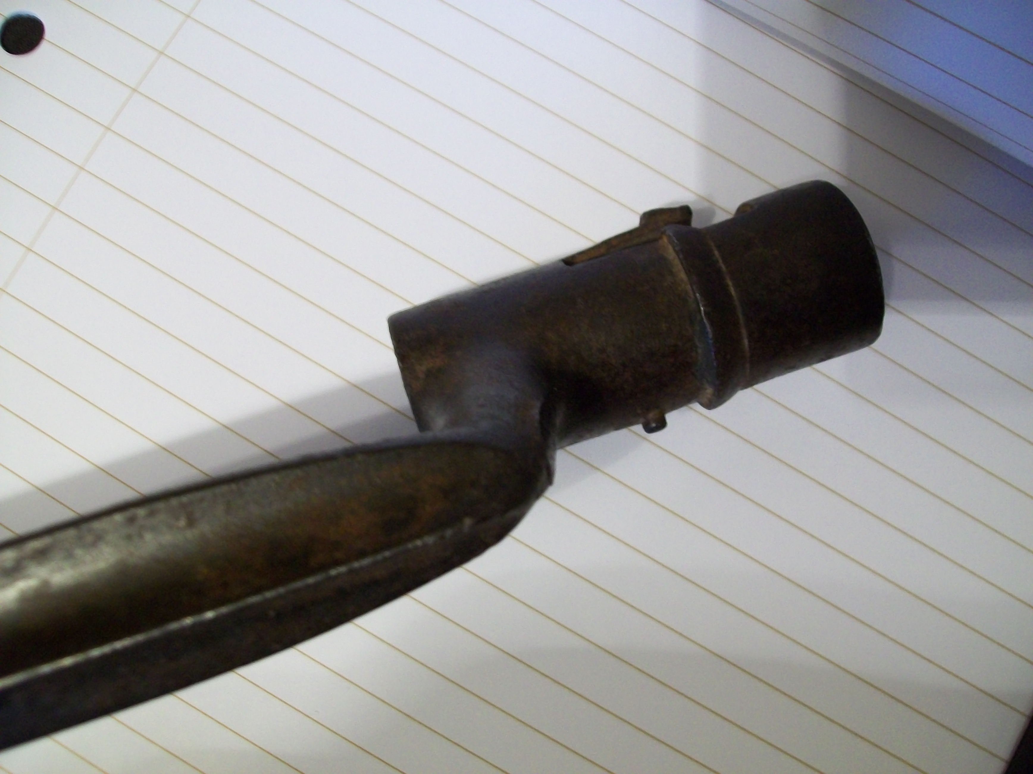 This is an old bayonet I bought somewhere, I think I spent 75.00 on it. It looks as if it were uncovered from a battlefield. It had been blued, not shinny finish. It twists onto the barrel of a rifle. Has marking "LS" on the top side of the blade. Blade has three sides, not flat.