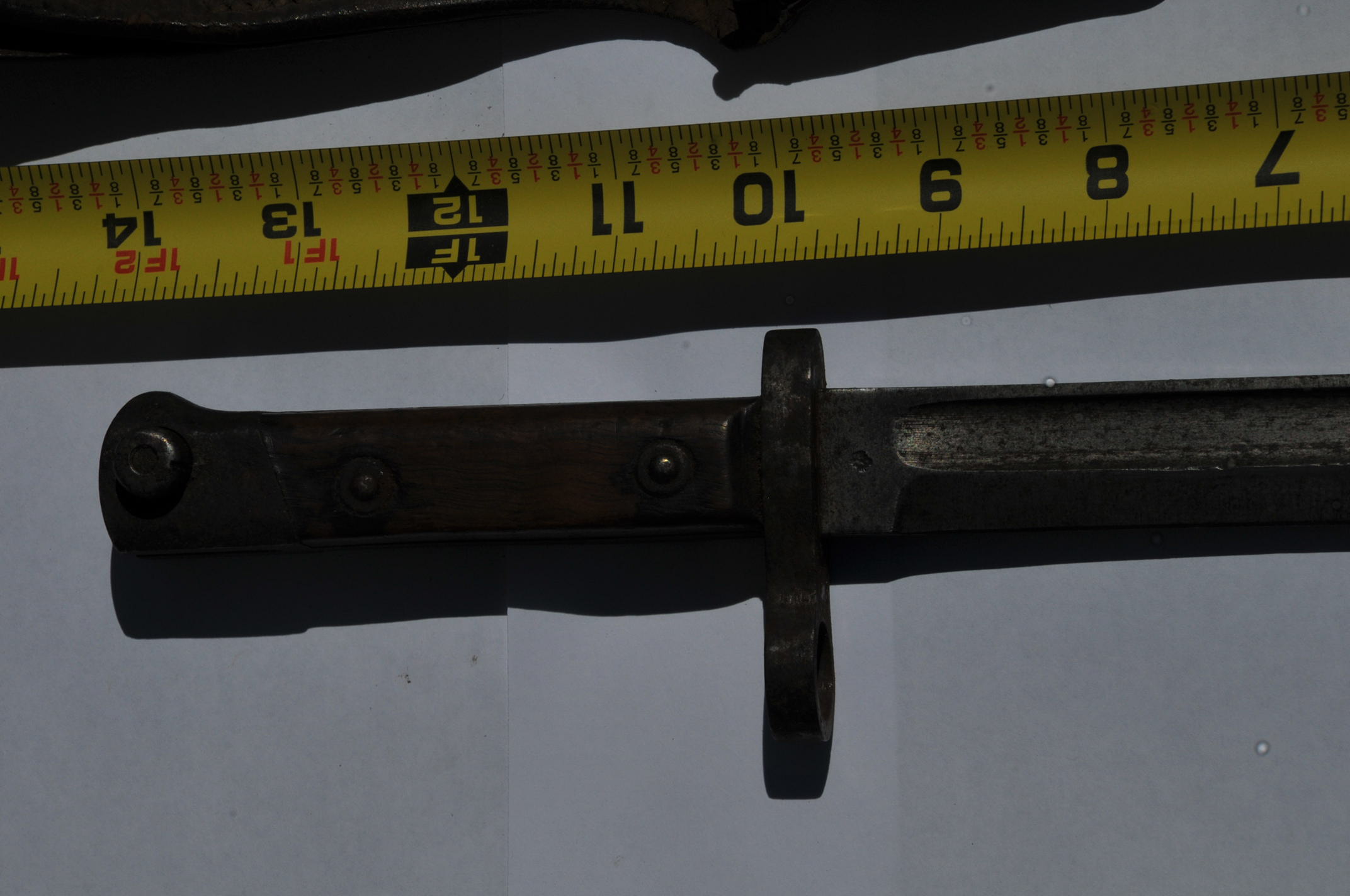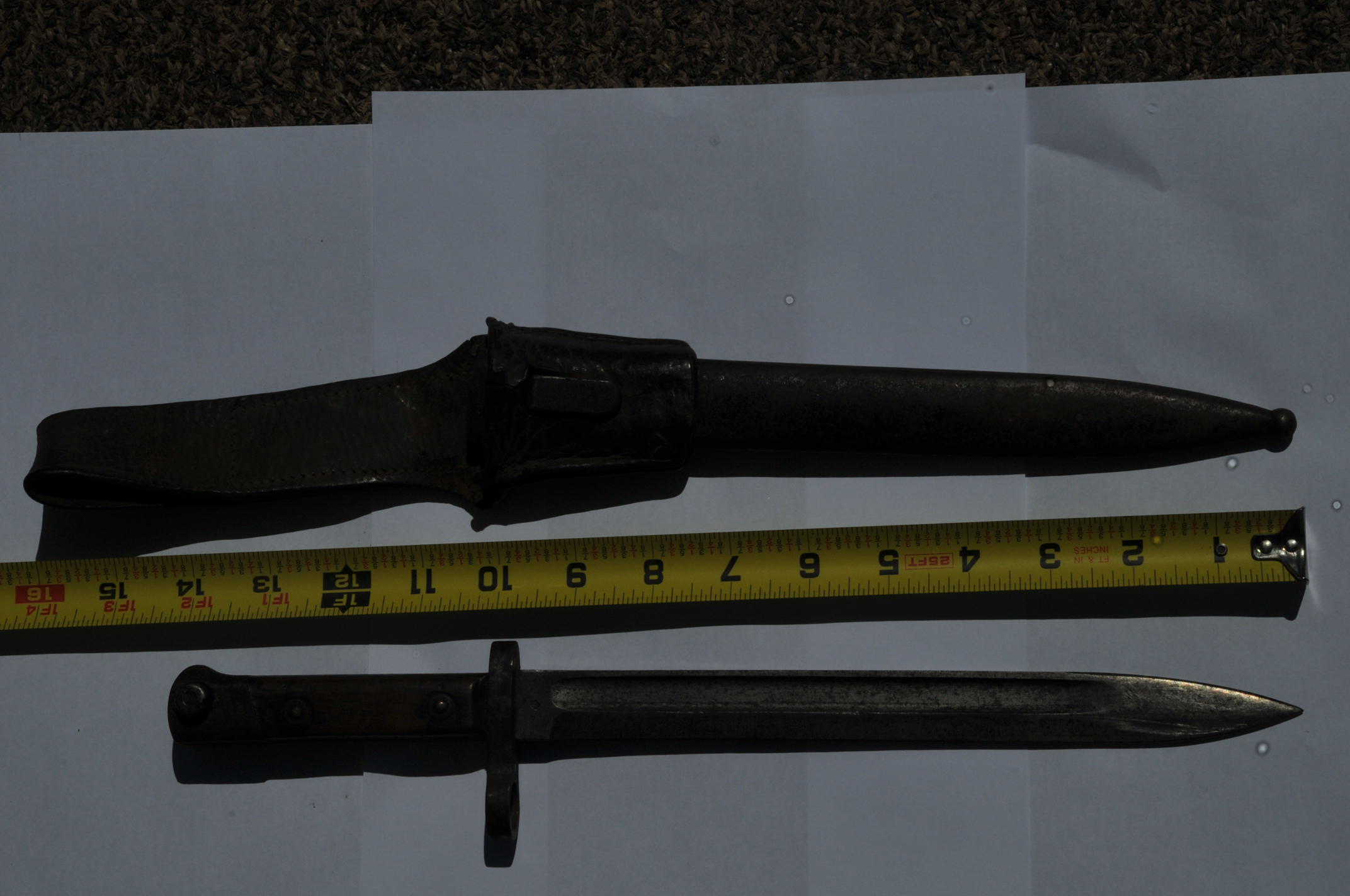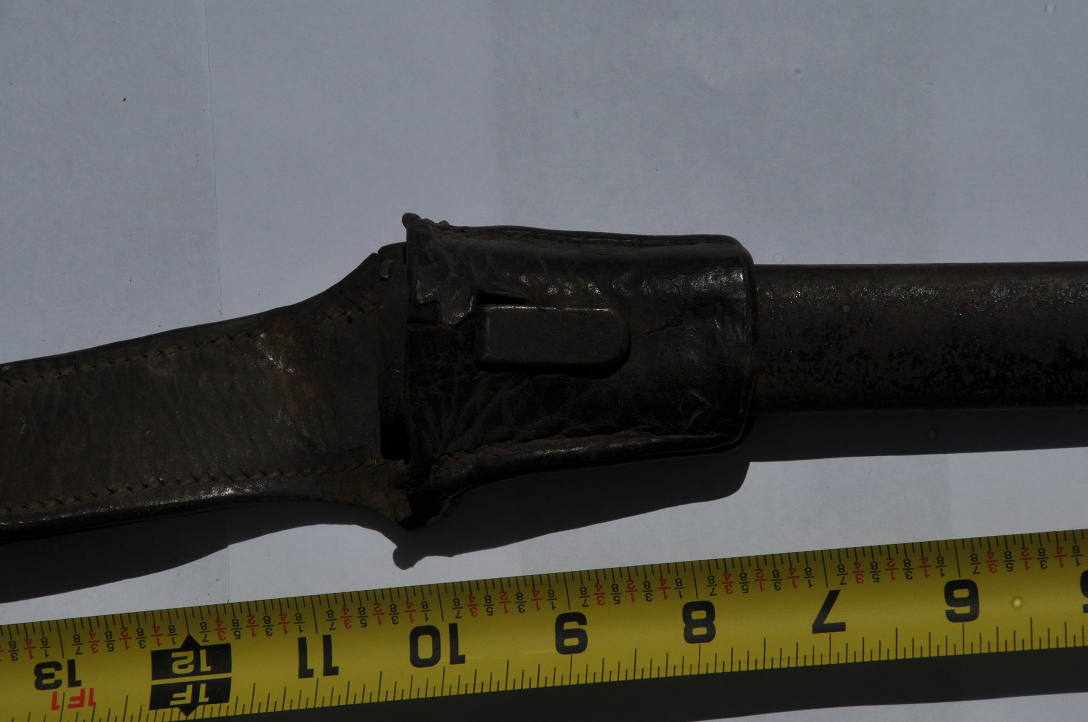 steel bayonet with wood inlaid handle. Scabbard has steel to hold blade with a leather strap to attach to belt
