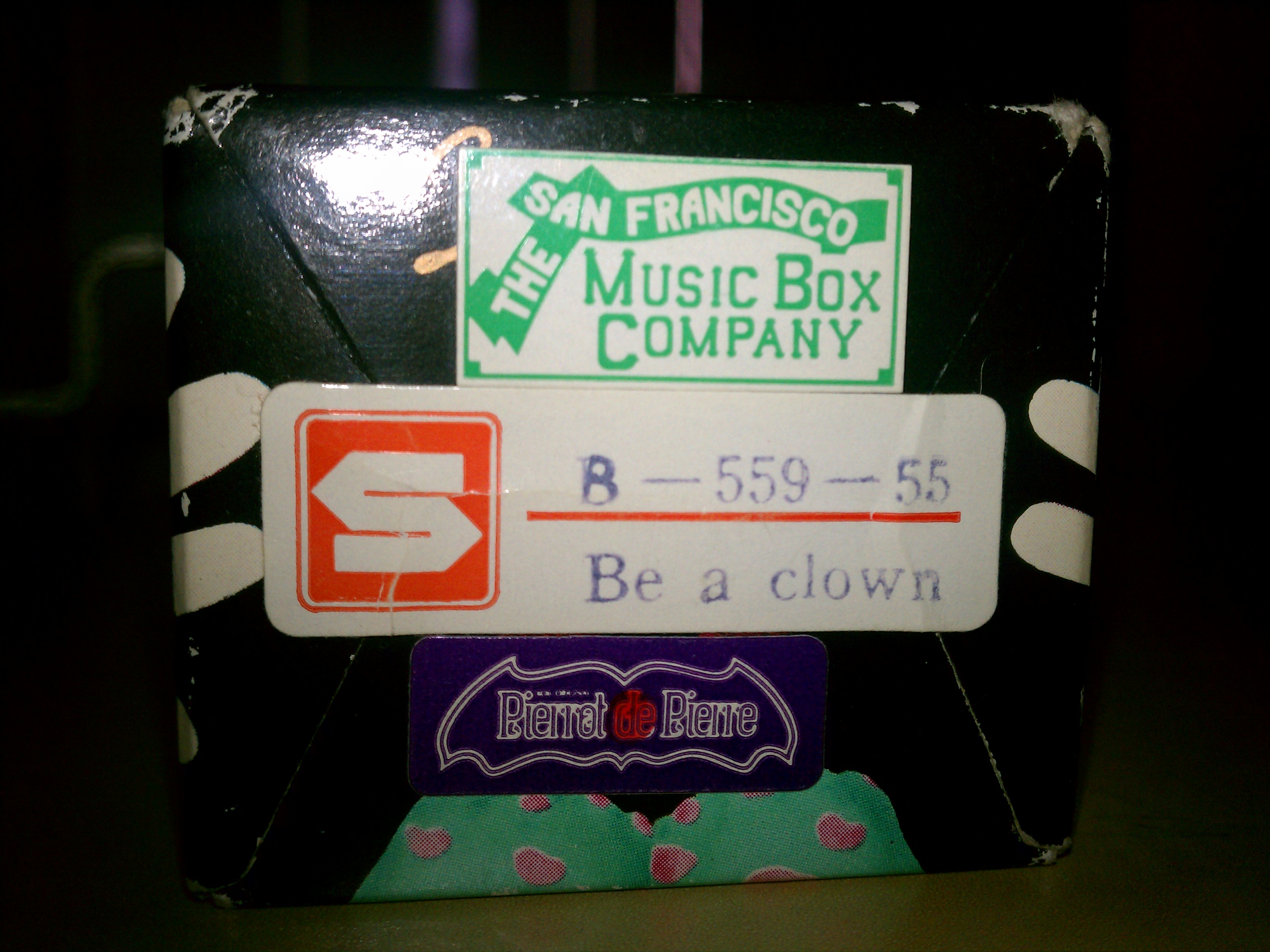 A small music box completely covered with cardboard and vintage clown painted on it. A side bar that makes the music player work.