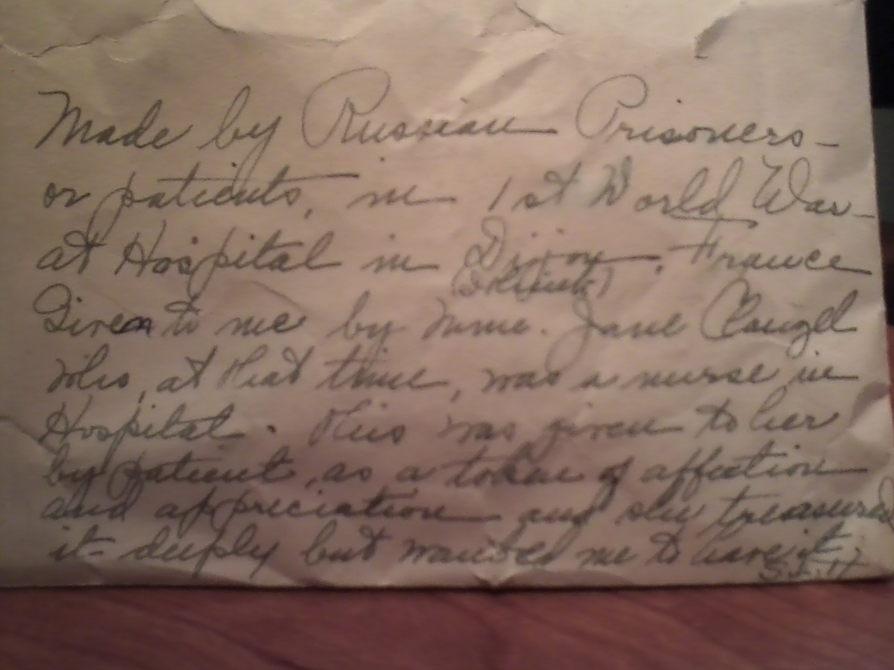 Made by Russian Prisoners or patients, in 1st World War at hospital in Dijon, (I think) France. Given to me by Mme. Jane Clauzel who at that time, was a nurse in Hospital. This was given to her by patient, as a token of affection and appreciation and she treasured it deeply but wanted me to have it. S.L.H.