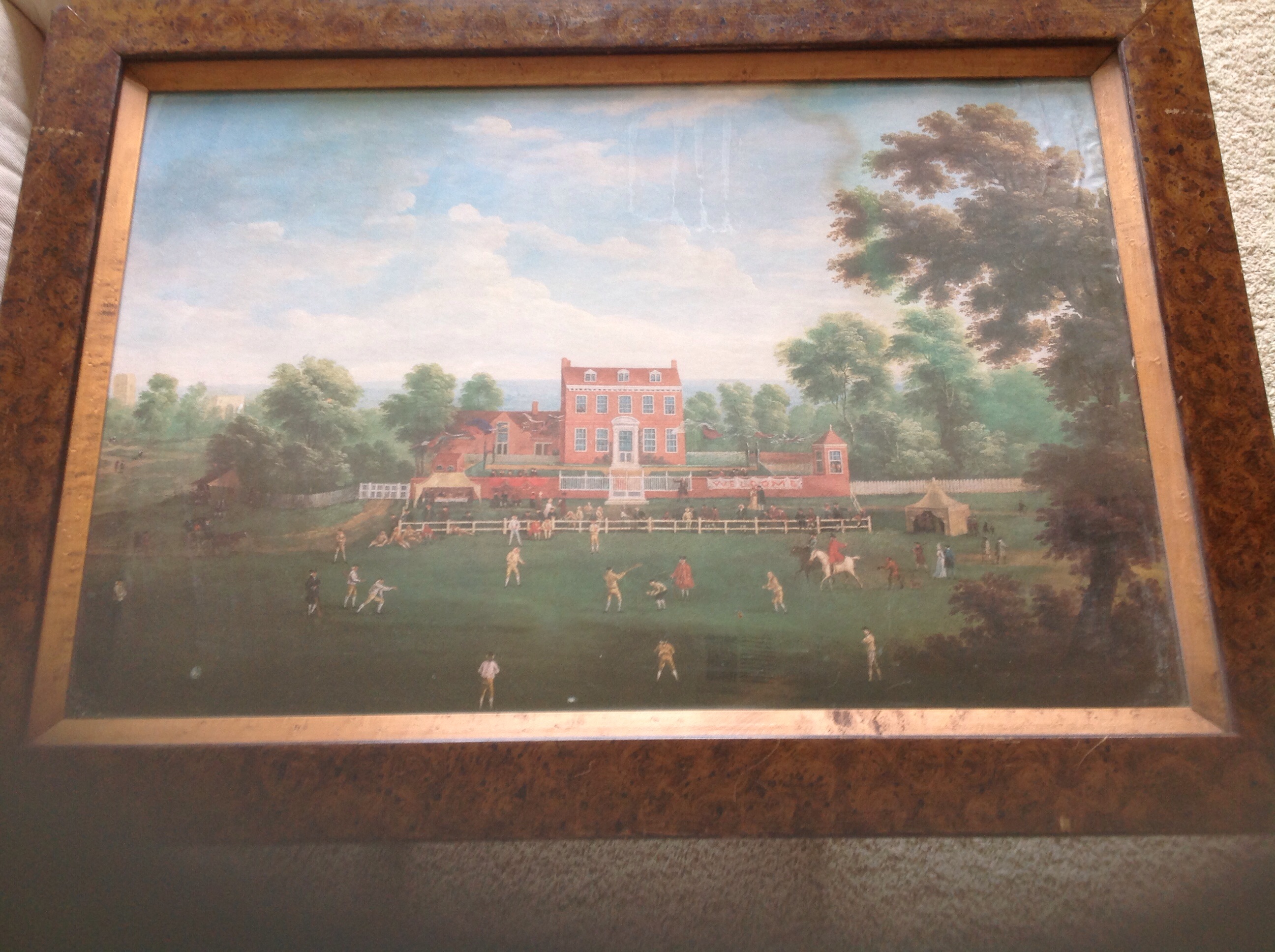 Framed photo of crickets cartoonish players in front of a large English looking estate.