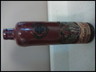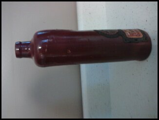 The bottle itself is not made out of glass.. it looks like pottery...it is brown in color...and is in very good shape. It is not broken or chipped...