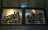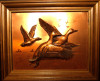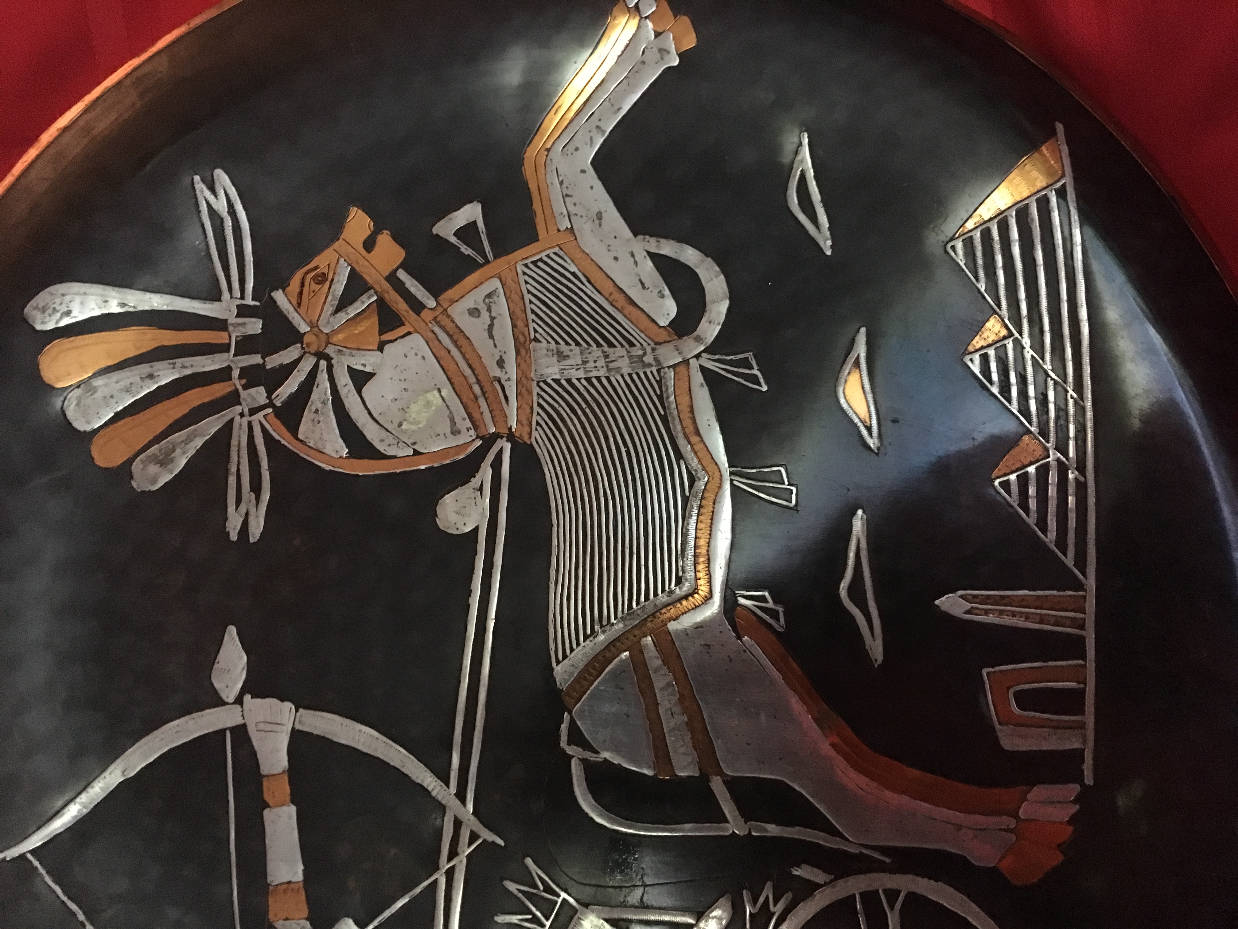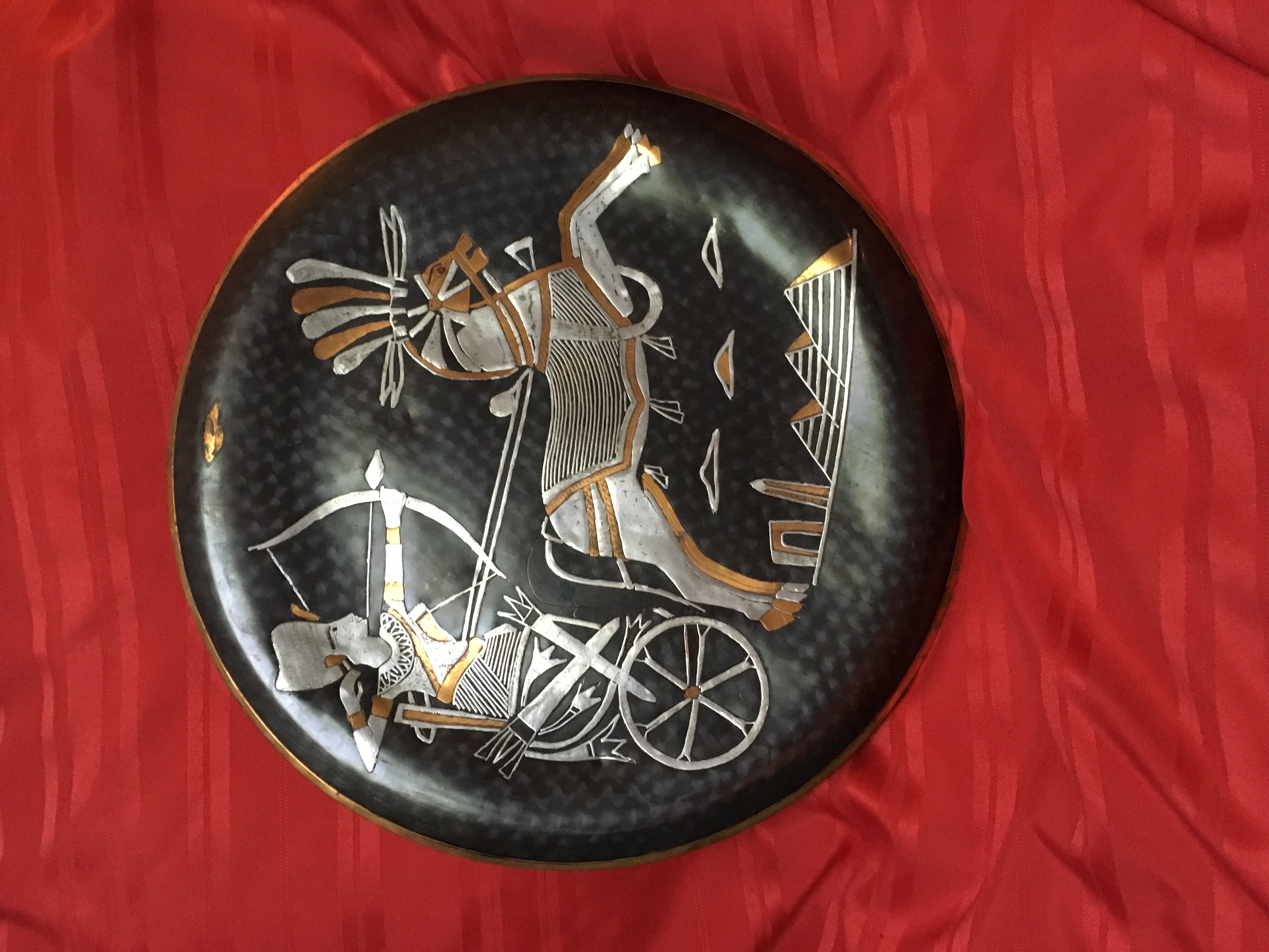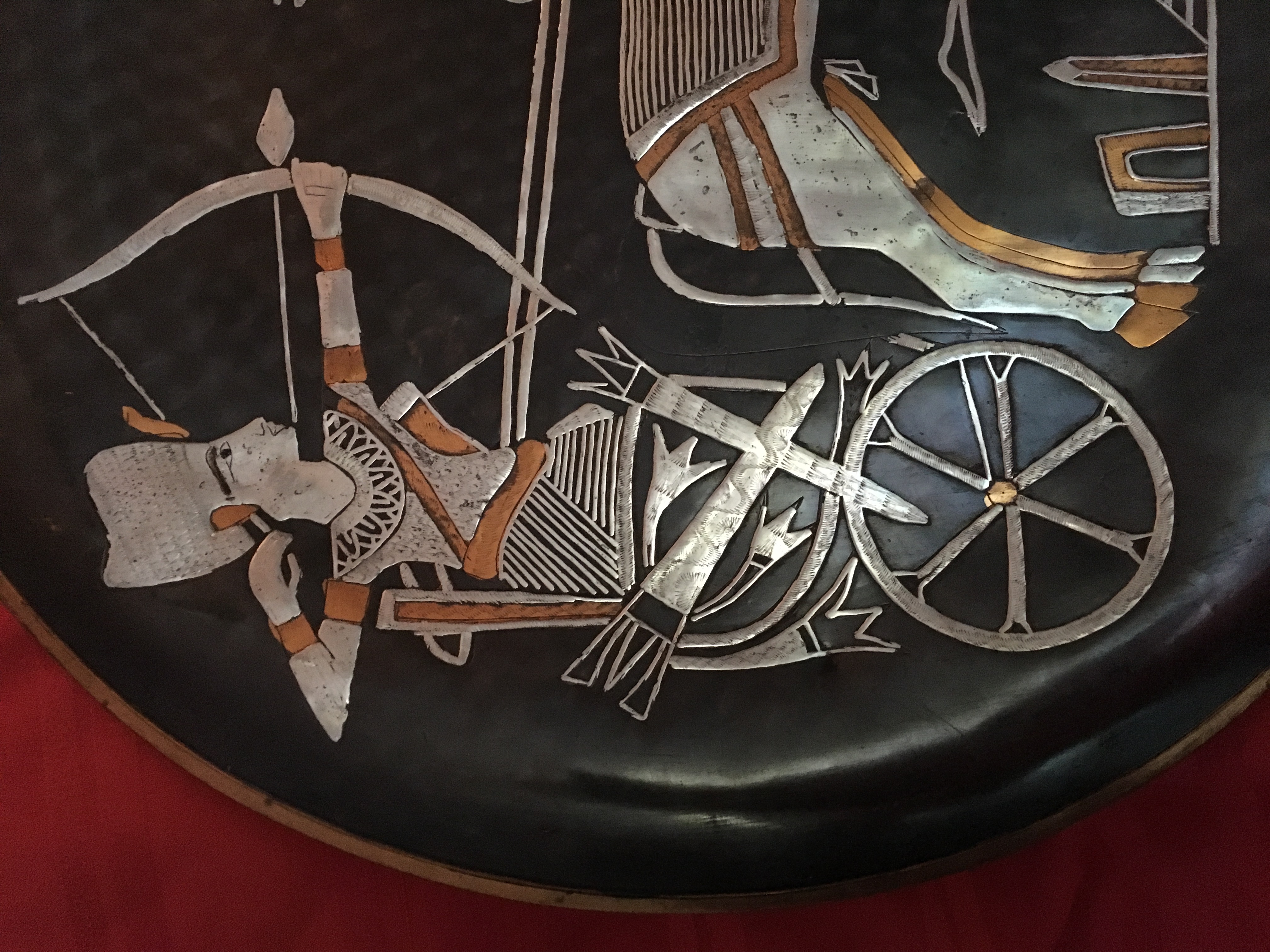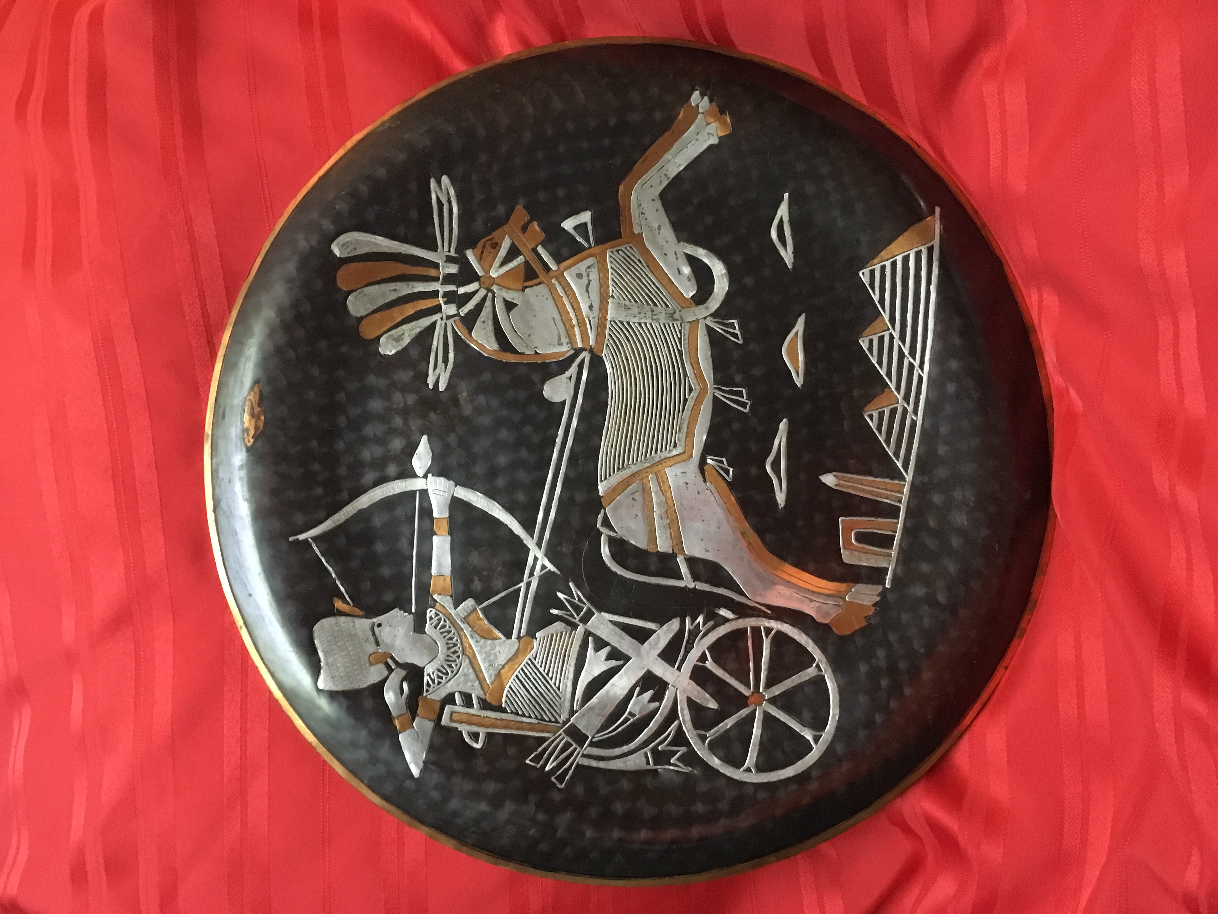 This is a 19.5 inch diameter copper plate with onyx colored front with two tone character which appears to be an egyptian pharaoh riding to war on his single person chariot behind a horse. There are also pyramids in the relief.