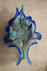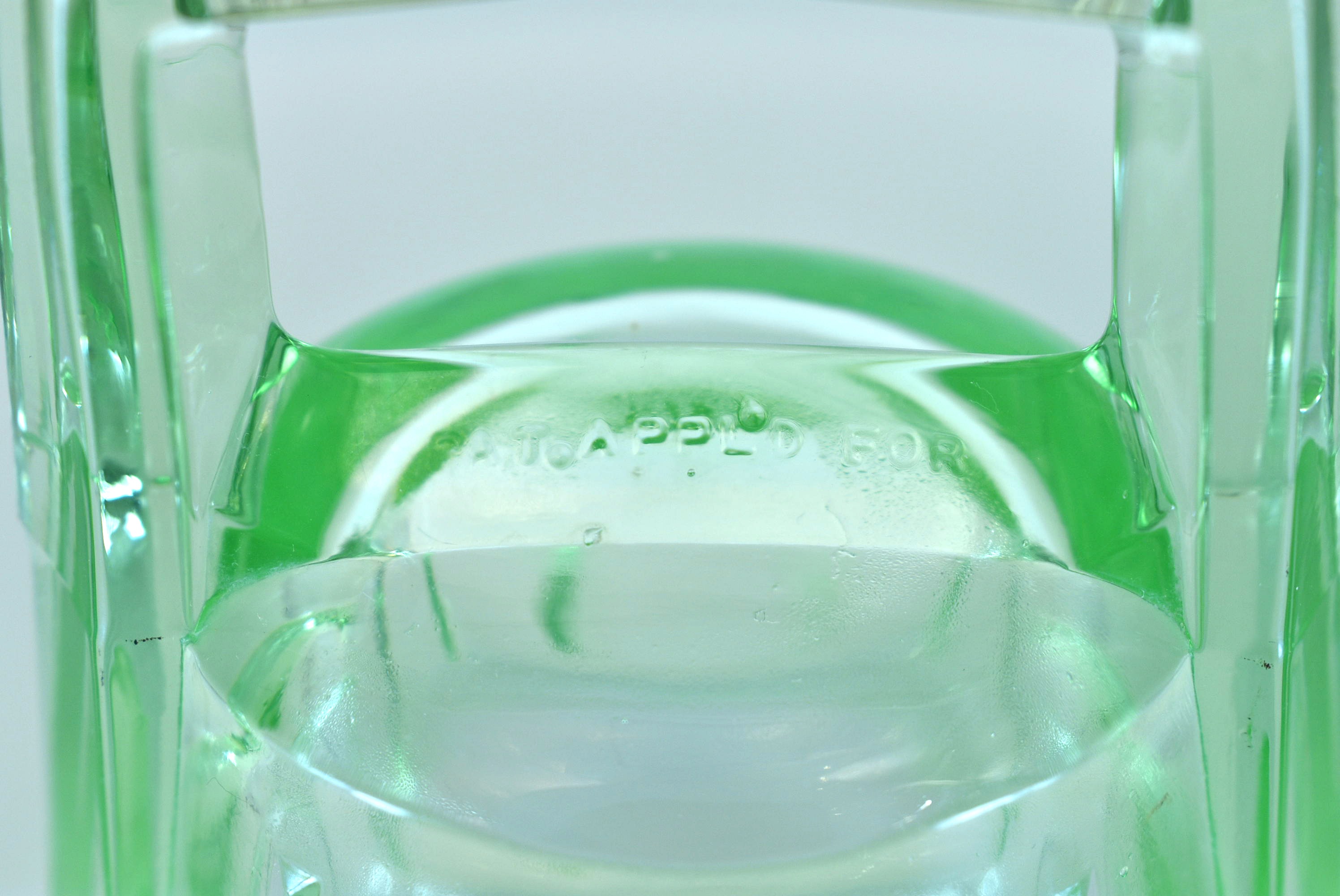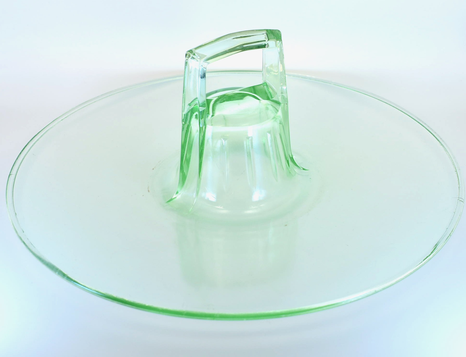 This uranium glass tray (UV reactive) is apparently by Beaumont Glass but is unmarked aside from "PAT APPLD FOR" on the handle. I was able to find one other reference to it on replacements.com but without a price.