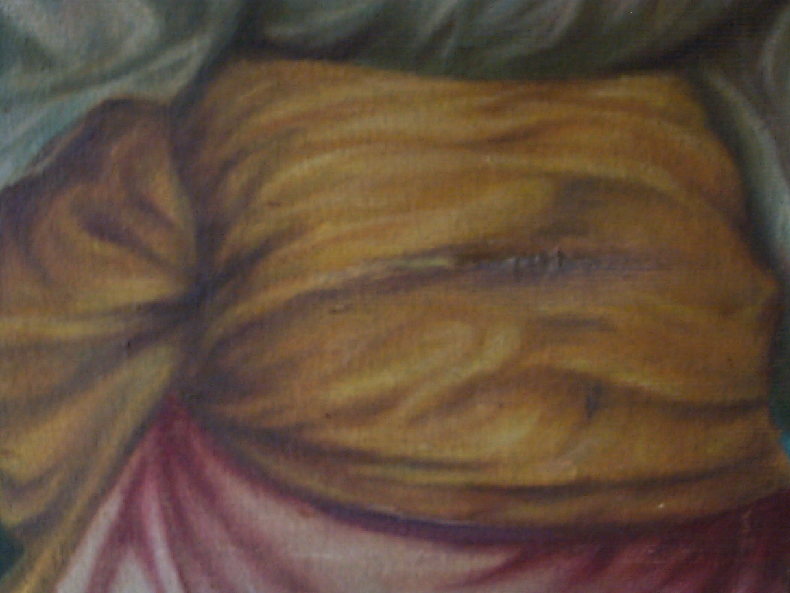 The painting is 6 feet tall and mounted on a wooden frame that resembles an old screen door. The brackets that hold the wood together on the back have a patend date of 1853. The oil painting is on a heavy grained canvas material unlike the painting canvases of today. The detail of the painting is absolutely amazing. The face and hands are flawless. There was a well done repair in the middle of the cumberbun to fix a hole.