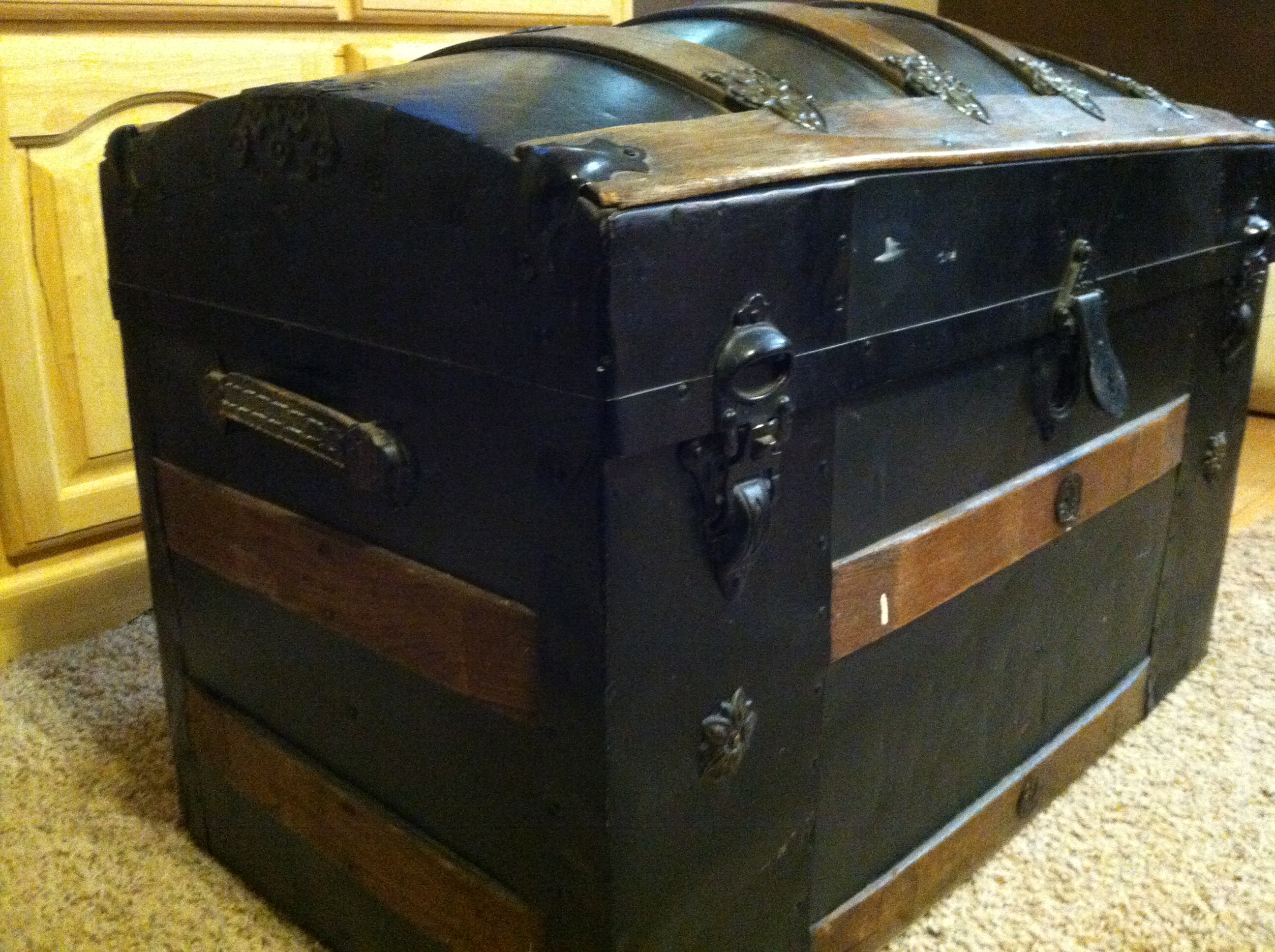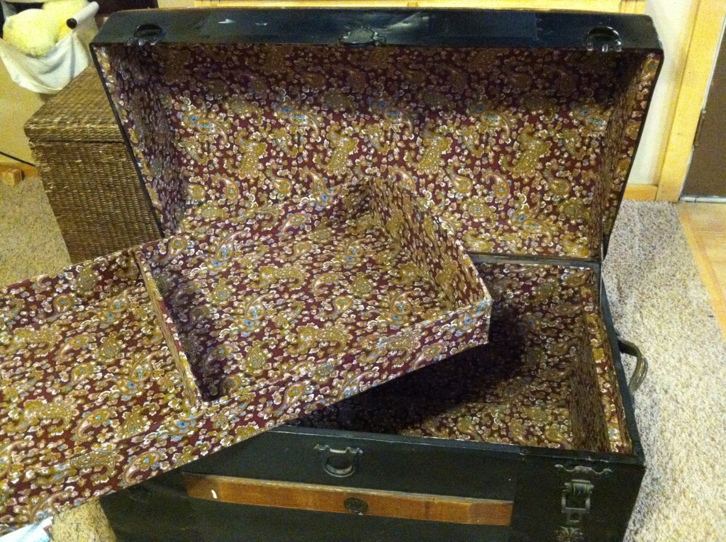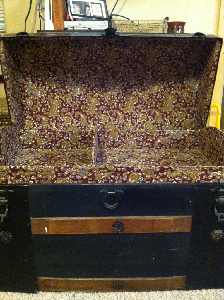 I inherited this antique trunk from my grandmother. I don't know when she obtained it or how much he paid for it. It's in beautiful condition, very few scratches on the outside, and is complete on the interior. It is black with wooden bands and iron (I think) detailing. The interior is lined in a floral pattern and is undamaged. It has one shelf with a partition creating two sections.