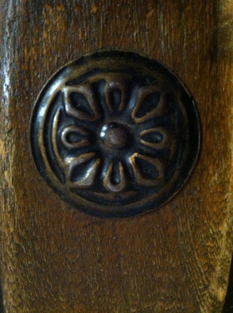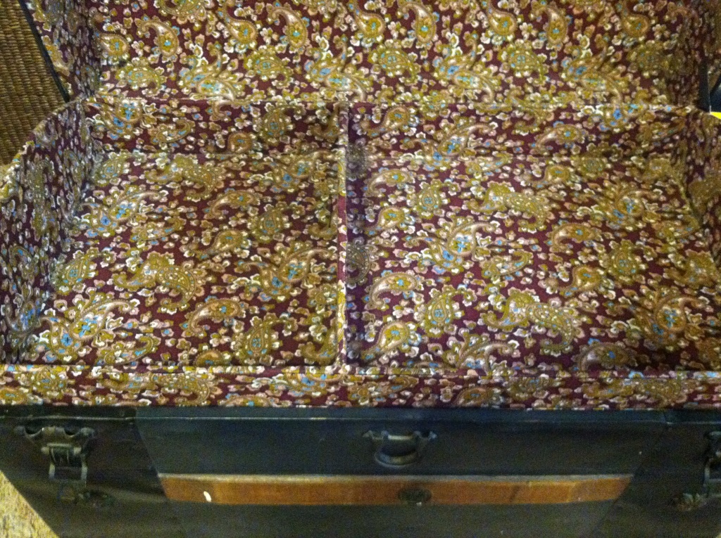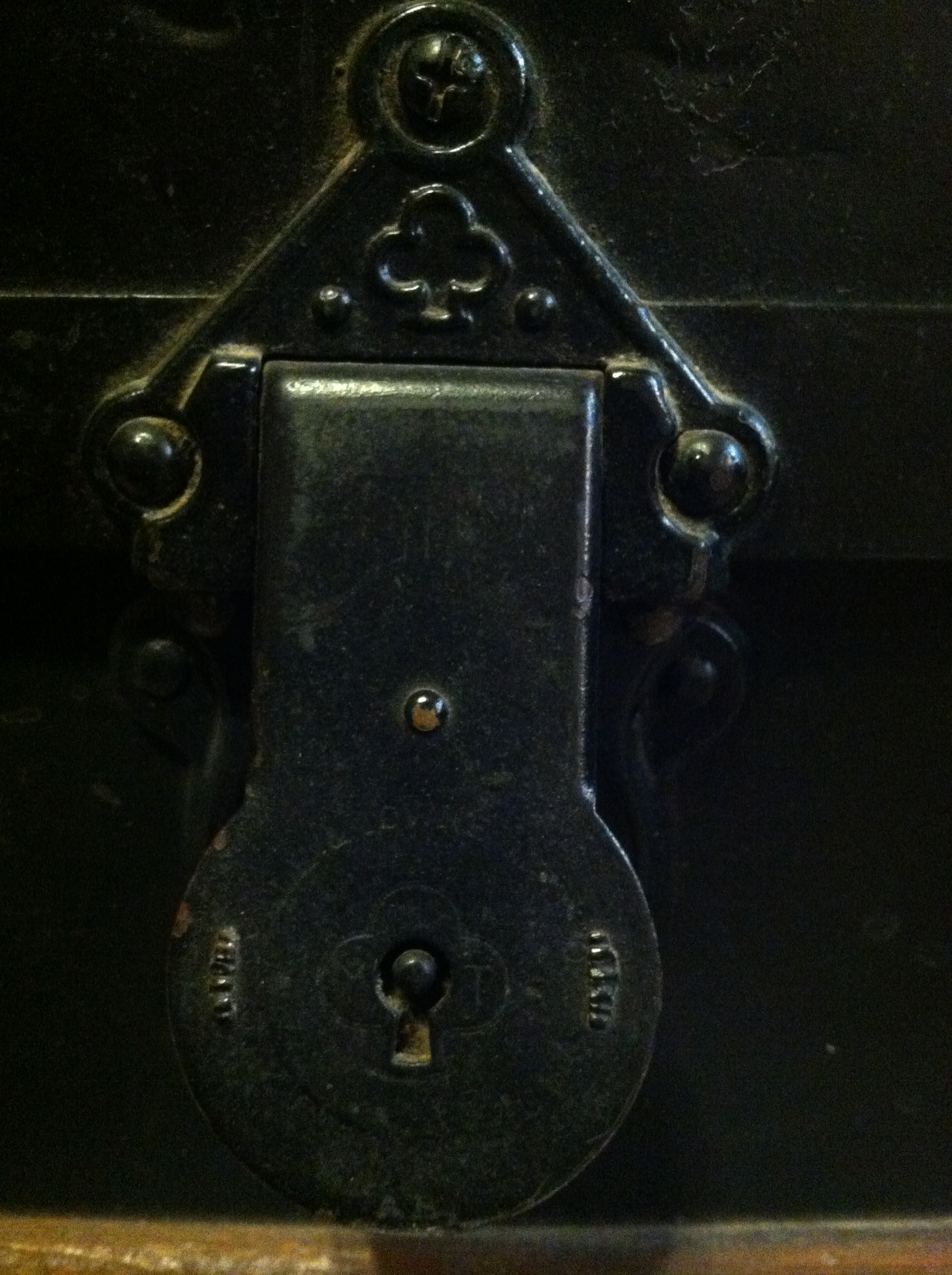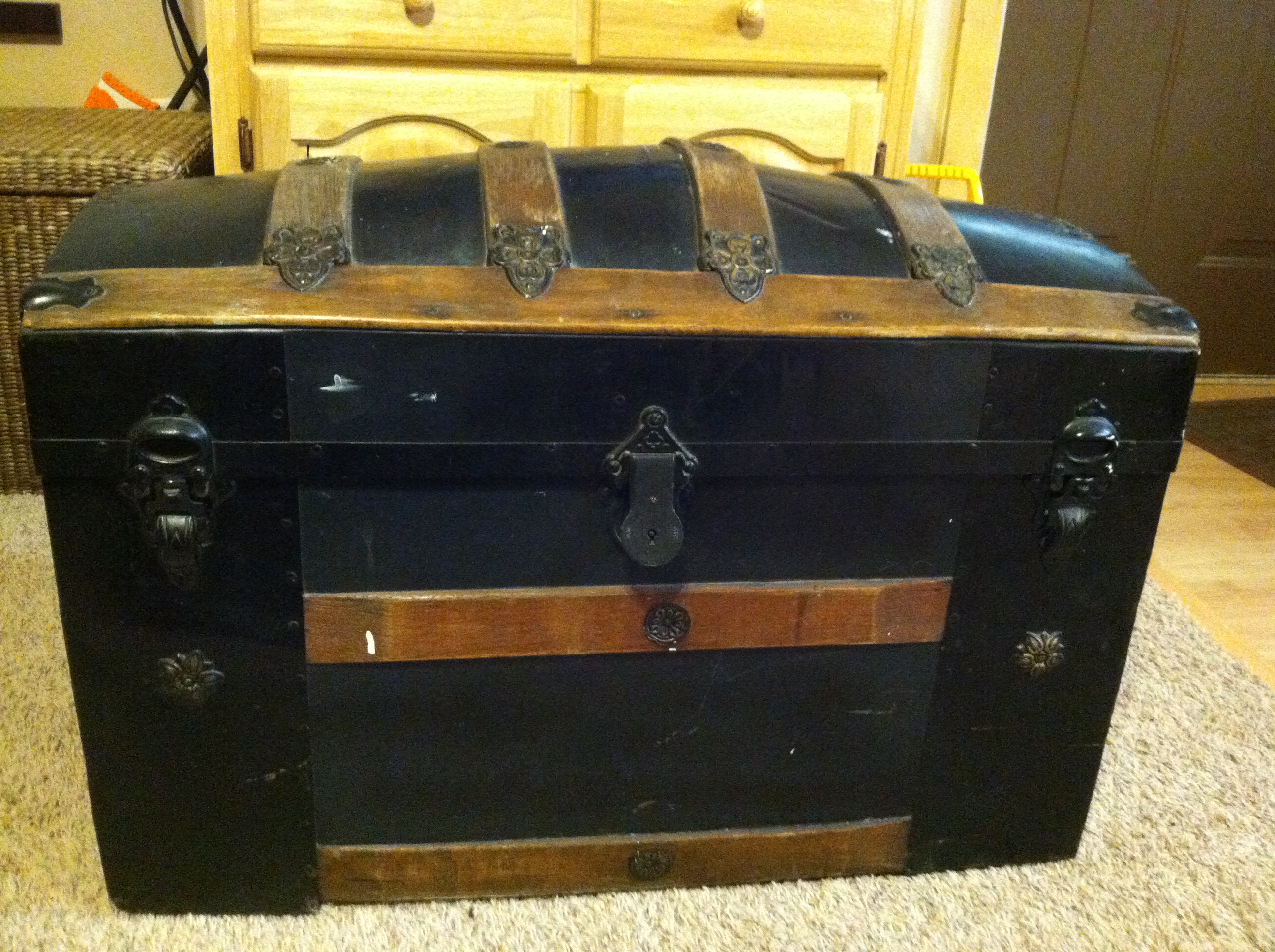 I inherited this antique trunk from my grandmother. I don't know when she obtained it or how much he paid for it. It's in beautiful condition, very few scratches on the outside, and is complete on the interior. It is black with wooden bands and iron (I think) detailing. The interior is lined in a floral pattern and is undamaged. It has one shelf with a partition creating two sections.