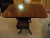 The drop leaves on the sides are supported by brass hardware that locks out to hold up the 2 extra leaves. Thus there are 4 peices of the mentioned brass hardware. On on connection between the drop leaf and the center portion of the table the hardware has split out the wood. Beside a couple small heat stains that are being a pain to get out, This table is in really great shape. Just needs the small structural repair in order to be in really wonderful Mint/antique condition I am almost positive that the table is made from beautful and stained walnut wood. I do note that it is possible that there is more than one type. I want to point you toward the center portion of the table the wood seems to have much much more character in the wood grain. I am thankful for this website. Thank you in advance for any advice and or help.