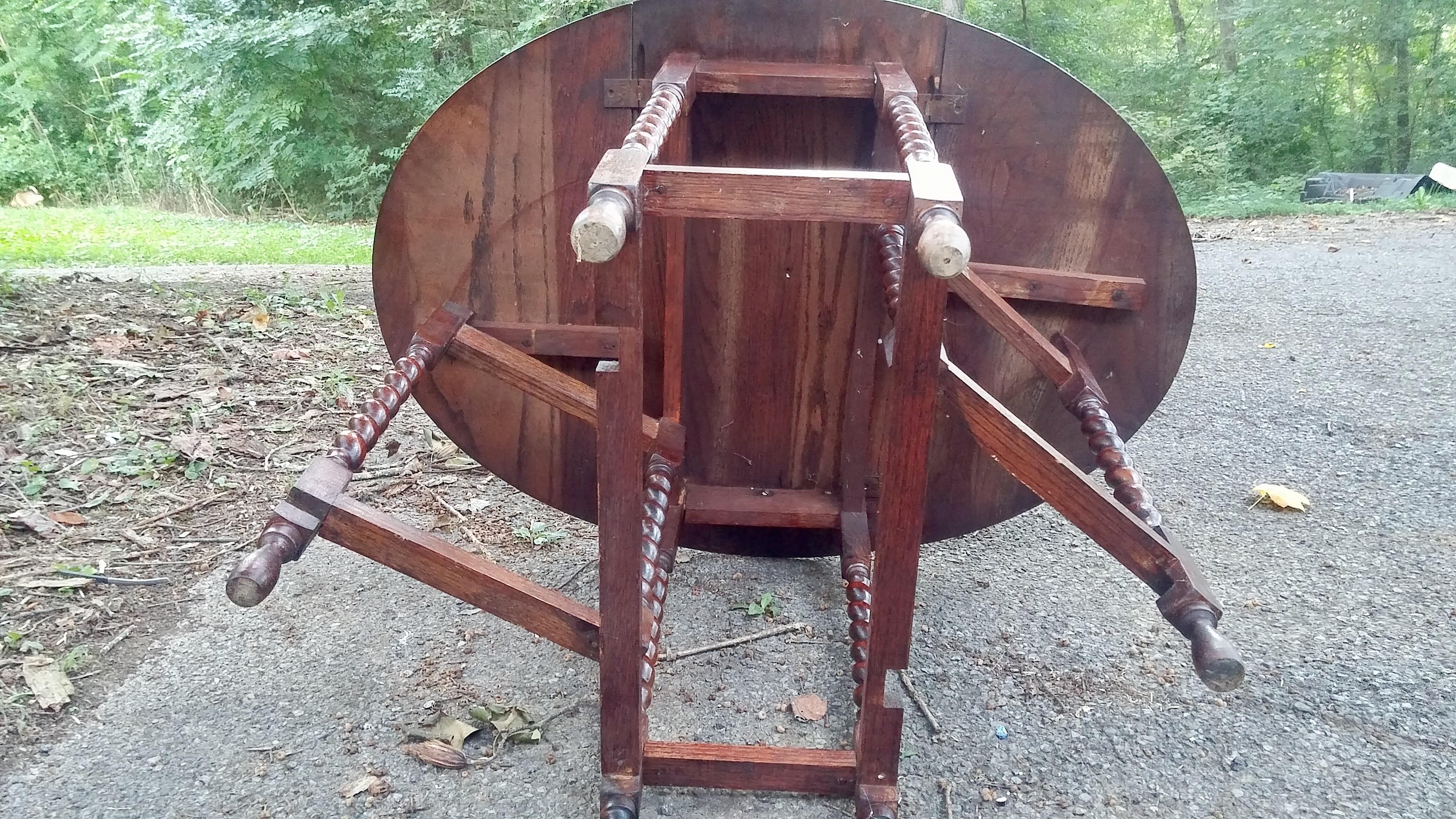 wonderful  gate leg table with beautifulily crafted barely twist legs! Don't ok now too much about it, I do know it is old but not sure how long. Any info would be much appreciated!