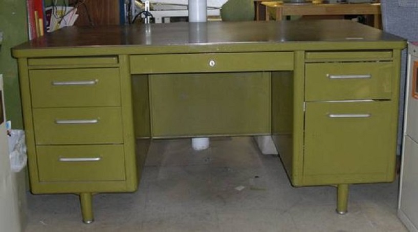 This steel tanker desk boasts serious mid-century modern style. Probably manufactured in the 1950s or 60s. Made to last. Features: 5 drawers, a pencil drawer, pullout writing tablets on each side, and a wood pattern laminate top that overhangs.