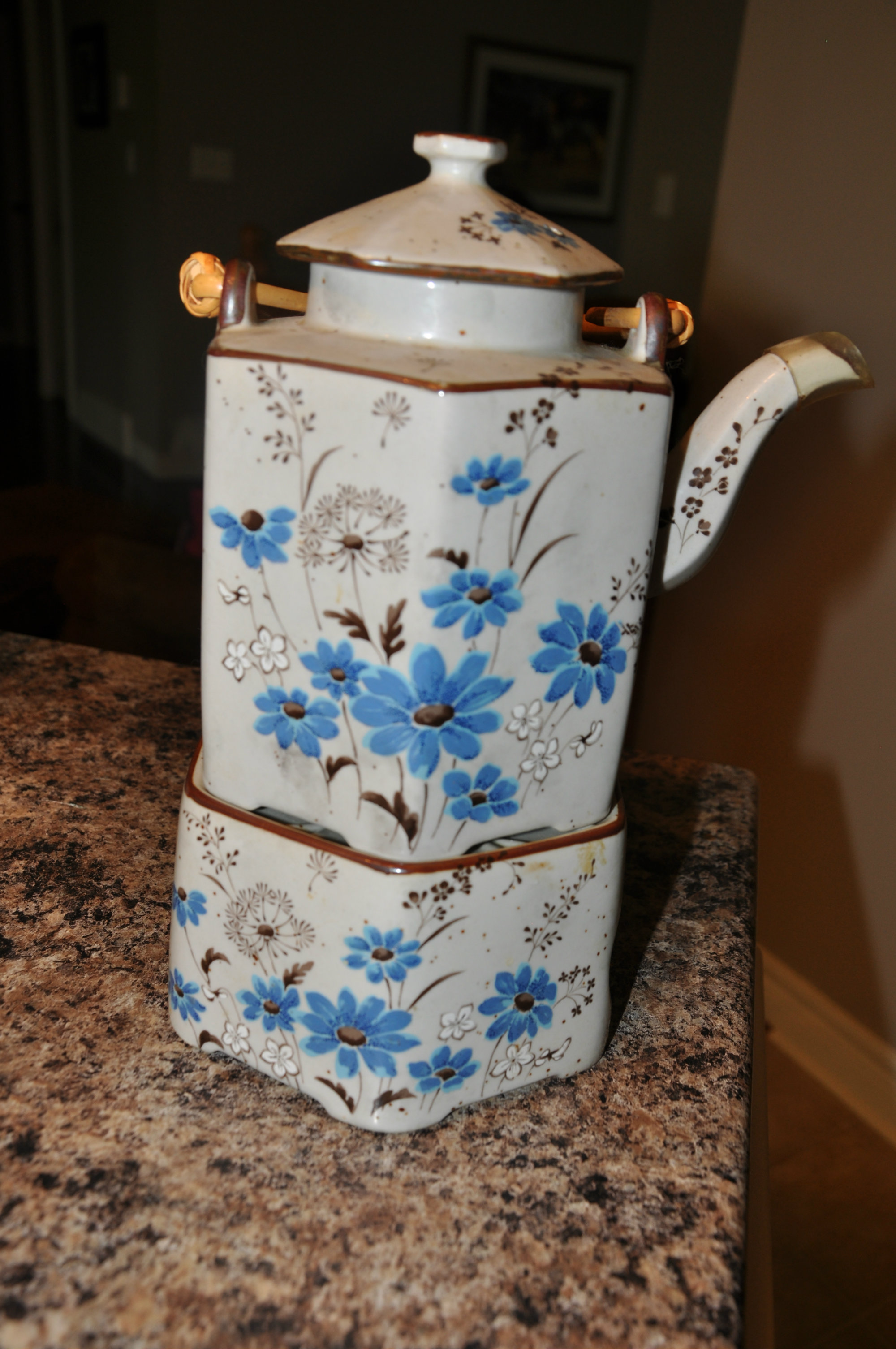 Beautiful Japanese teapot with blue and brown flowers.