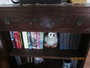I paid $50 for this old bookcase at a consignment shop. The owner of the bookcase had not paid his rent for some time, I made an offer of $50 to the store owner. The bookcase had mold on it and was pretty sad looking. She accepted my offer and a gentleman came running over to us saying we couldn't have the bookcase. The shop owner told him that he broke his contract by not paying his rent and the bookcase was hers to do with as she wished. He followed us out of the long driveway yelling at us but we didn't stop. I cleaned the mold off of the bookcase and I just love it. It has the painting on the drawer and has fancy medal pieces at the top and on the legs. I tried to get the best pictures I could.