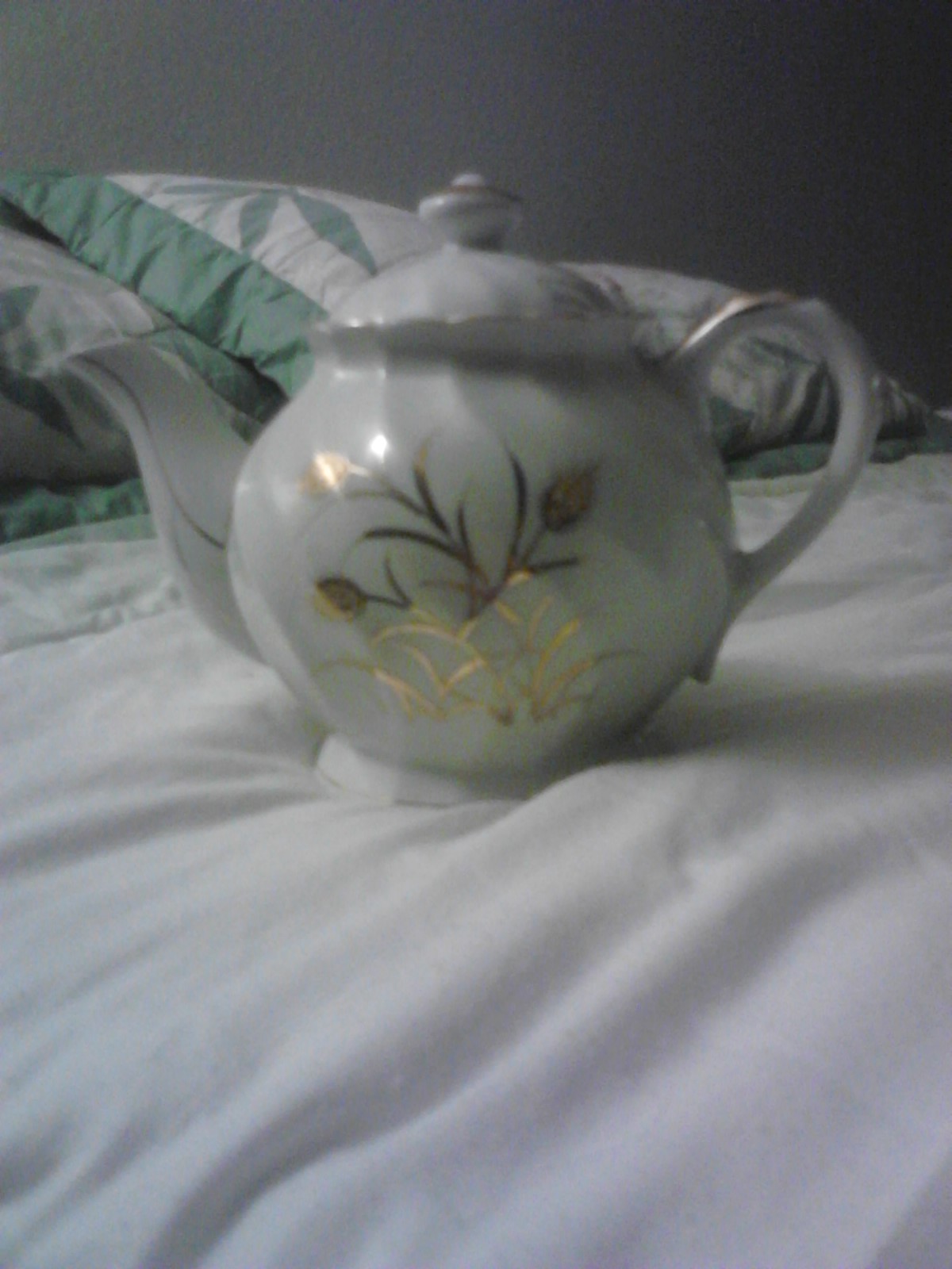 This is a beautiful white teapot with handpainted gold cattails. There is no stamp or anything on the outside bottom however, on the inside on the bottom there seems to be some kind of raised design. Am very curious about this piece, any help would be great.