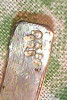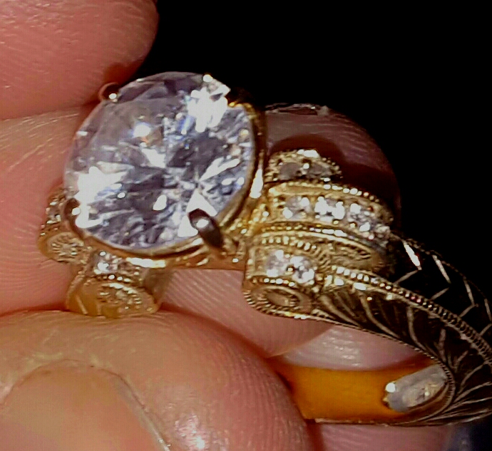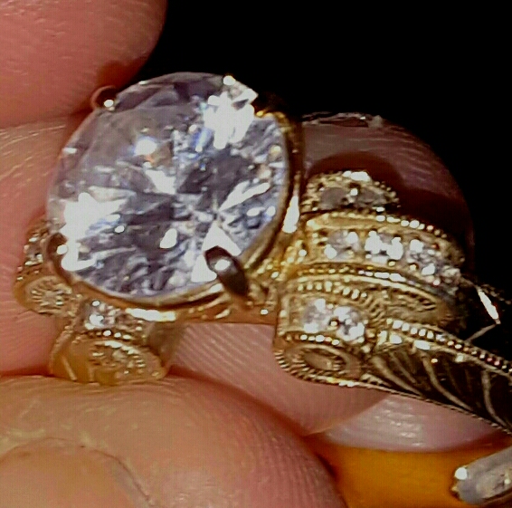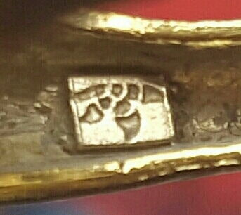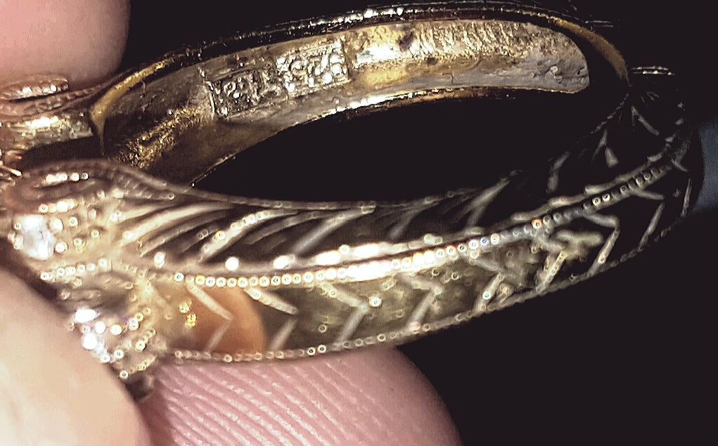 Cathedral mounted, old European cut, real diamond, wedding/engagement ring (?) 925 silver, gold plated, appears hand crafted, hallmark or makers mark of a half sun inside it, the only other place I've seen this symbol is on an ancient Byzantine artifact cross I saw online recently. The band itself reminds me of a lyre/harp, yet also reminds me a laurel pattern.