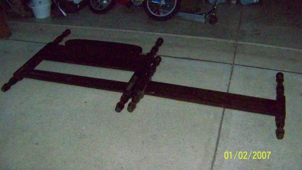 This bed was my grandmother's. It is walnut in color and in very good condition and has wooden side rails.