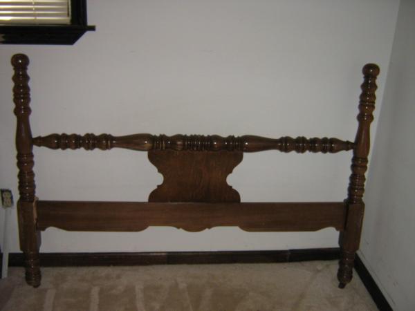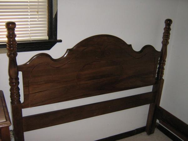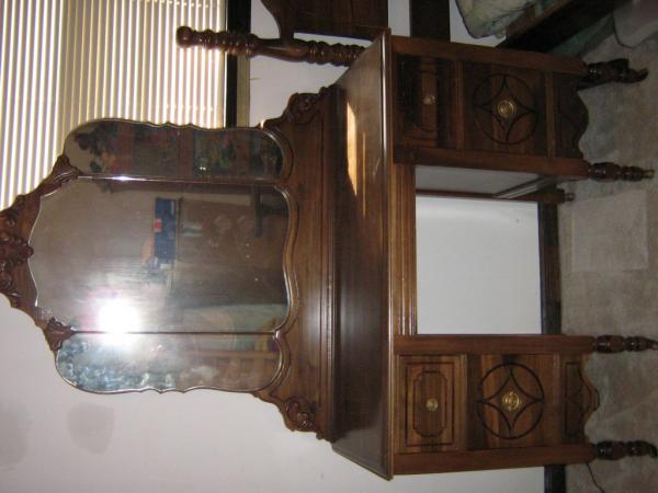 Bed Has short post. Dresser has a shaped mirror out of 3 pieces of glass. Drawers on each side with opening in middle to sit.