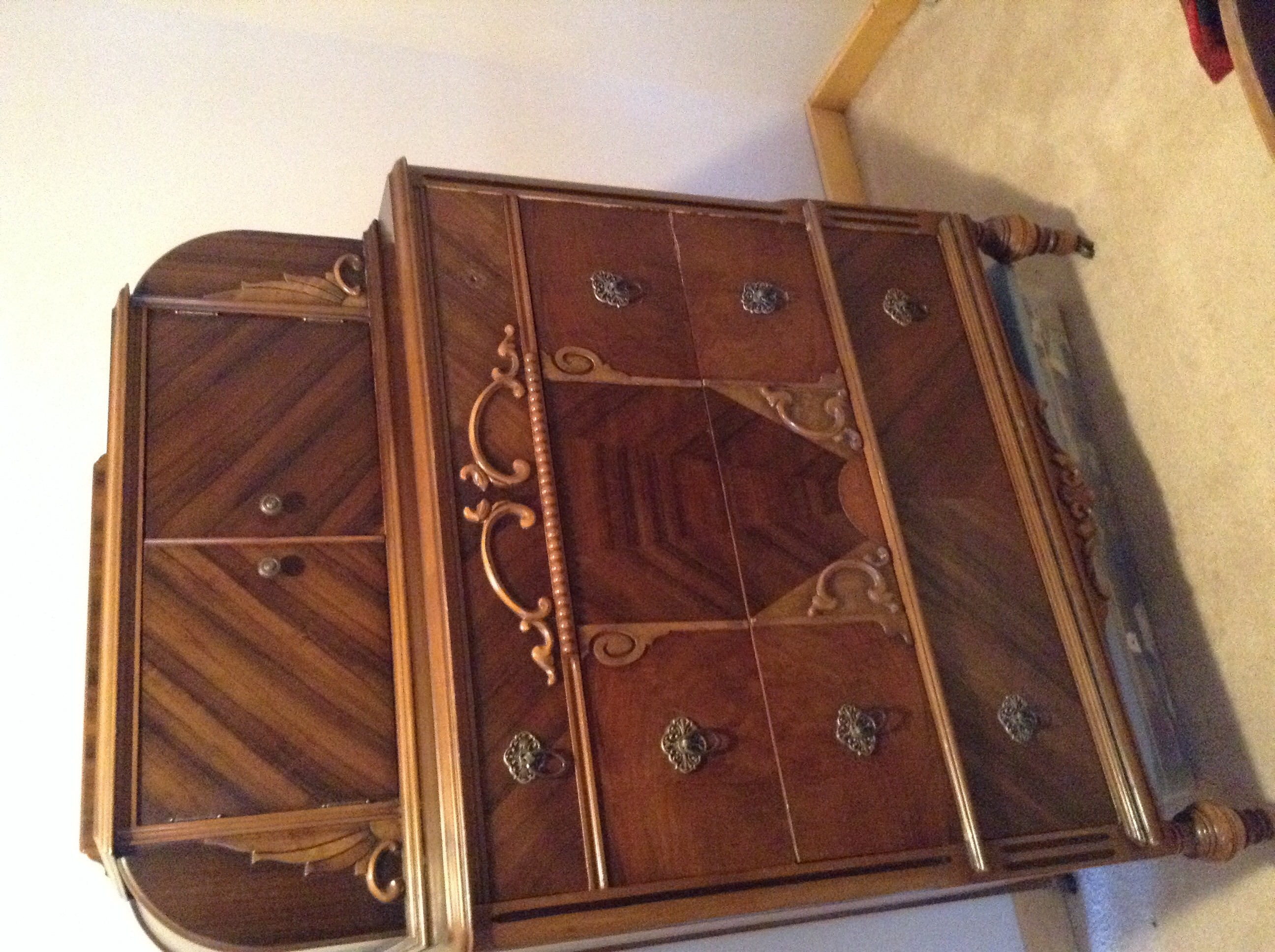 Suites like this tend to date from the mid 1920's through the mid 1930's, at which point the Great Depression forced many furniture companies to go bankrupt. There is not currently a big demand for furniture like this, we often see whole suites in good condition selling for under $500.00 at auction.