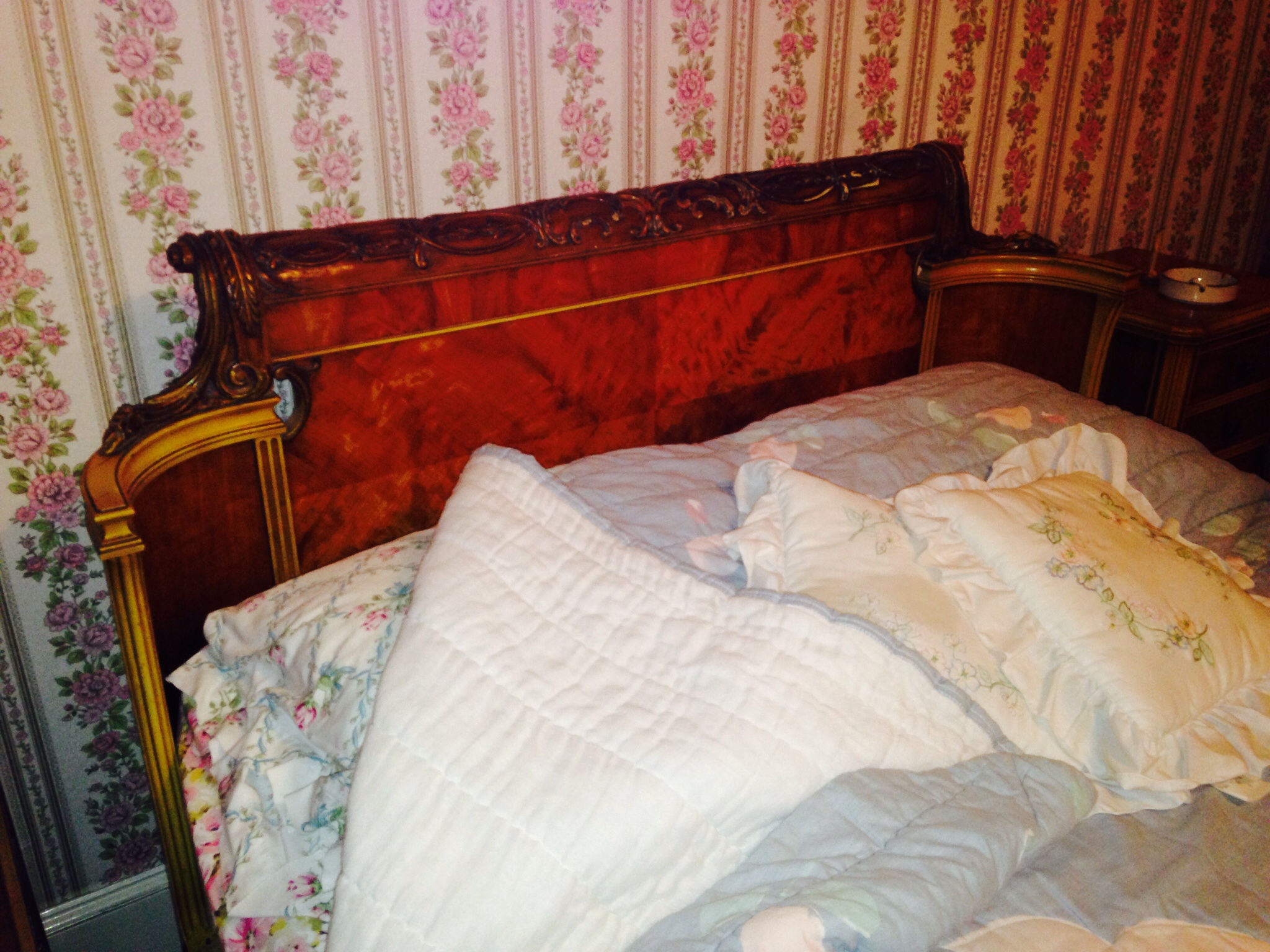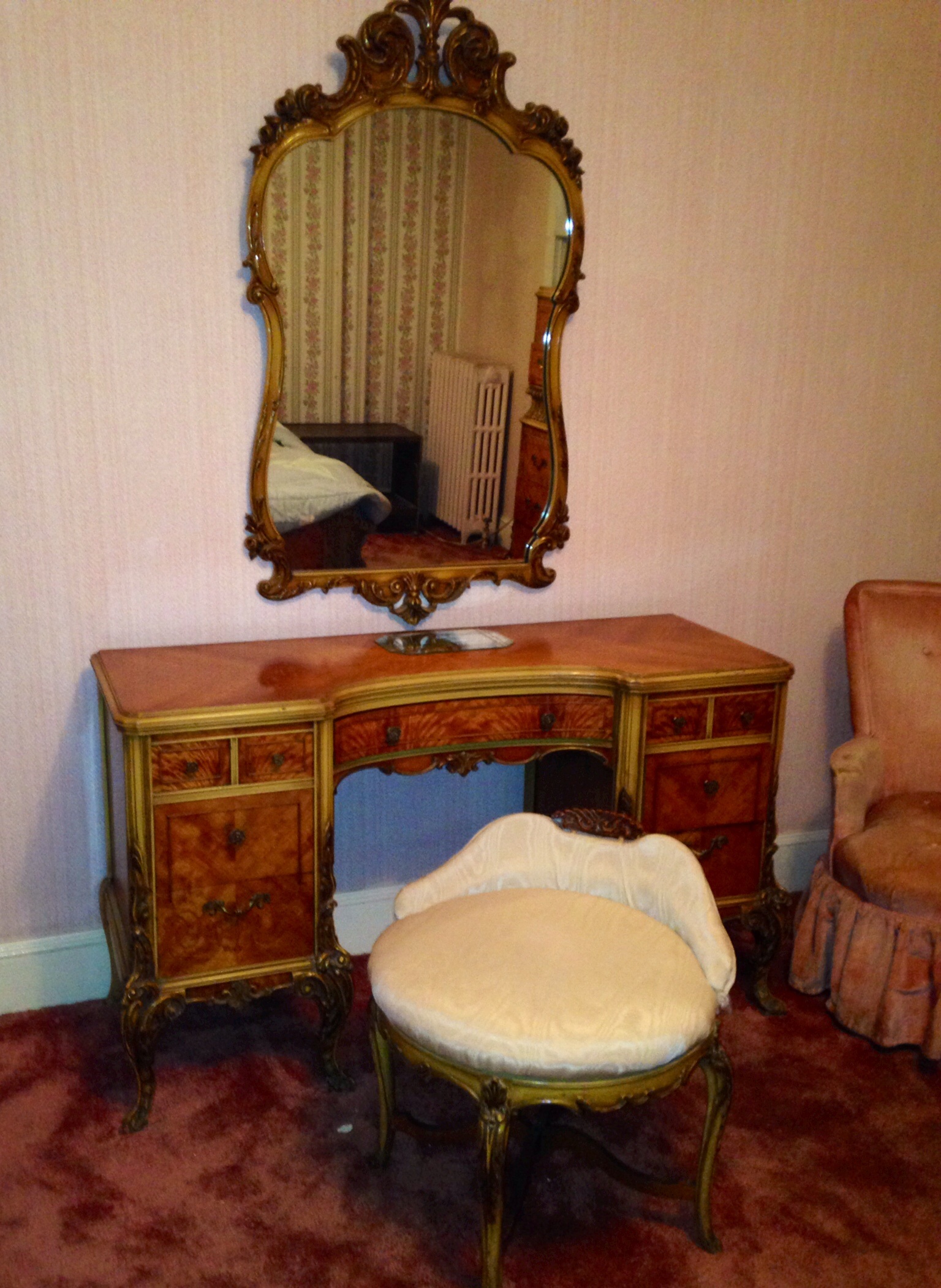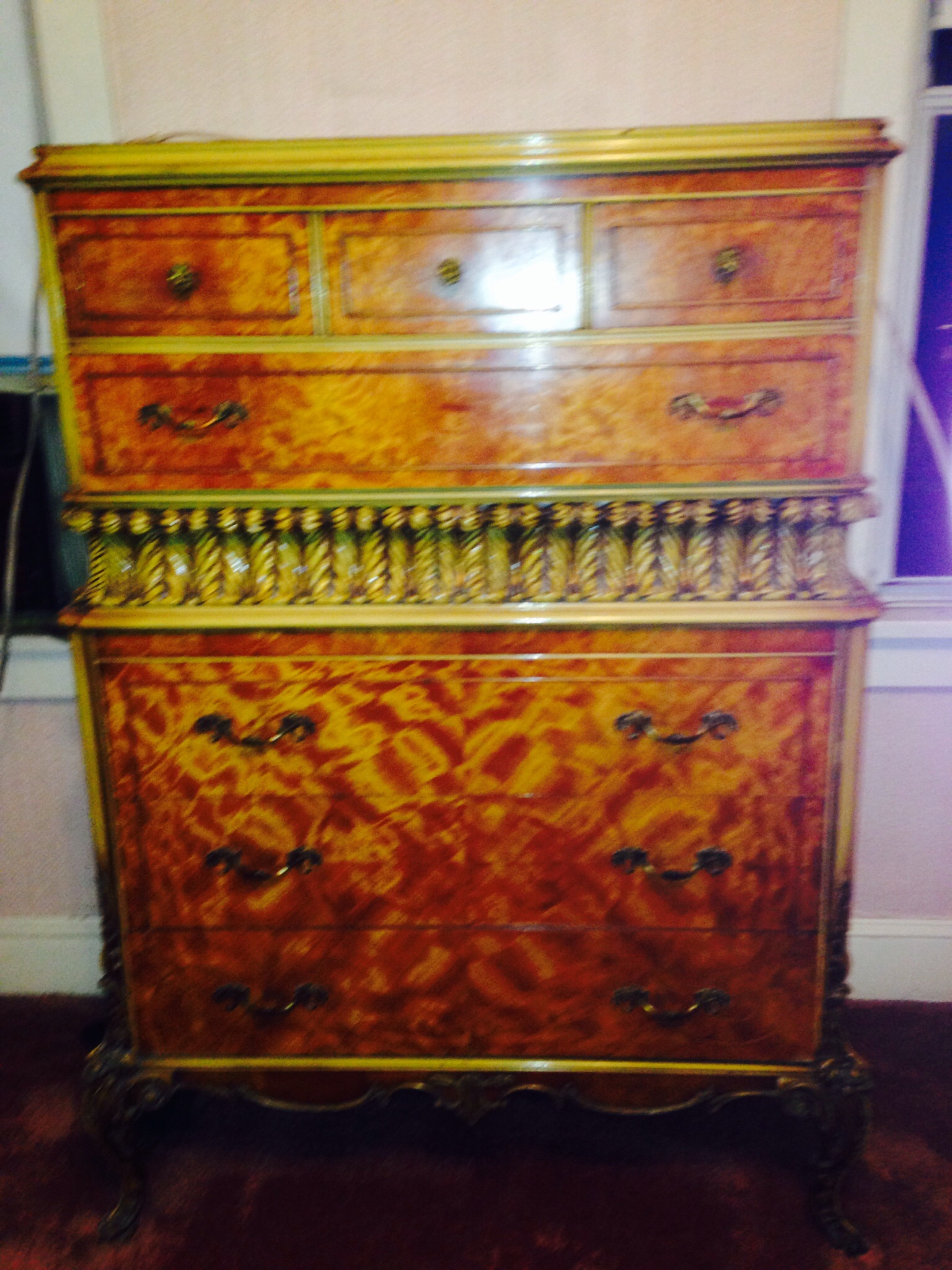 This bedroom set was in house I purchased. It is in perfect condition and is beautiful.  I want to know type of furniture (Art Deco, etc) and wood type because I have no idea.  Also wouldn't mind knowing value.  Thanks pam
